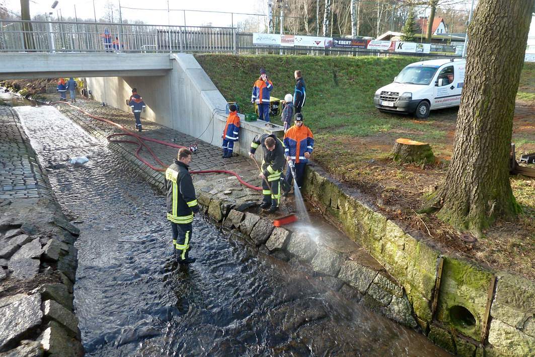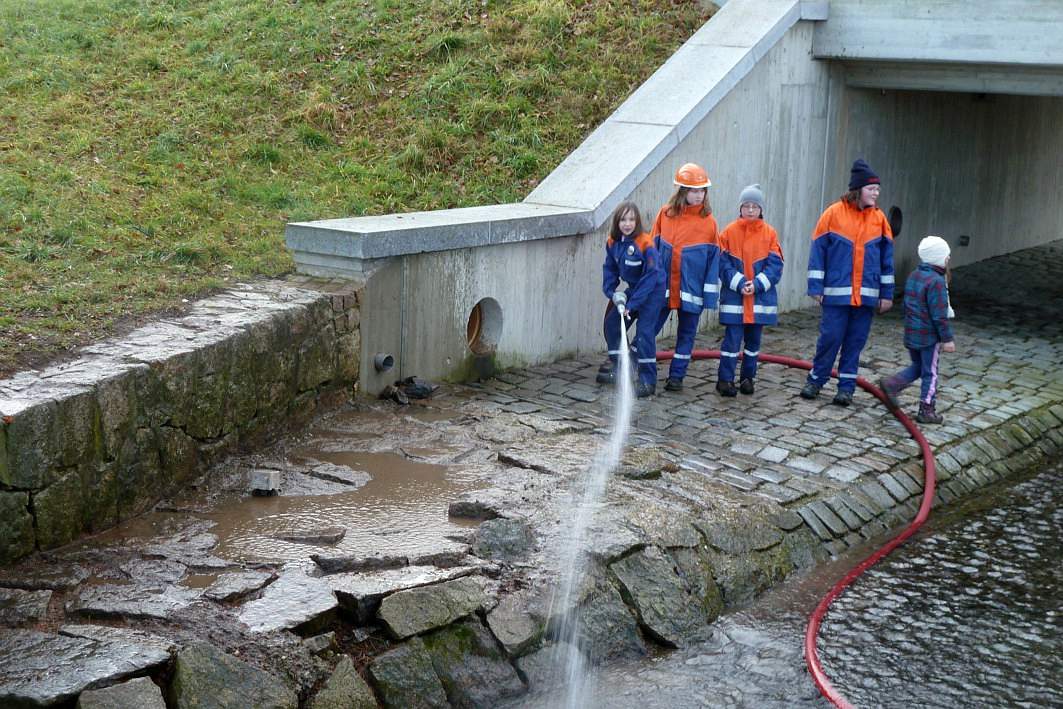 Die Jugendfeuerwehr nutzte einen Einsatz, um den Randbereich des Wehres abzuspritzen.