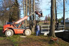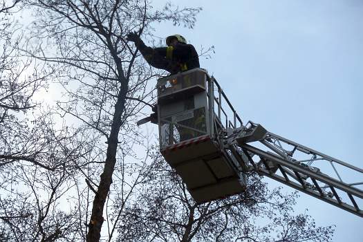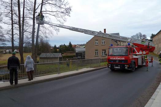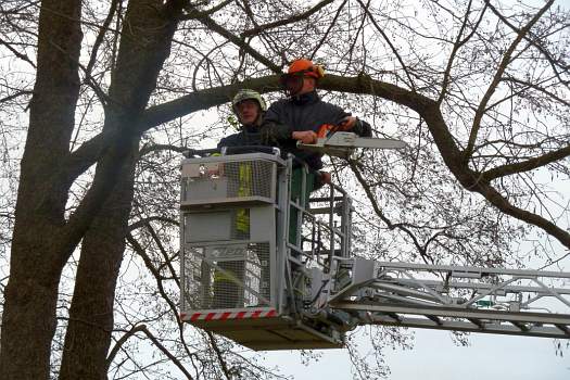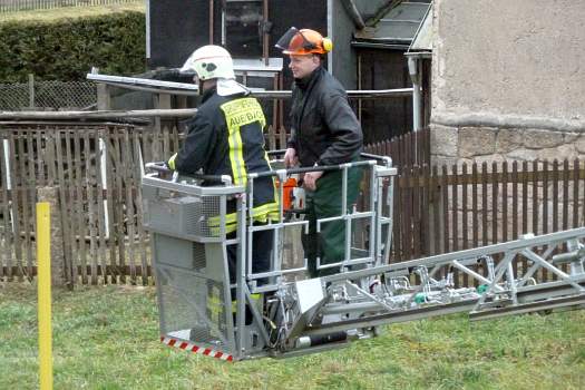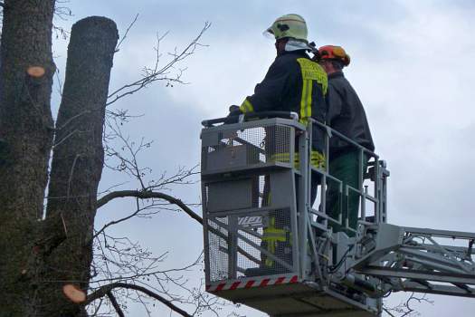 Sie halfen mit ihrer großen Drehleiter aus, damit die Bäume in luftiger Höhe abgeschnitten werden konnten.