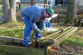 Die Teile der alten Wehranlage wurden zur Restaurierung abgebaut. Schlossermeister G. Stich wurde dabei vom Ortsvorsteher und Mitgliedern des Heimatvereins unterstützt.