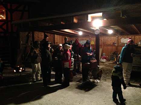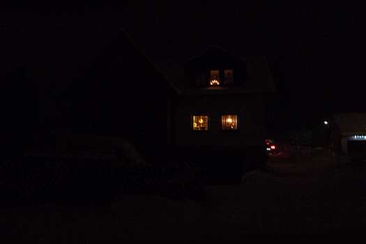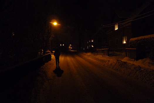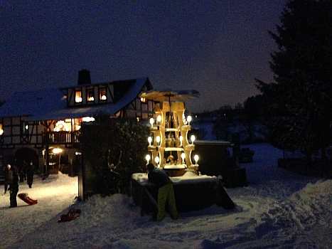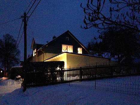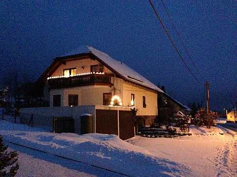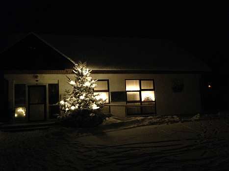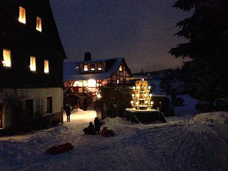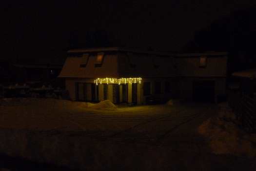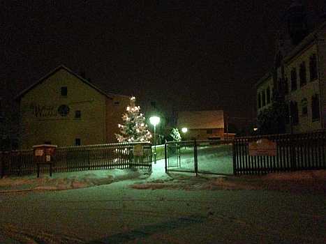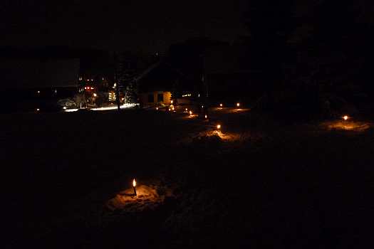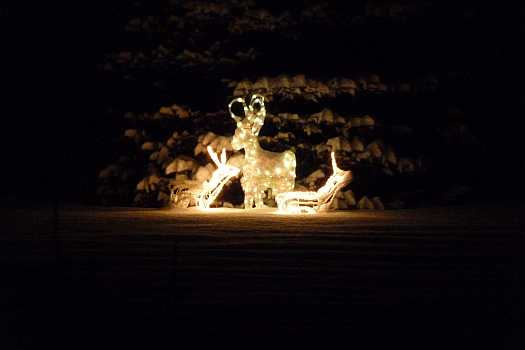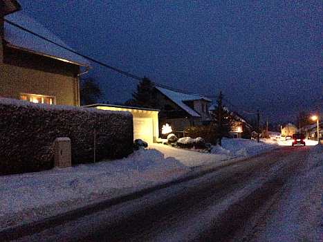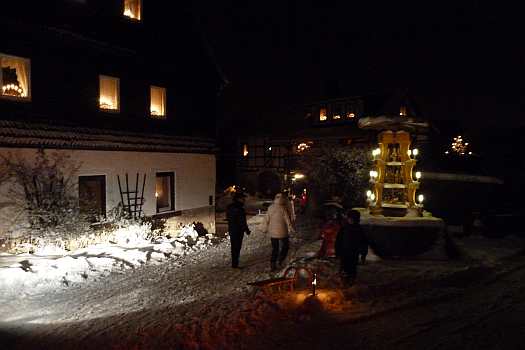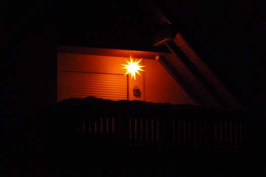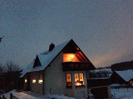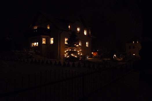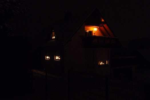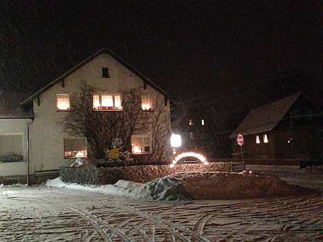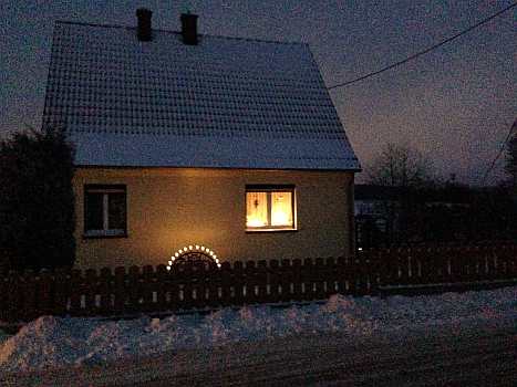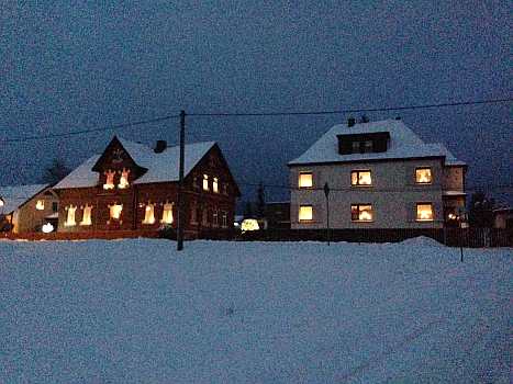 Sie zeigen die herrliche Beleuchtung in der Fenstern und Vorgärten und außerdem noch von Winterfesten im Ort.