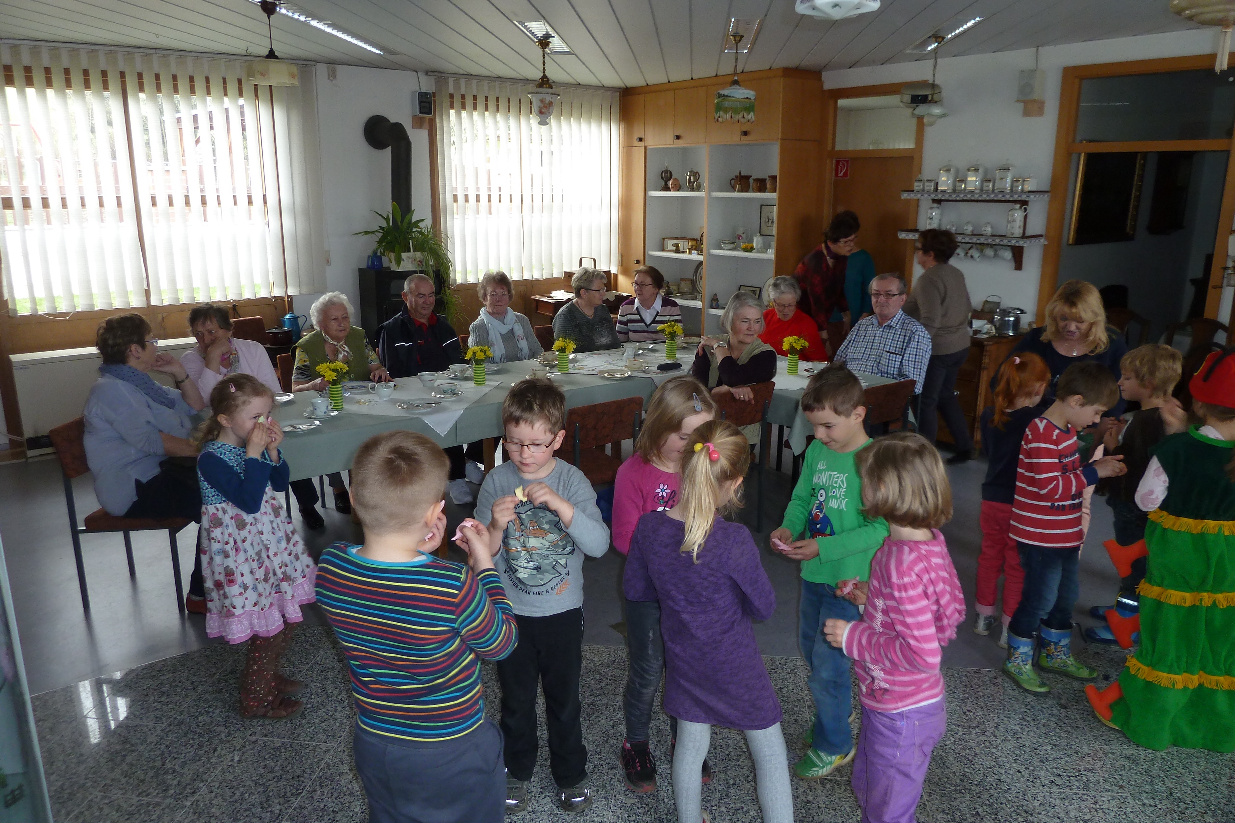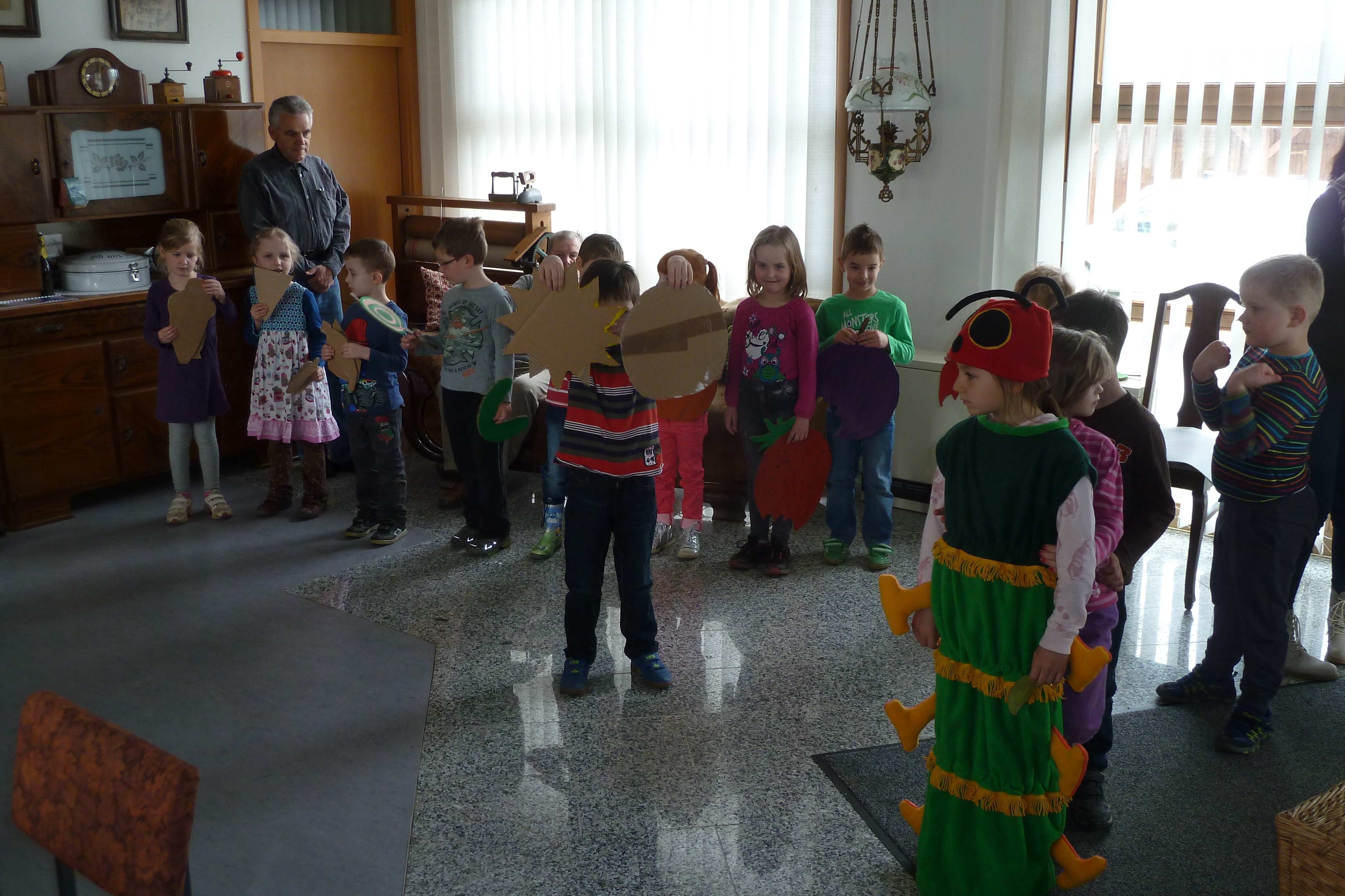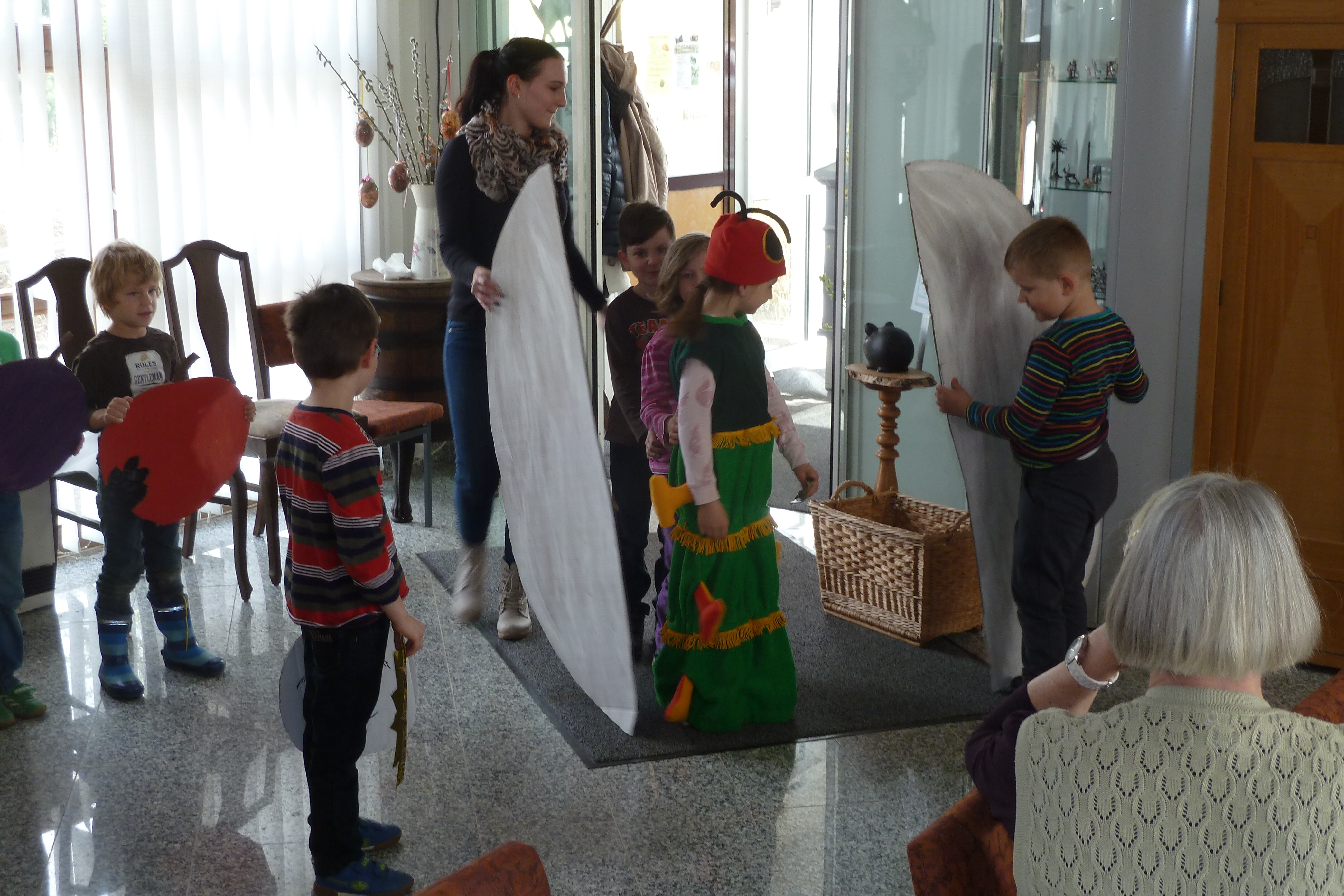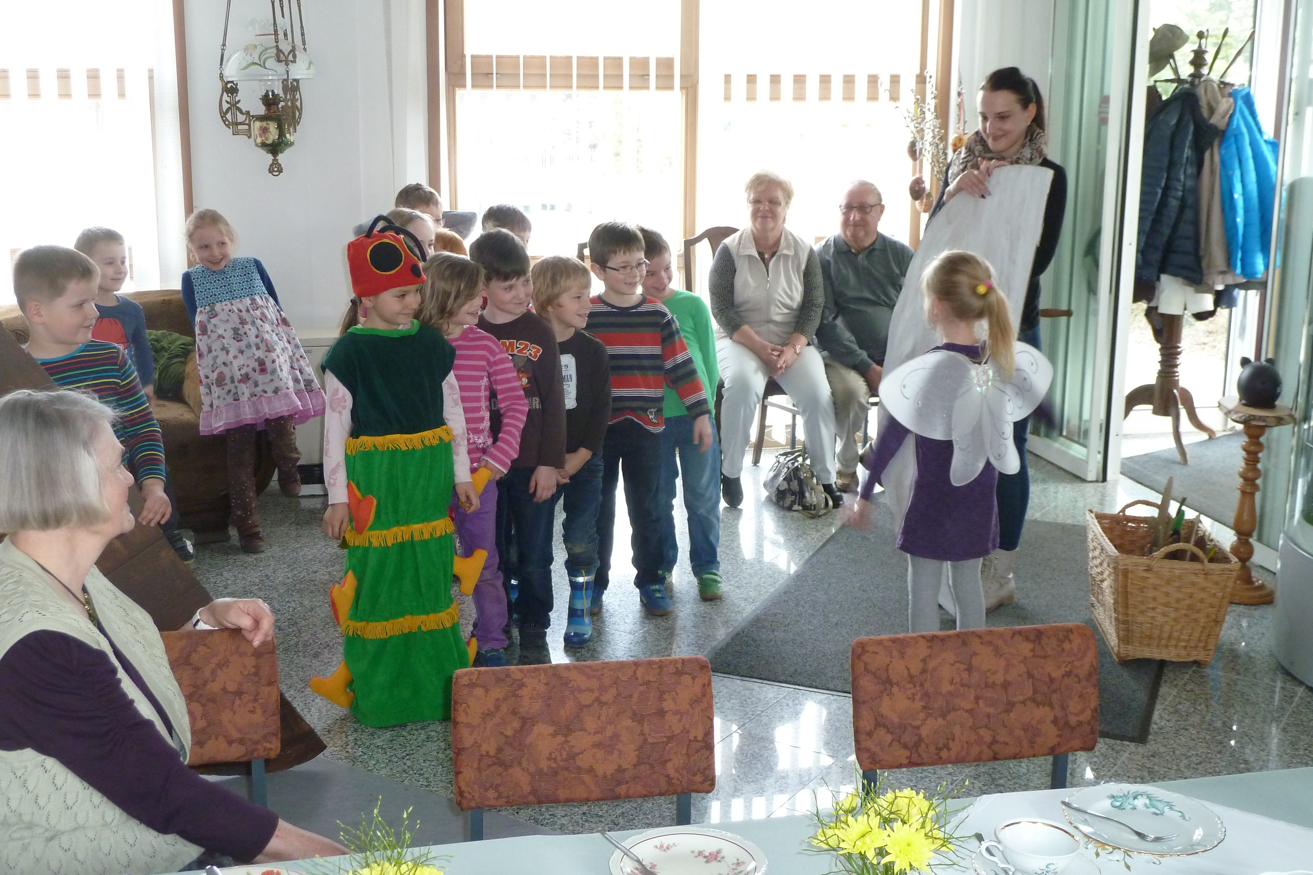2015 hatten wir im Heimatverein begonnen, für die Senioren ein sogenanntes Seniorenquartalskaffeetrinken, zusammen mit dem Kindergarten einzuführen. Am 7. April 2016 wurde diese schöne Tradition nun fortgesetzt. Die Kinder des Kindergartes zeigten sehr anschaulich, wie sich eine sehr gefräßige Raupe in einen wunderschönen Schmetterling verwandelt. Nach der gemütlichen Kaffeerunde gestaltete Christiane Fankhänel aus Treuen ein Programm, welches zur Jahreszeit passte.