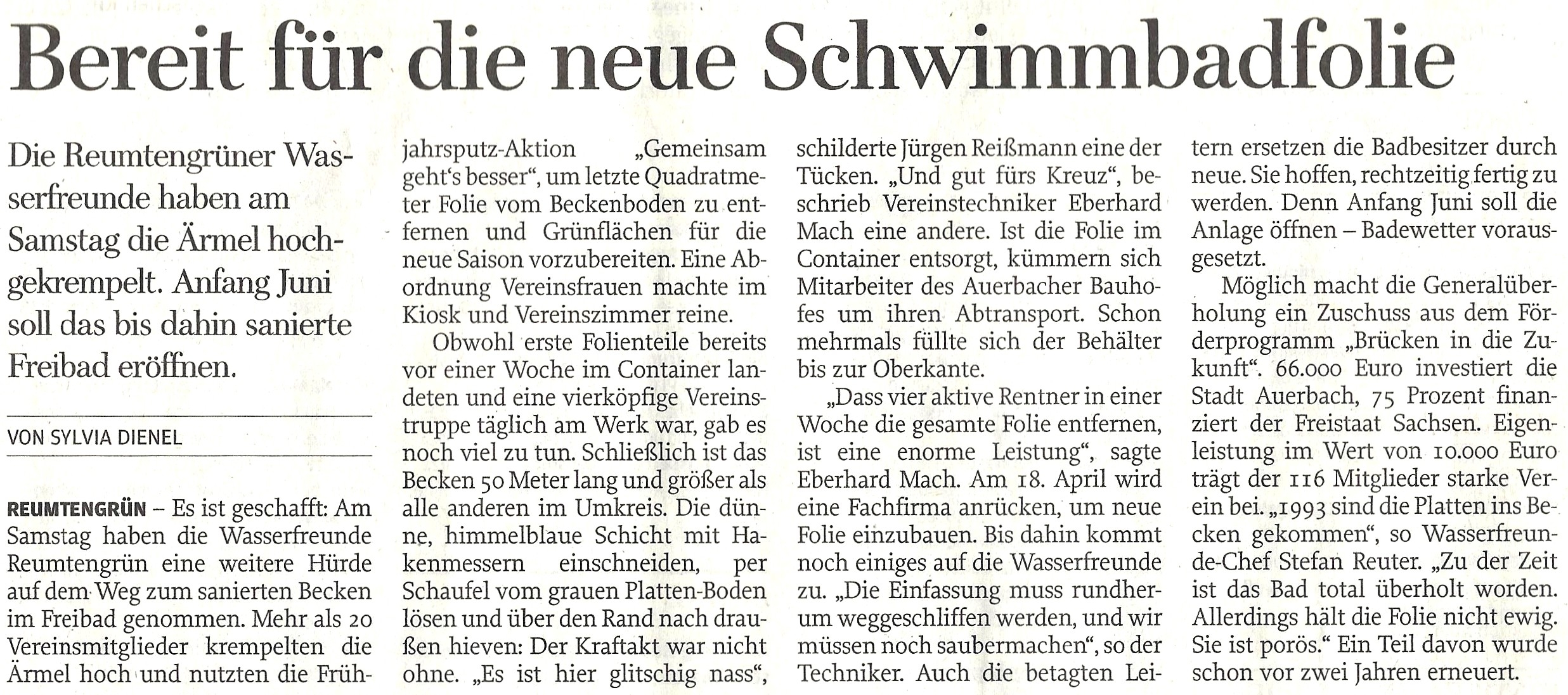 Für den Arbeitseinsatz am 8. April im reumtengrüner Bad wurden viele kräftige Helfer gesucht. Es sollte die alte Folie aus dem Becken entfernt werden.