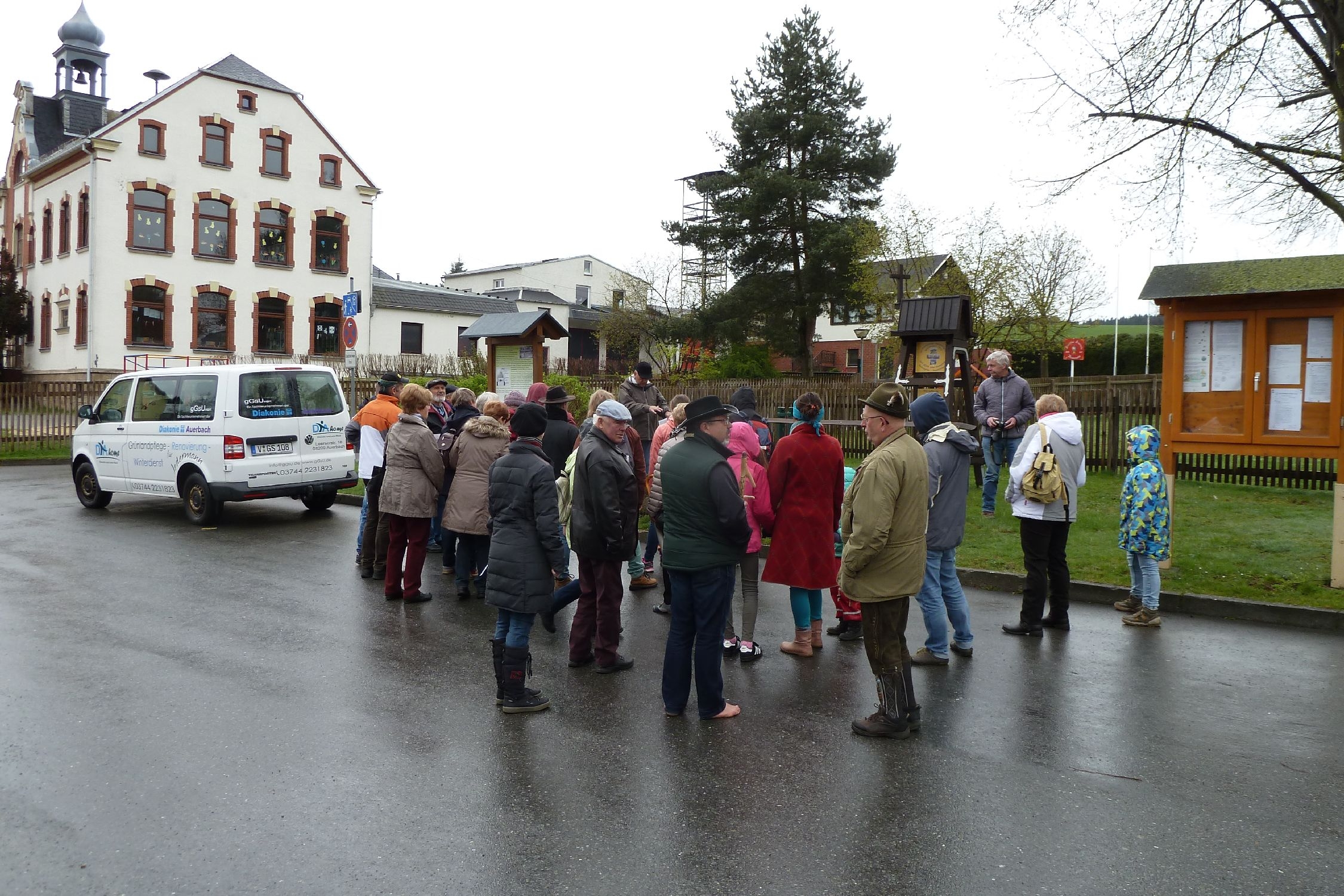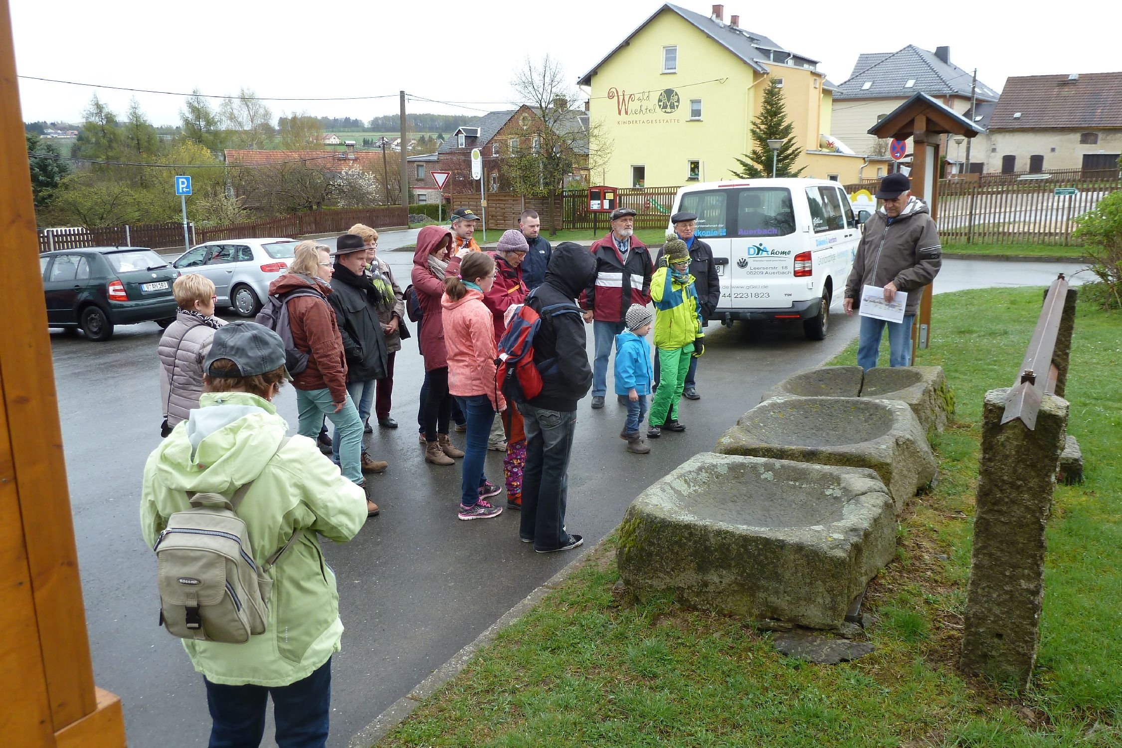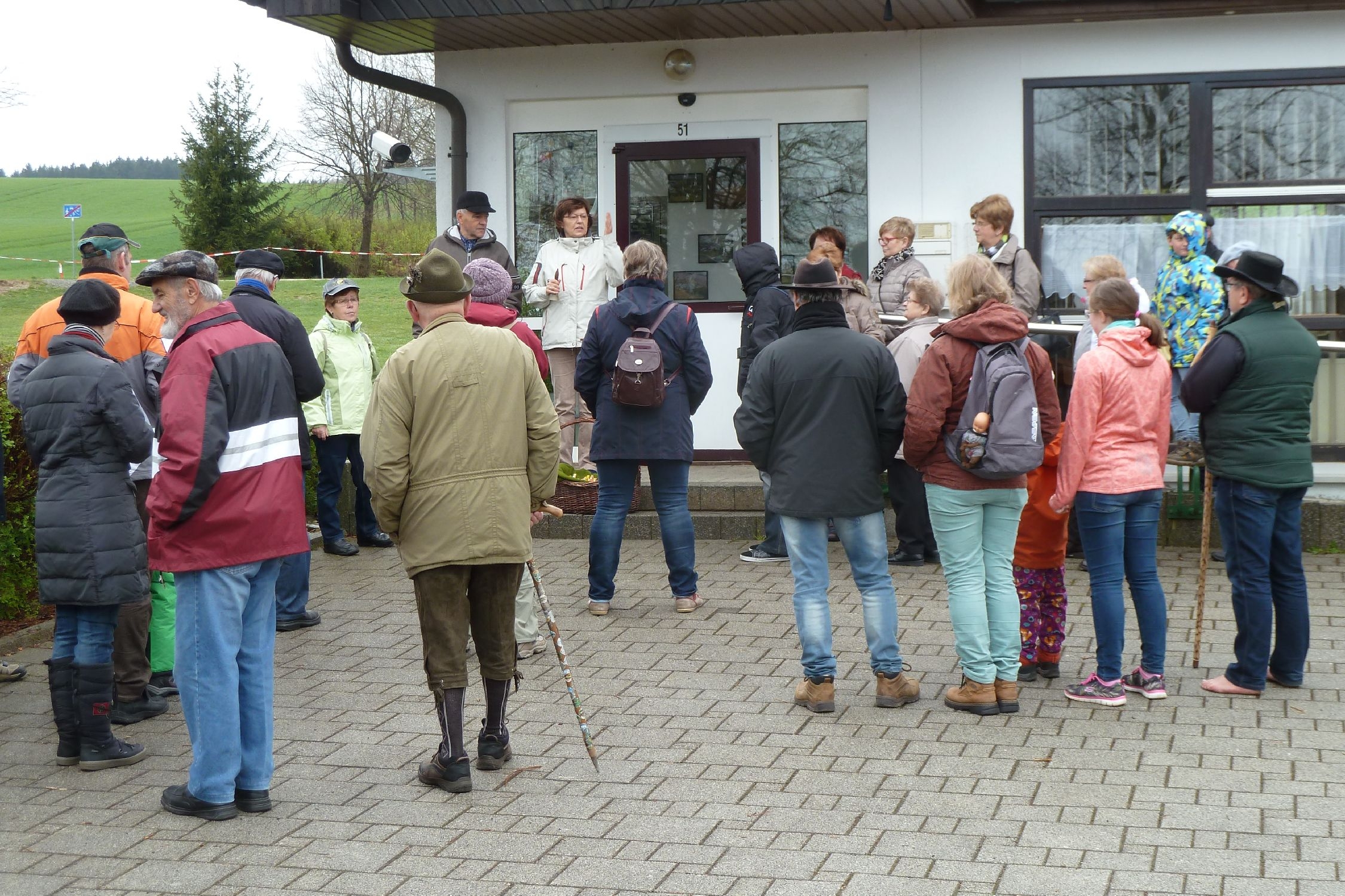 April, April, der weiß nicht was er will, mal Regen und mal Sonnenschein, dann regnet’s wieder zwischendrein…. So wurde das Wetter in diesem Jahr für das Osterwochenende vorhergesagt. Da die Heimatfreunde für Ostern wieder eine Wanderung geplant hatten, wurden ständig die Wettervorhersagen geschaut. Für den Ostermontag gab es nun Plan A, B oder C , um je nach Wetterlage reagieren zu können. Letztendlich kam Plan B zum Einsatz. Dies bedeutete eine verkürzte Wanderung mit anschließendem Grillen am Heimatverein und dem Kaffeetrinken wie gewohnt in der Heimatstube. Trotz des unbeständigen Wetters schlossen sich ca 35 Wanderfreunde dem Wanderführer an. Ab Heimatverein ging es über den Steig zur ersten Station, der ehemaligen Knochenmühle. Unweit dieser konnte noch auf die damaligen Halden der Wismut verwiesen werden. Als Nächstes wurde auf die Historie des nicht mehr existierenden Gasthof Geßner verwiesen. Dieses Areal wird jetzt von der Agrar GmbH genutzt. Am Winkelmanns Weg konnte auf dem neuen Panoramabild ein Blick auf das weitere Vogtland und das Erzgebirge geworfen werden. Durch den Wald ging es wieder in Richtung Heimatstube. Die Wanderung dauerte ungefähr 2 Stunden und es hat in dieser Zeit nicht geregnet! Mit Rostern und später bei Kaffee und selbst gebackenen Kuchen konnte sich noch gestärkt werden.
