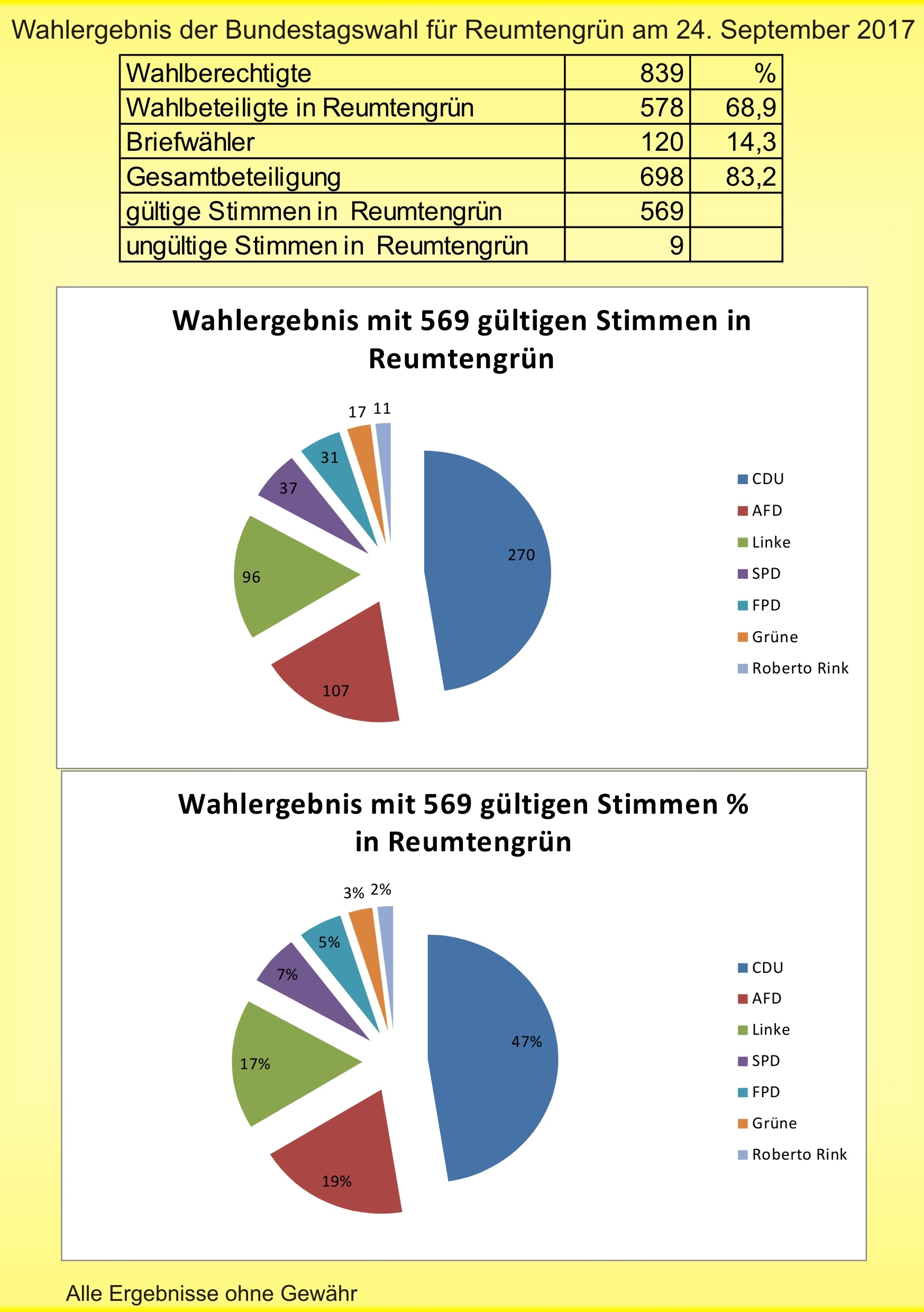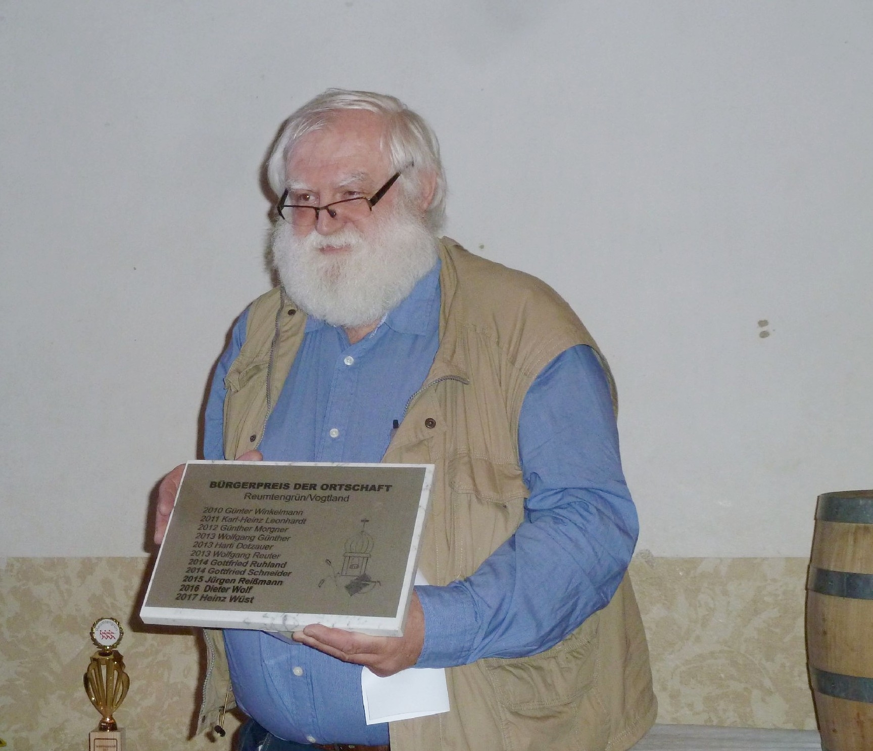 Der Freitagabend wurde mit dem Altherren-Kleinfeldturnier eröffnet. Anschließend starteten die Tauziehmeisterschaften. Für den Nachwuchs war es das 4. und für die Männer bereits das 14. Gerangel mit dem Seil. Eine Mannschaft der Reumtengrüner Feuerwehr konnte wieder den Pokal im Ort behalten! Der Reumtengrüner Bürgerpreis ging 2017 an Heinz Wüst, besser bekannt als der Weihnachtsmann mit dem echten Bart. Heinz Wüst wohnt seit 40 Jahren im Vogtland und ist seit vielen Jahren in Reumtengrün zu Hause. Neben seiner Arbeit in der Diakonie ist er in der Kirchgemeinde Rebesgrün/Reumtengrün sehr engagiert. Er leitet seit mehr als 10 Jahren die Theatergruppe. Neben dem Krippenspiel gehören auch Märchen und andere Stücke zum Programm. Mit einem Krippenspiel konnte schon ein erster Platz bei einem Ausscheid gewonnen werden. Der Faßanstich war nicht so lustig wie im letzen Jahr, jedenfalls für die Zuschauer, dafür floß das Bier schon nach dem 2. Hammerschlag.