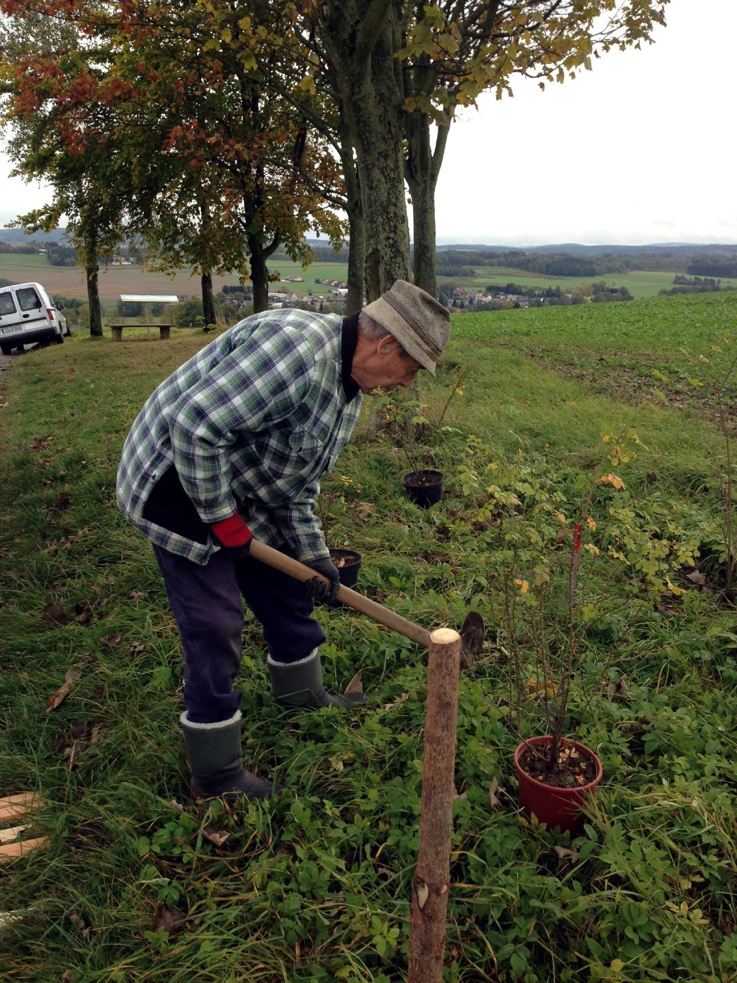 In der Nähe, wo einst die Geßner's Birke stand, wurden Anfang der 90er Jahre Birken und andere Laubbäume gepflanzt. Die Reumtengrüner wollten damit einen kleinen Ersatz für ein Wahrzeichen schaffen. Die Birke und das Schubert's Bühl gab es bis Anfang der 70er Jahre. Im Bühl konnten Kleintiere Unterschlupf finden. Im Frühjahr diesen Jahres wurden nun einige Heckenrosen in der Nähe der Bäume am Panoramablick gepflanzt. Letzten Samstag setzten Heimat- und Naturfreunde weitere Heckenrosen und Berberitze dazu. Die Pflanzung wurde noch mit Maschendraht umzäunt, um es vor Wildverbiss zu schützen. Es soll dort ein schönes Gebüsch wachsen, in welchem sich wieder Kleintiere ansiedeln können.