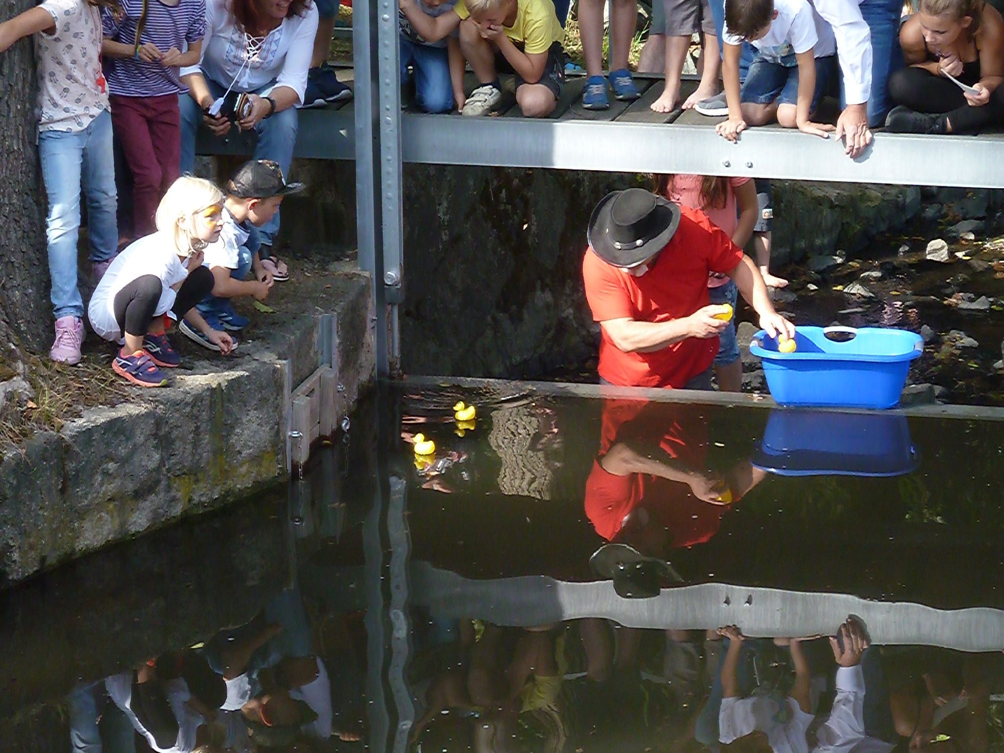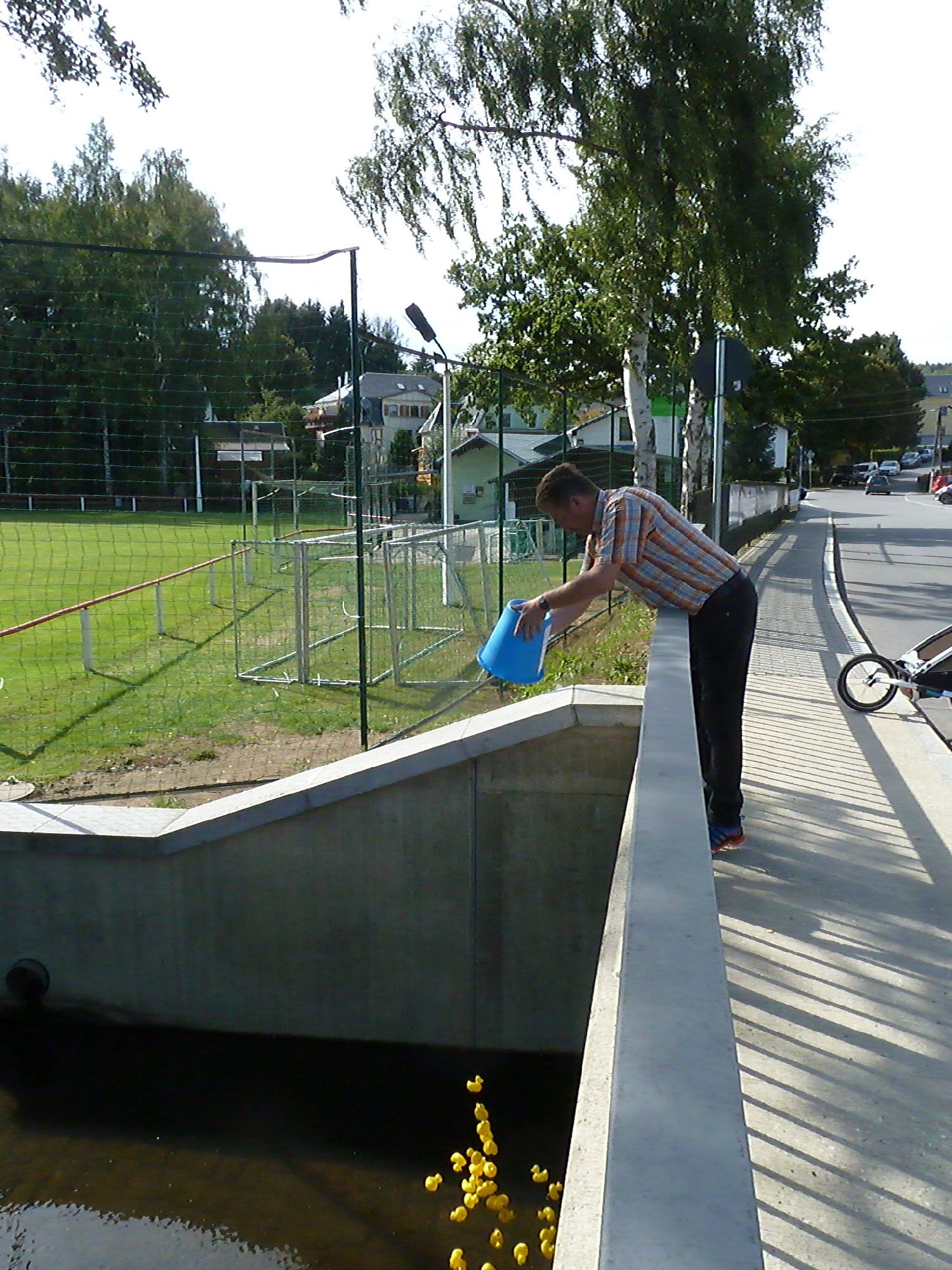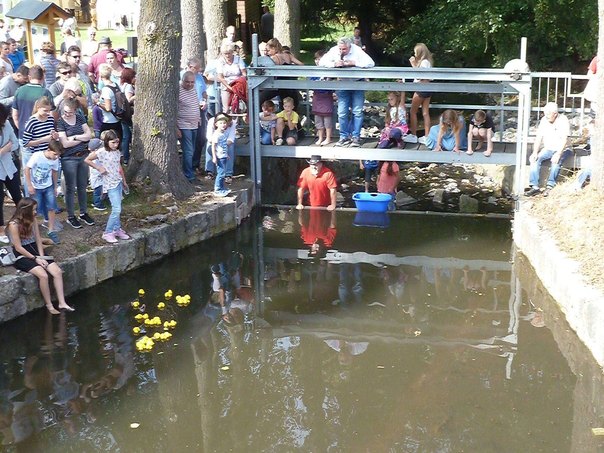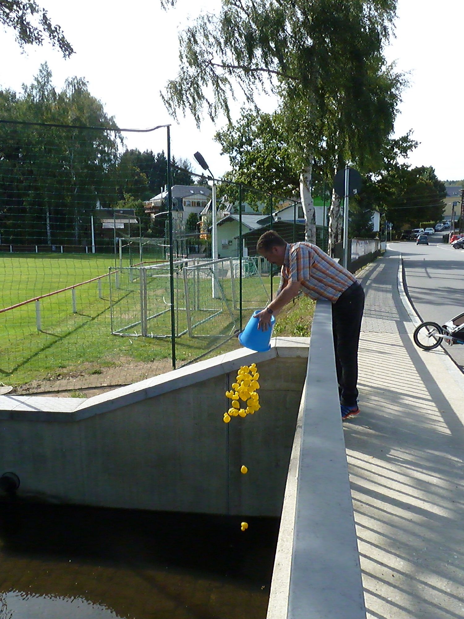 Für den 8. September hat die Ortschaft Reumtengrün zum Feiern auf den Platz am Wehr eingeladen. Mit dem Wetter steht und fällt ein Fest unter freiem Himmel. In diesem Jahr konnten wir uns nicht beschweren. Die Mitarbeiter des Bauhofes stellten Verkaufstände und Tische und Bänke auf. Aufgewartet wurde mit vielen Möglichkeiten den Nachmittag kurzweilig zu gestalten. Das Fest wurde vom OV U. Ebert und den Jagdhornbläsern eröffnet. Hauptattraktion war wieder das Entenrennen gewesen. Pünktlich kamen einige Tage vorher noch Regengüsse, sodass die Enten auch wirklich schwimmen konnten. Spaßvögel hatten für dieses Jahr schon ein Entenwerfen als Alternative vorgeschlagen. Das Entenrennen wurde wieder von unserem OB M. Deckert souverän kommentiert. Bizarre Winde auf dem Wasser bewirkten, dass es zu kuriosen Richtungswechseln kam, dadurch wurde die Zielankunft manchmal verzögert. Als „Schiedsrichter“ stand J. Reißmann in der Treba und fing die Enten der Reihenfolge nach ab. Der große und kleine Hunger konnte mit Wildschwein vom Grill, Rostern, Steaks, Fisch oder Kuchen gestillt werden. Für den Durst gab es eine Vielfalt an kalten und warmen Getränken, mit oder ohne Alkohol. Die Palette für die Aktivitäten reichte vom Baggerfahren, Reiten, Torwandschießen, Bemalen von Figuren, Spritzburg, Streichelzoo, Hüpfburg und Gravur von Gläsern. Für das Training des Geistes gab es verschiedene Quizangebote. Es gab auch noch die Möglichkeit diverse Waren auf dem Flohmarkt zu kaufen. Im Theaterstück der Kirchgemeinde tyrannisierten aufmüpfige Teenies die Supernanny. Für die musikalische Umrahmung war DJ „Maxi“ verantwortlich. Bis spät in die Nacht konnten sich die Gäste im Zelt der Freiwilligen Feuerwehr noch amüsieren. Höhepunkte waren am Abend die Versteigerung der Kettensägearbeit vom „Holz Mathi“ und die Verlosung der Preise. Großen Dank allen Helfern und Sponsoren ohne deren unermüdlichen Einsatz wäre das Fest nicht möglich gewesen. Der Gewinn des Festes wird für die Sanierung der Friedhofskapelle verwendet werden. Der Ortschaftsrat