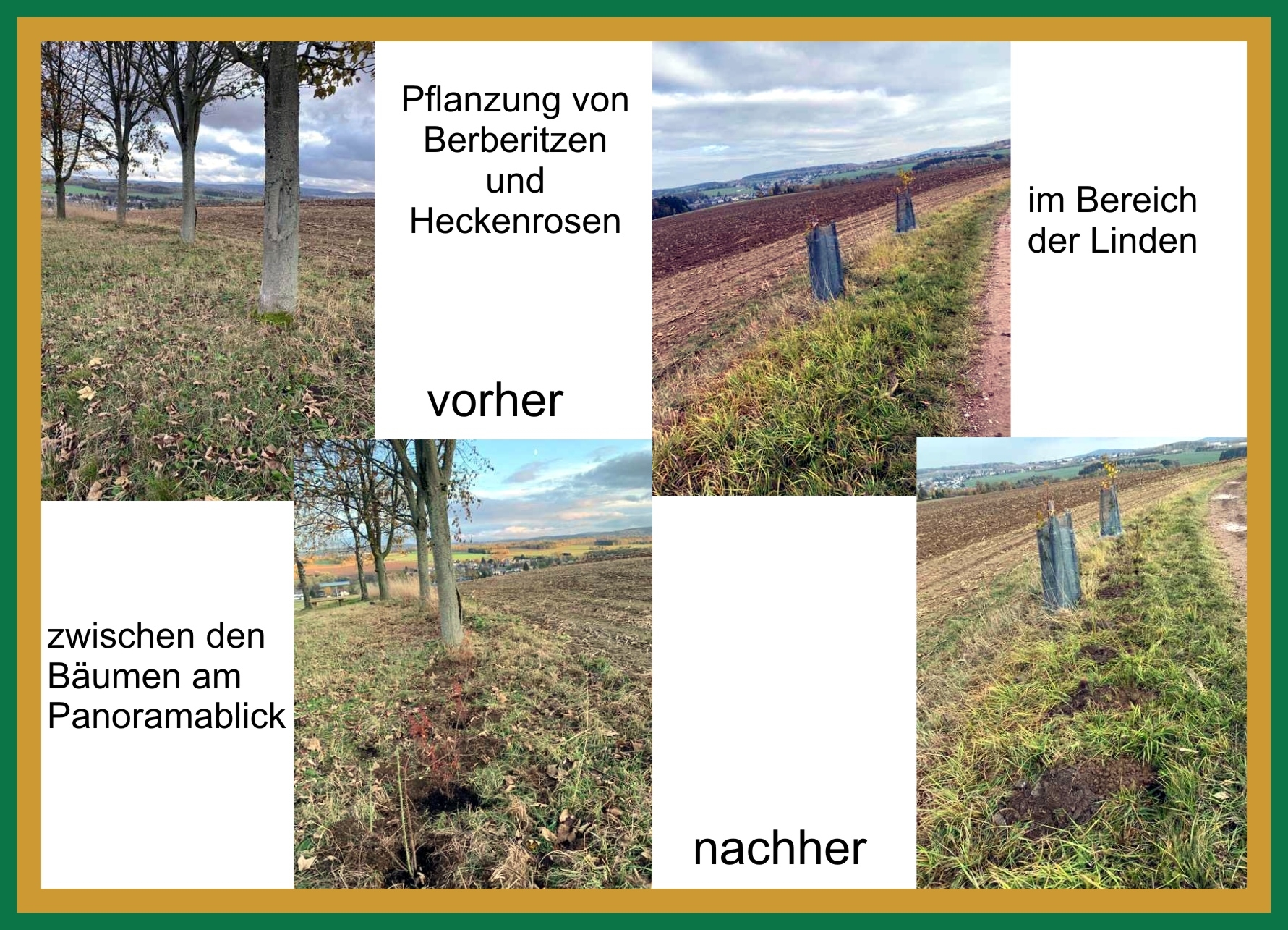 Im Bereich vom Panoramablick am Winkelmann's Weg wurden zwischen den Bäumen Berberitzen und Heckenrosen gepflanzt und an den Linden noch weitere Heckenrosen. Insgesamt sind es 9 Berberitzen und 29 Heckenrosen. Dies ist eine Privatinitiative von Reumtengrüner Bürgern.