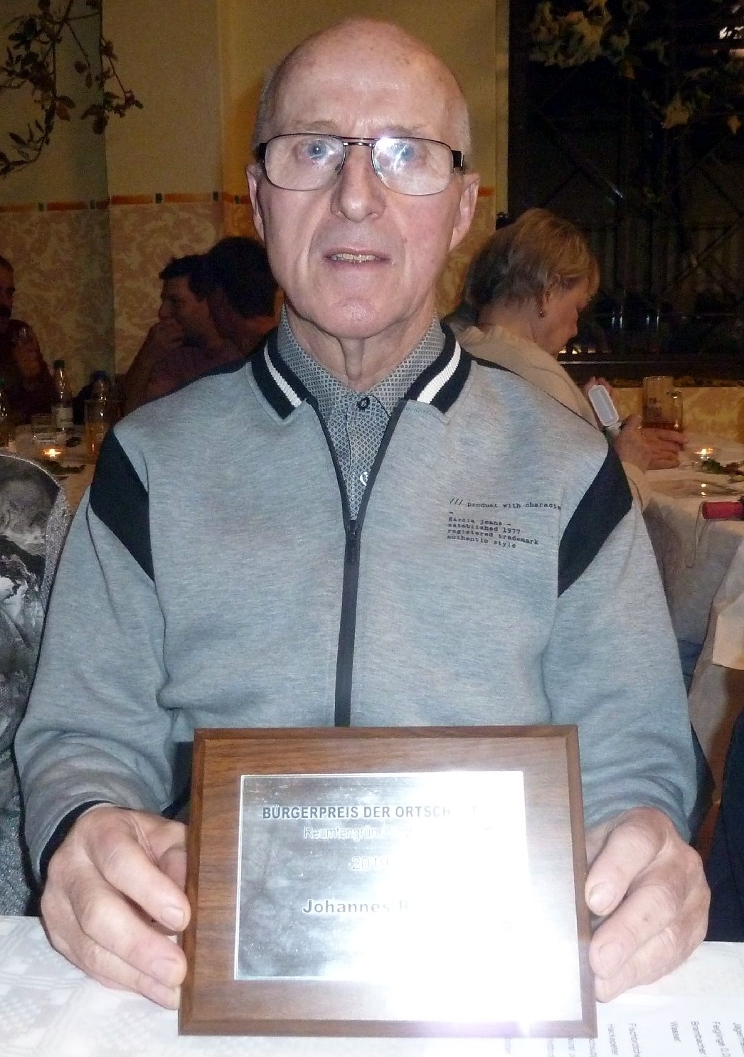Johannes Rink ist der 10. Reumtengrüner Bürgerpreisträger. Seit 48 Jahren ist er ein Mitglied der Freiwilligen Feuerwehr Reumtengrün. Sein besonderes Verdienst und Leidenschaft ist die Organisation der Waldweihnacht für die Kinder. Hier kann er als Weihnachtsmann sein schauspielerisches Talent ausleben. Seine Gabe als Unterhalter ist zum Heimatabend oder zum Hutzenabend im Heimatverein gefragt. Nebenbei ist er noch für die Verköstigung der Kameraden zu ihren wöchentlichen Treffen verantwortlich. In seiner Dankesrede betonte er, dass dies alles nicht ohne die Mithilfe und Unterstützung seiner Frau Margitta möglich wäre.