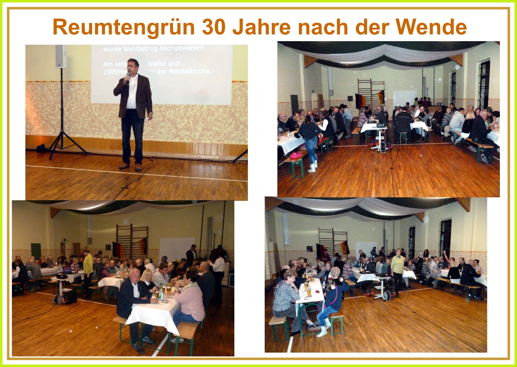 Unter diesem Motto hatte der Ortschaftsrat alle Bürger für den 9. November in die Turnhalle des VfL eingeladen. Zahlreiche Reumtengrüner folgten der Einladung. Von den Ortschronisten wurde eine Präsentation erarbeitet. Angefangen von turbulenten Wochen vor der Wende und der noch aufregenderen Zeit nach dem 9. November bis zur Gegenwart wurde ein Überblick gegeben. Die Änderungen in der Kommunalpolitik, der Infrastruktur, den Firmen und dem sozialen Leben wurden eindrucksvoll gezeigt. Viel hat sich seit der Wende in Reumtengrün getan und wird sich sicherlich noch tun.