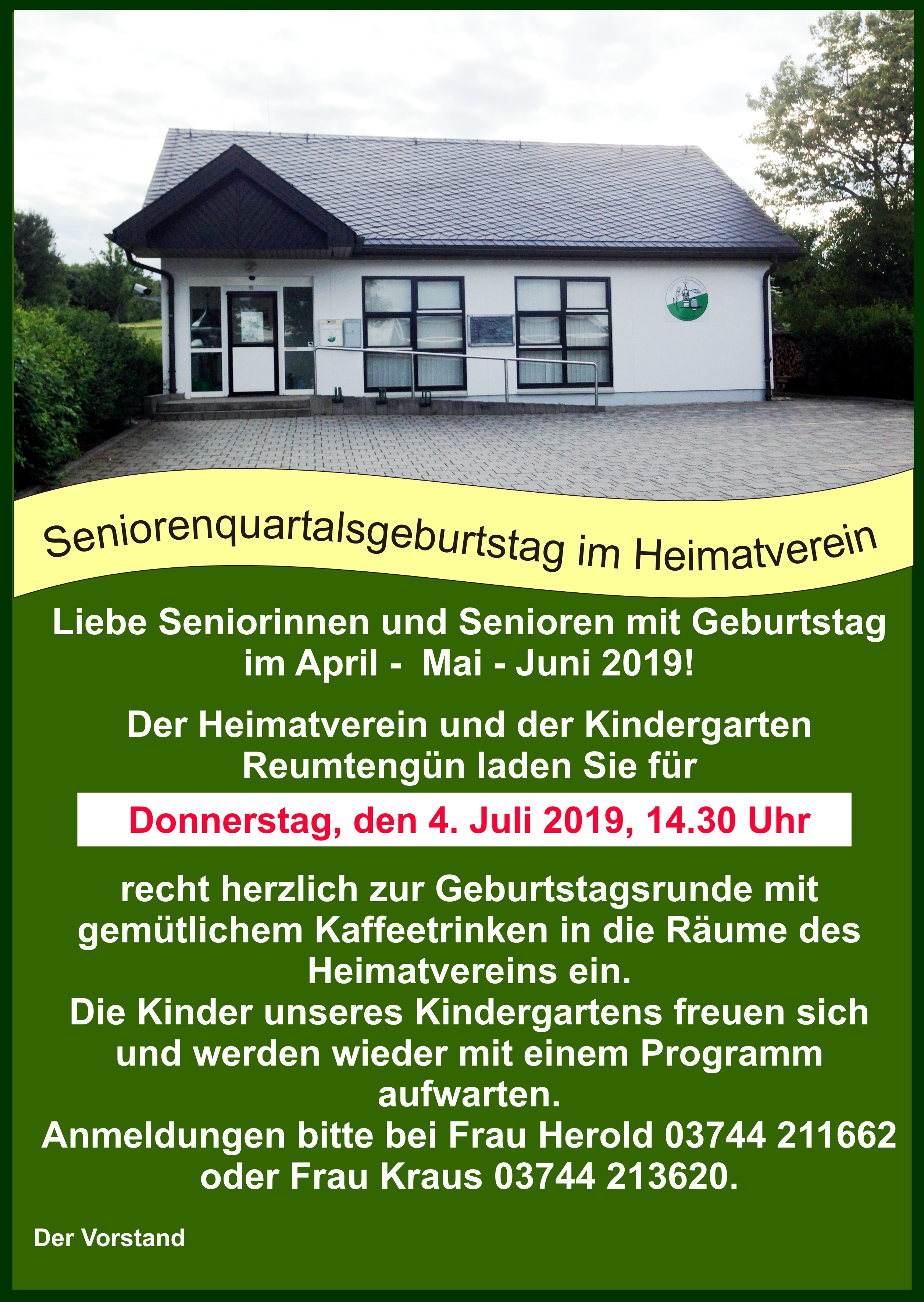 Am 4. Juli hatten die Heimatfreunde Reumtengrün und der Kindergarten zum Seniorenquartalsgeburtstag eingeladen. Einige Kinder nahmen zum letzten Mal an der Feier teil, da sie ab August Schulkinder sein werden. Das erste Lied war auch dem Schulanfang und dem Schulalltag gewidmet, außerdem wurde noch musikalisch zum Geburtstag gratuliert. Unsere Senioren hatten nach dem Kaffeetrinken die Gelegenheit, sich über die Geschehnisse im Ort auszutauschen. Viele Möglichkleiten für Zusammenkünfte gibt es leider nicht mehr.