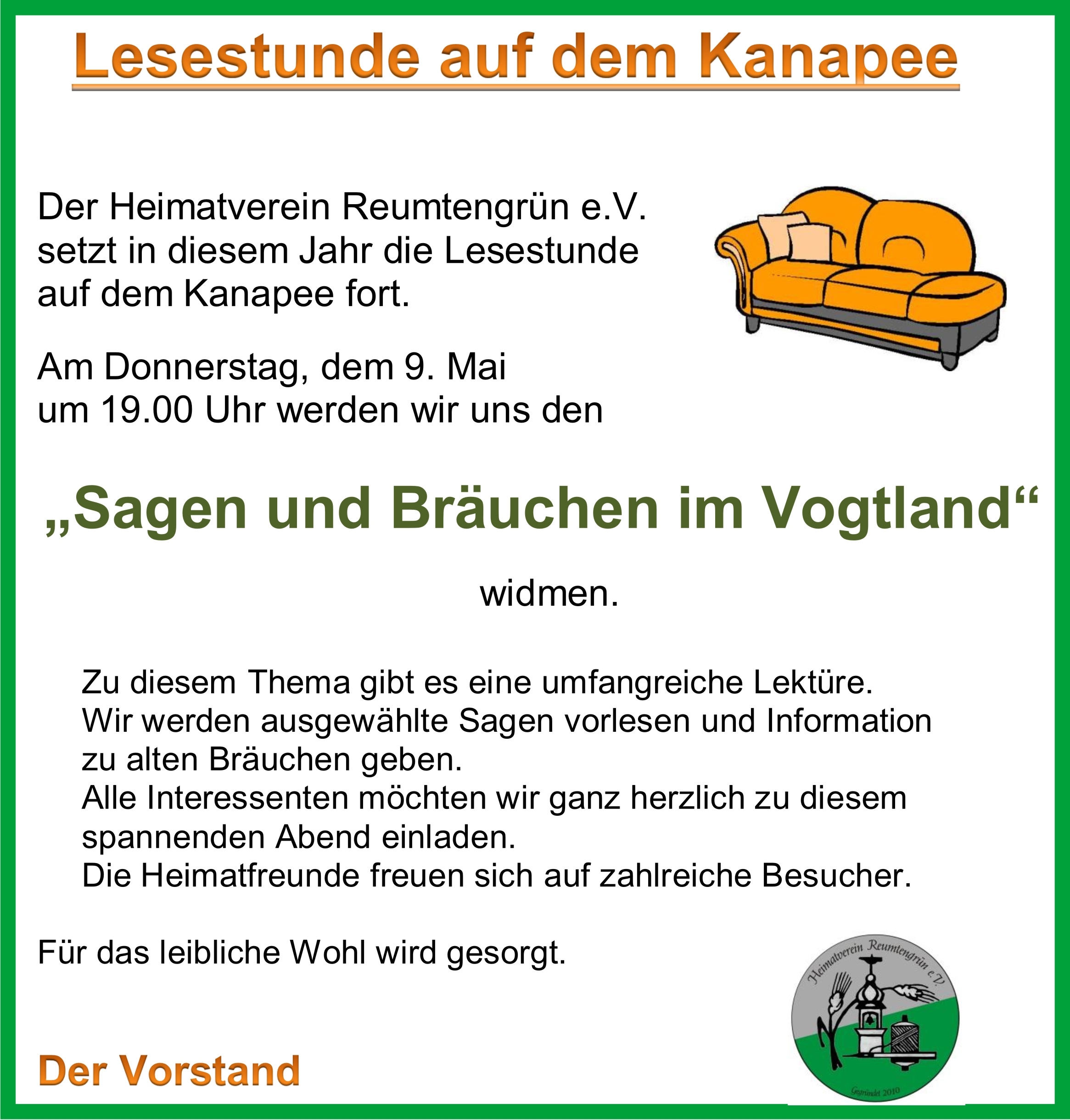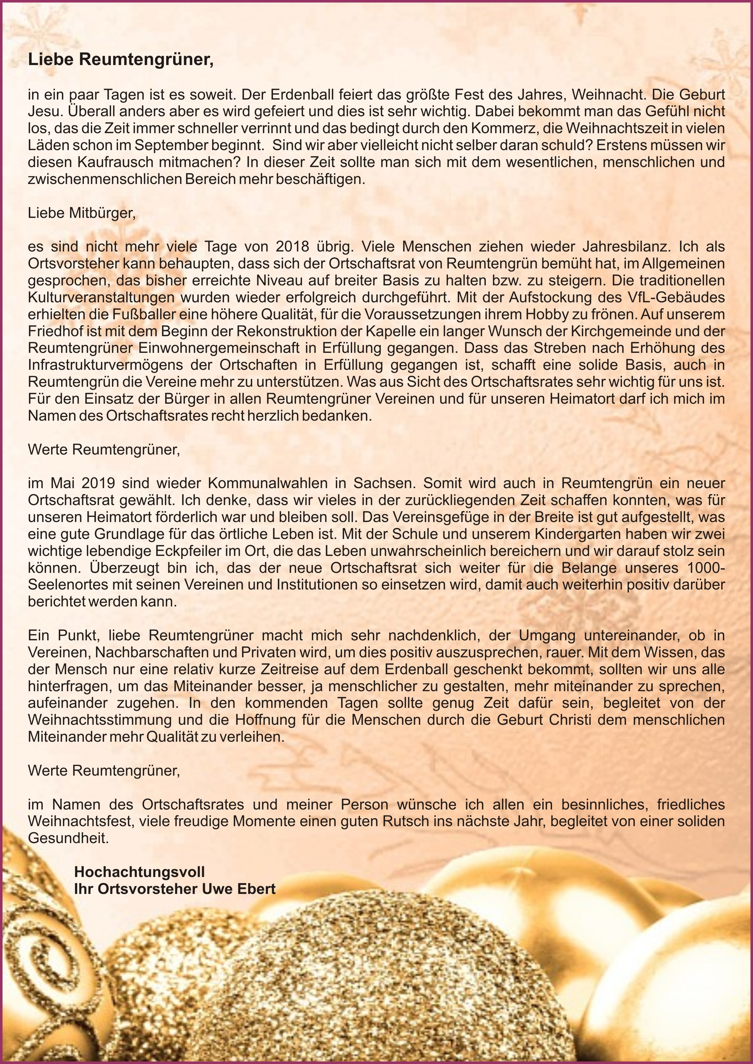 Der Höhepunkt im Reumtengrüner Veranstaltungskalender für 2019 sollte der Besuch des MDR Wetterfrosches Thomas Globig werden – und er ist es auch geworden. Die Turnhalle des VfL war so gut wie selten besucht. Laut Ortsvorsteher Uwe Ebert hatte er noch nie so viele fremde Gesichter dort gesehen. Er hatte auch die Idee, Thomas Globig zu uns einzuladen. Die Vorabsprachen mit ihm waren komplikationslos. Als Thema hatte Thomas Globig „Wetter und Klima zwischen Wissenschaft und Ideologie“ gewählt. Die Eintrittskarten waren innerhalb von wenigen Stunden verkauft. Eine Herausforderung stellt dar, möglichst wenig enttäuschte Interessenten zu haben, aber auch die Kapazität der Turnhalle nicht zu sprengen und die Sicherheit zu gewährleisten. Im Vortrag setzte sich der Referent mit der teilweisen Effekthascherei der Medien auseinander. Für ihn steht fest, dass die Erde keine unbegrenzte Zahl an Bewohnern ertragen kann. Auch dem Raubbau mit der Natur, sprich dem Abholzen der Regenwälder sollte Einhalt geboten werden. Er ist der Meinung, dass es schon immer einen Klimawandel gab. Oft sind die unbedachten Eingriffe des Menschen in die Natur die Ursache von Katastrophen. Er zeigte dies am Beispiel von verrohrten Flussläufen, welche dann bei Starkregen die Brücke überschwemmten und zerstörten. Die Straße über der Brücke wurde mitgerissen und so der nächste Ort verwüstet. Ihm ist es schleicherhaft, wie das momentane Stromnetz die Versorgung mit ausschließlich erneuerbaren Energien garantieren soll. Die anschließenden Fragen von den Besuchern wurden von ihm souverän beantwortet. Unser Ortsvorsteher bedankte sich mit einem symbolischen Geschenk – einen Moosmann, den Reumtengrüner Kalender und ein Stickereierzeugnis der Firma Reuter. Er verabschiedete sich mit der Zusage, auf alle Fälle wieder nach Reumtengrün zu kommen!!!