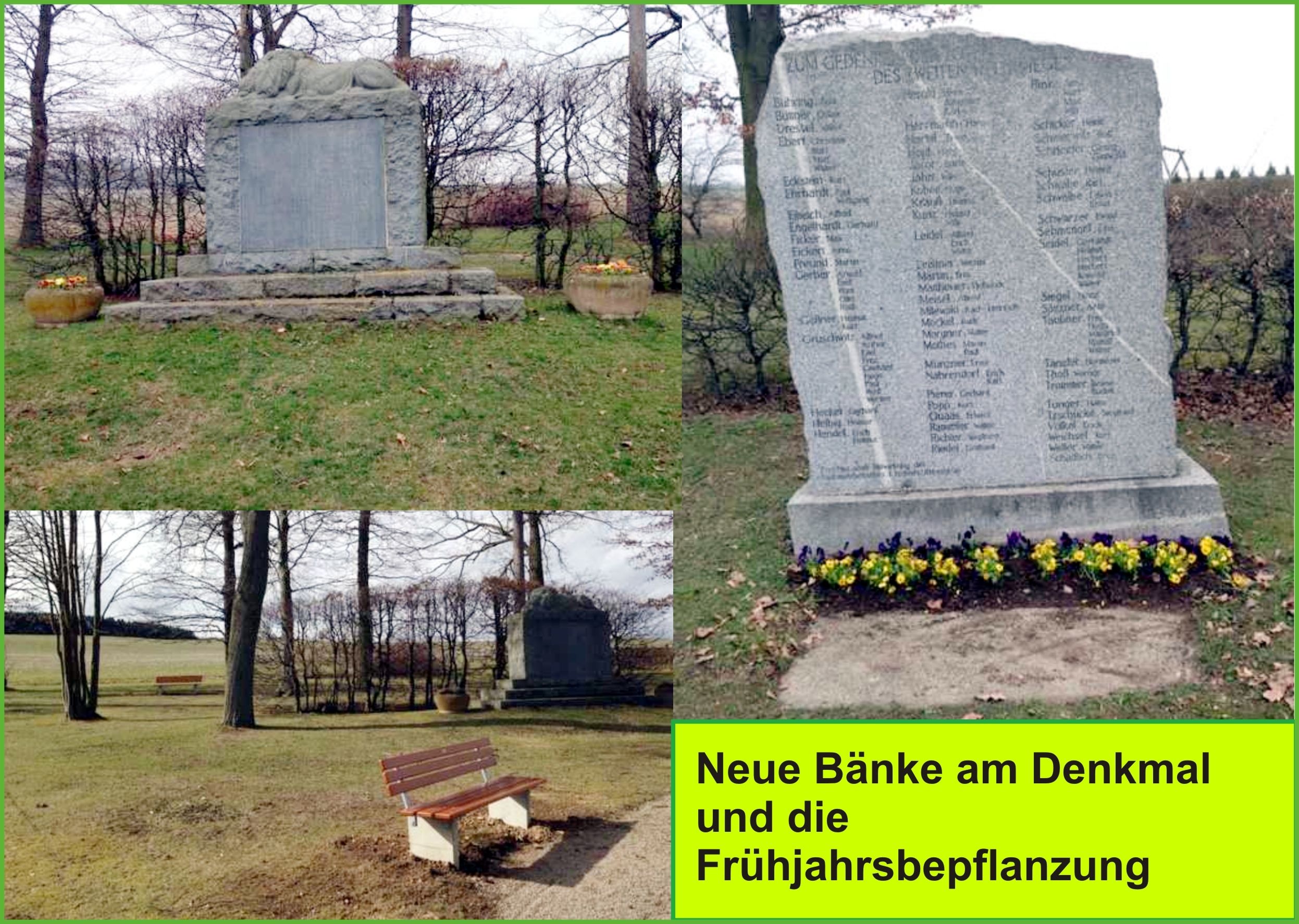 Im Bereich der Denkmäler in Reumtengrtün wurden 3 neue Bänke aufgestellt, welche von der Stadtverwaltung finanziert wurden. Hergestellt hatte diese die Werkstatt für behinderte Menschen der Diakonie Neuendettelsau.