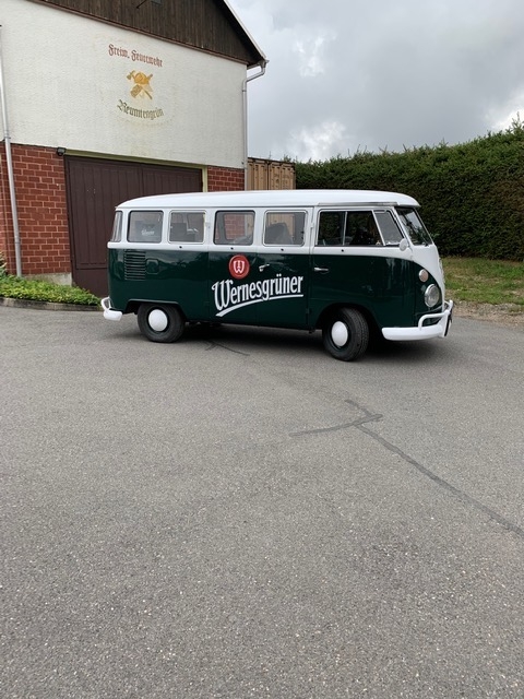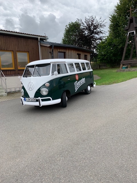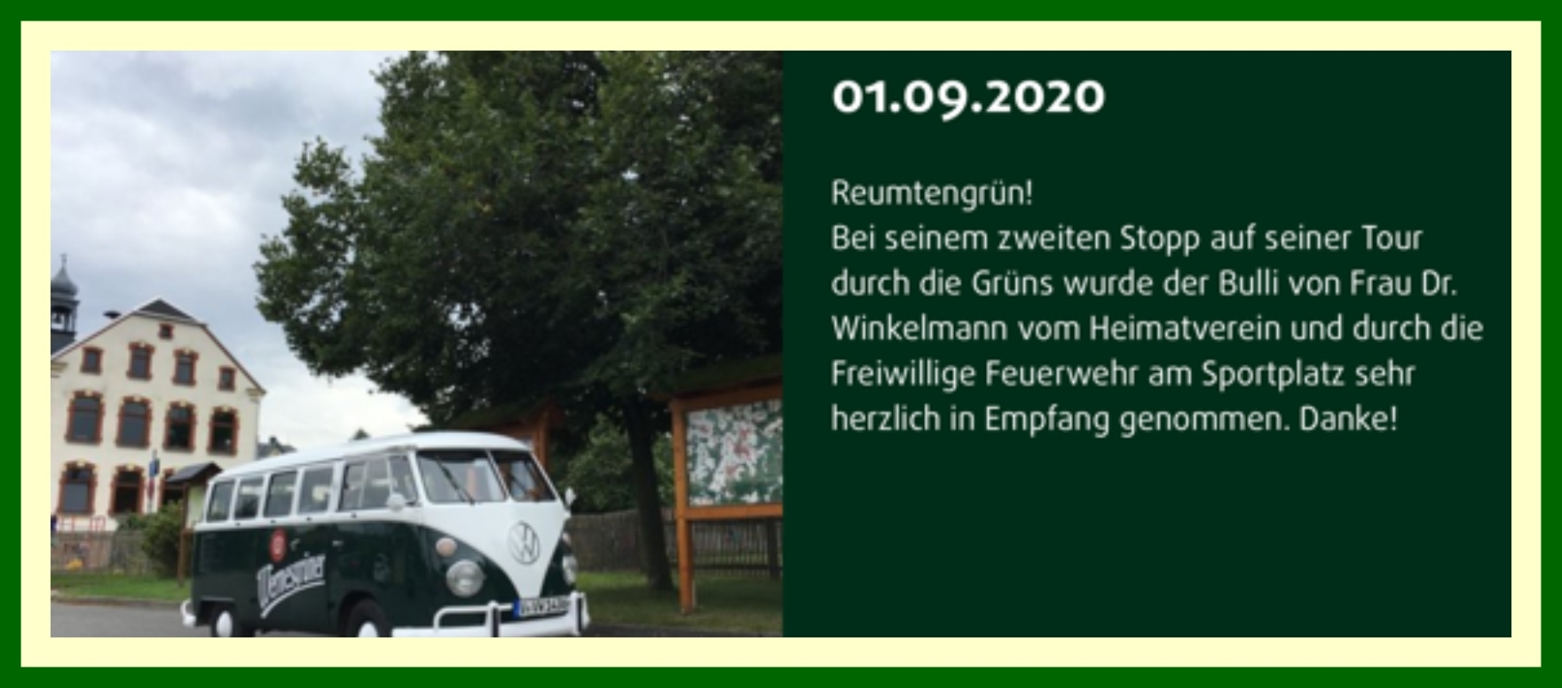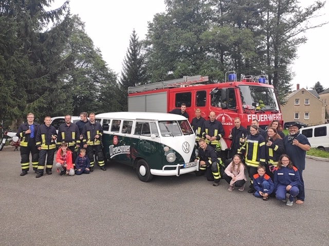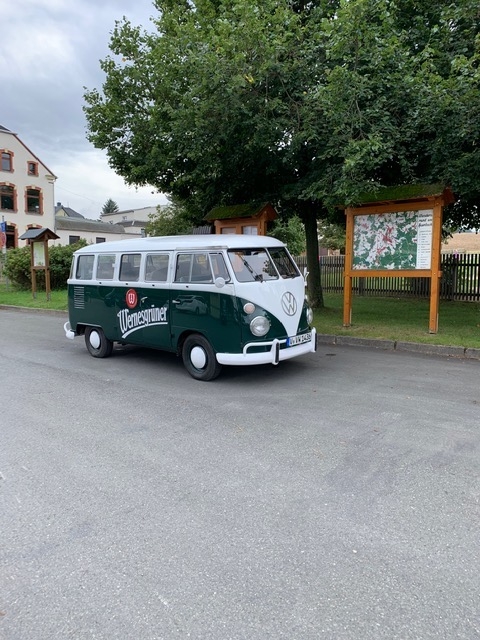 Die Wernersgrüner Brauerei startete eine Aktion unter Orten mit der Endung "GRÜN". Dazu passt auch der gestylte, historische, grüne Bulli ganz hervorragend. Für die Ortschaften konnte in den sozialen Medien abgestimmt werden. Unser Ort reihte sich dank des positiven Votums mit in die "besuchswürdigen" Orte ein. Am 1. September kamen 2 Mitarbeiter vom Marketingteam mit ihrem grünen Bulli angereist. Im Ortszentrum wurde kurz ein Einblick in die Historie des Ortes gegeben und Kindergarten, Schule, die Feuerwehr, der Heimatverein und die Kirche gezeigt. Den Abschluß bildete der Empfang des Bullis durch zahlreiche Kameraden der Freiwiligen Feuerwehr am VfL.