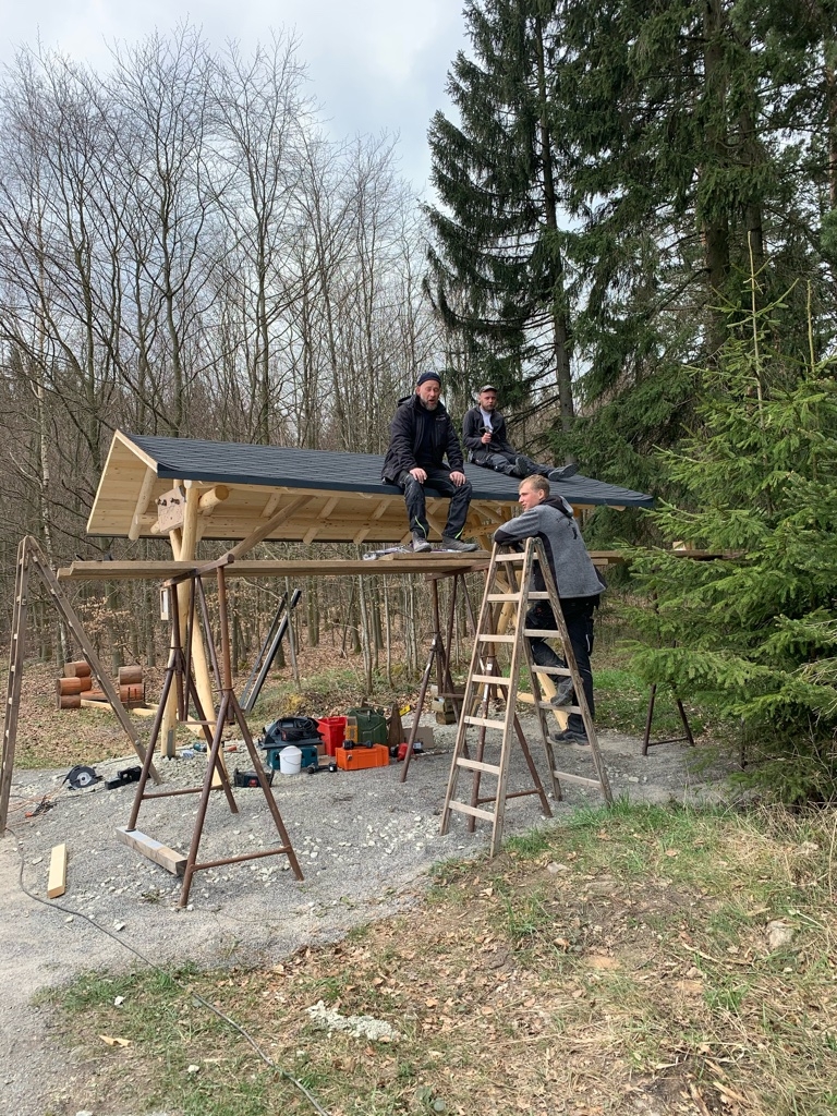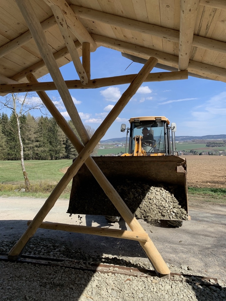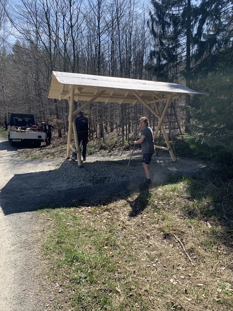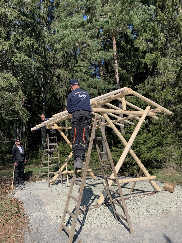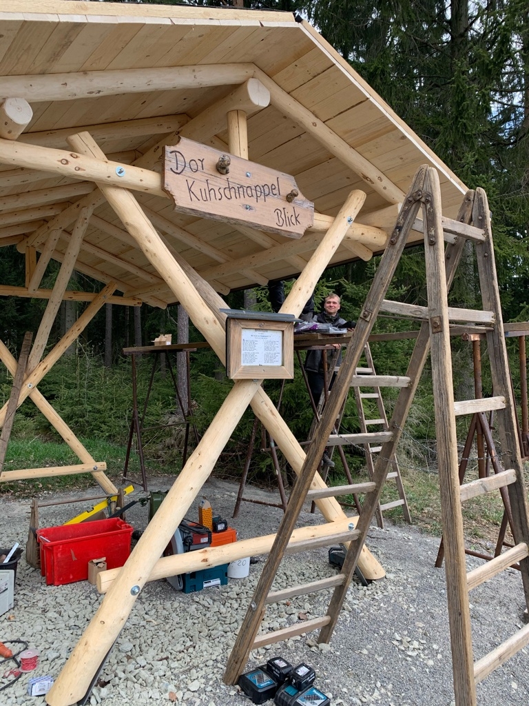 Am 28. April begann die Firma Zimmerei Frank Kluge mit dem Aufstellen der neuen überdachten Sitzgruppe am Kuhschnappelblick. Der Untergrund musste zuerst nochmal bearbeitet werden, dazu wurden Schottersteine aufgeschüttet und verfestigt.