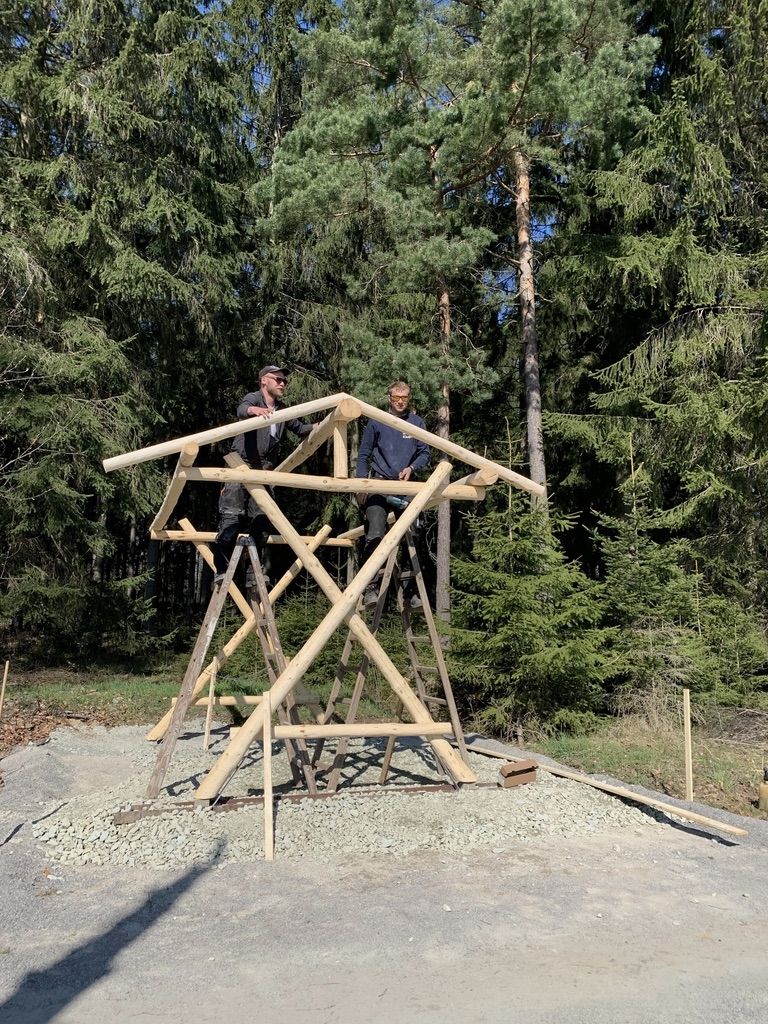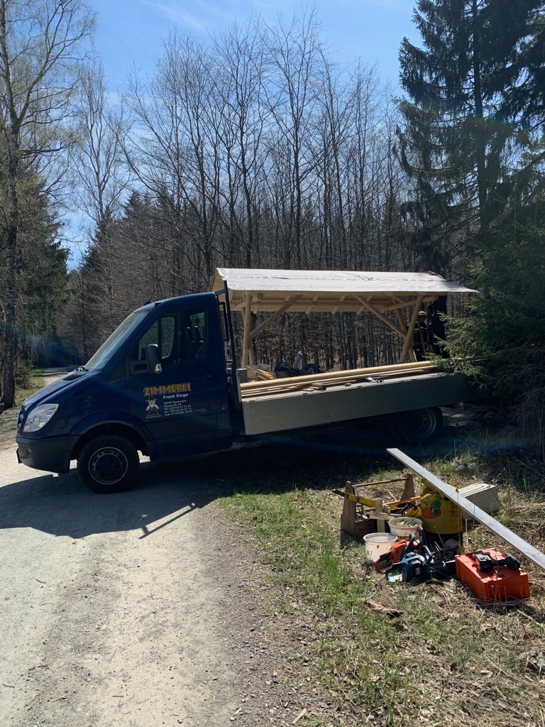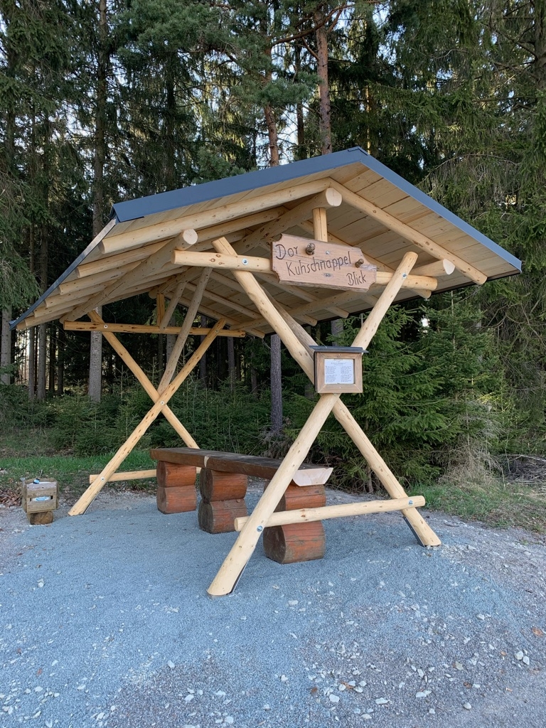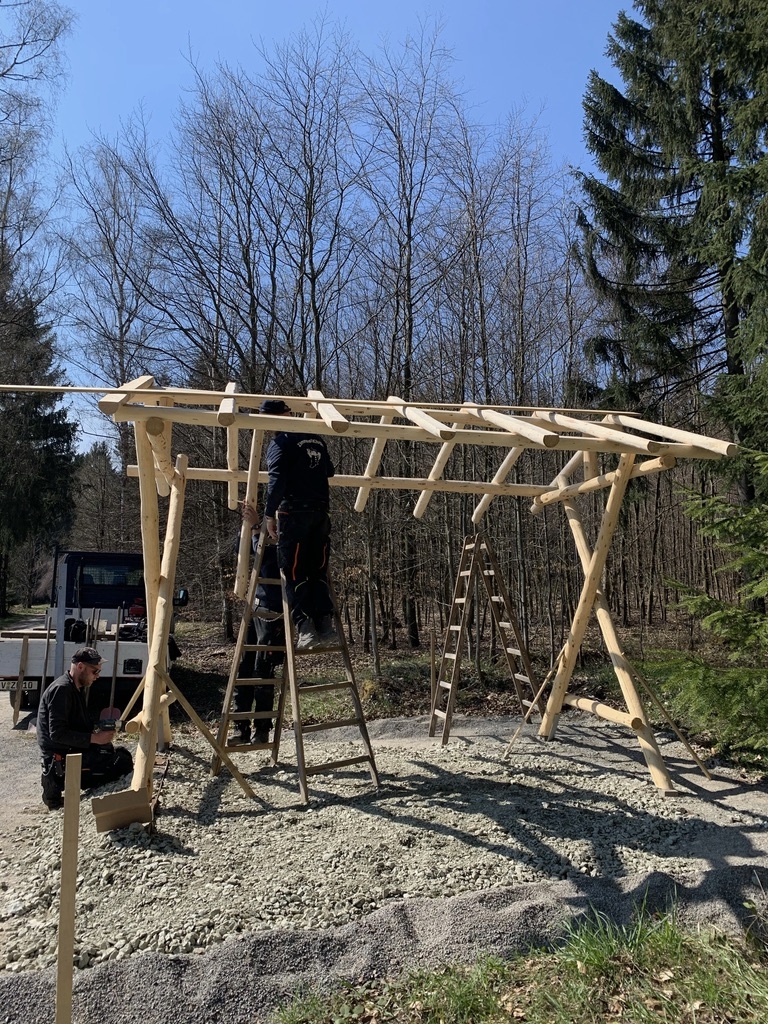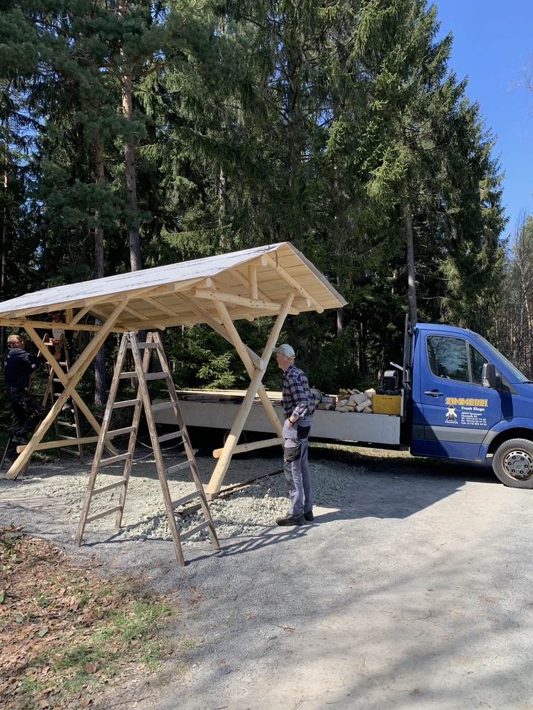 Am 28. April begann die Firma Zimmerei Frank Kluge mit dem Aufstellen der neuen überdachten Sitzgruppe am Kuhschnappelblick. Der Untergrund musste zuerst nochmal bearbeitet werden, dazu wurden Schottersteine aufgeschüttet und verfestigt.