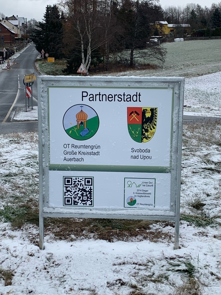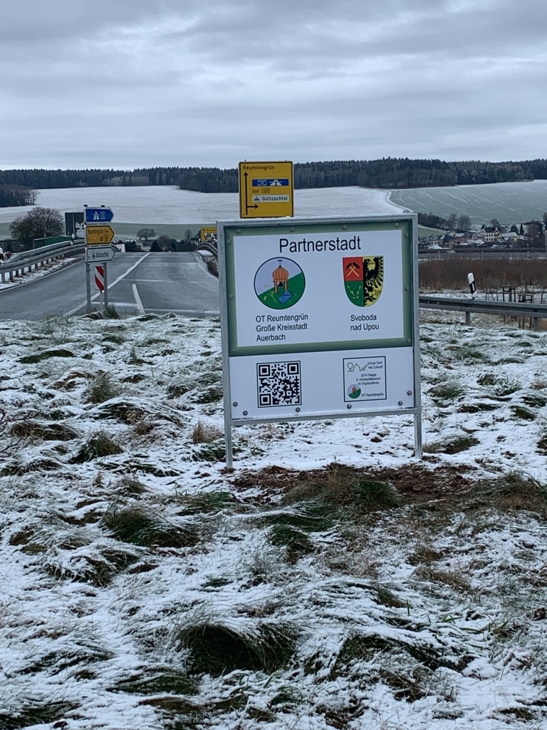 Seit dem Wochende Ende November steht auf der Insel im Kreisverkehr in der Nähe der B 169 die große Hinweistafel zu unserer Partnerstadt Svoboba.