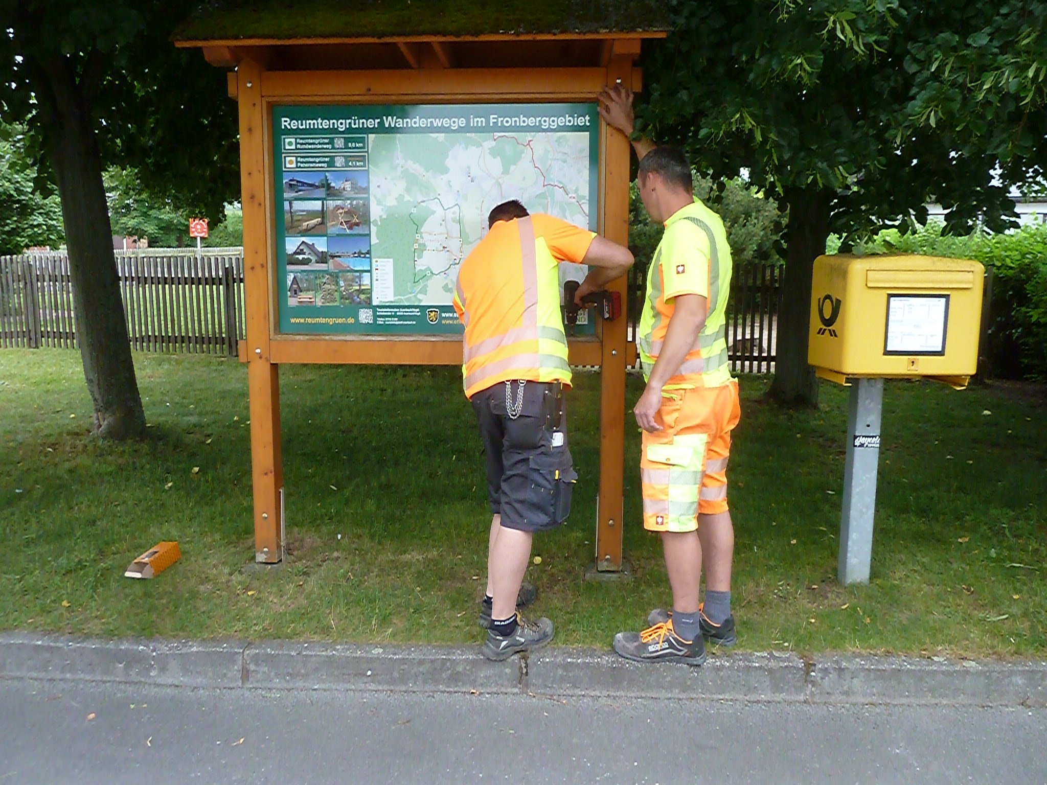 Am 29. Juni wurde am Dorfplatz in Reumtengrün die neue Wandertafel angebracht. Das Design wurde von der Firma Engelmann Design entworfen. Die Kosten übernahmen die Sparkasse Vogtland und die Stadtverwaltung. Die Tafel wurde von Mitarbeitern des Bauhofes eingbaut. Vielen Dank!