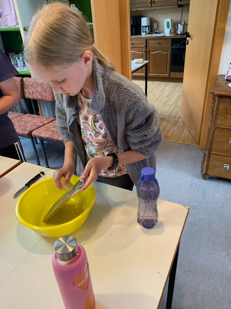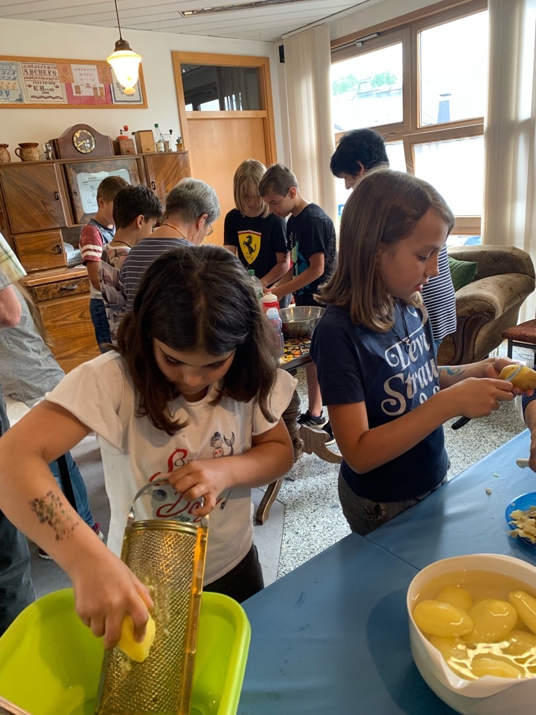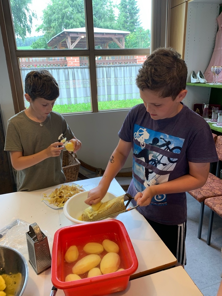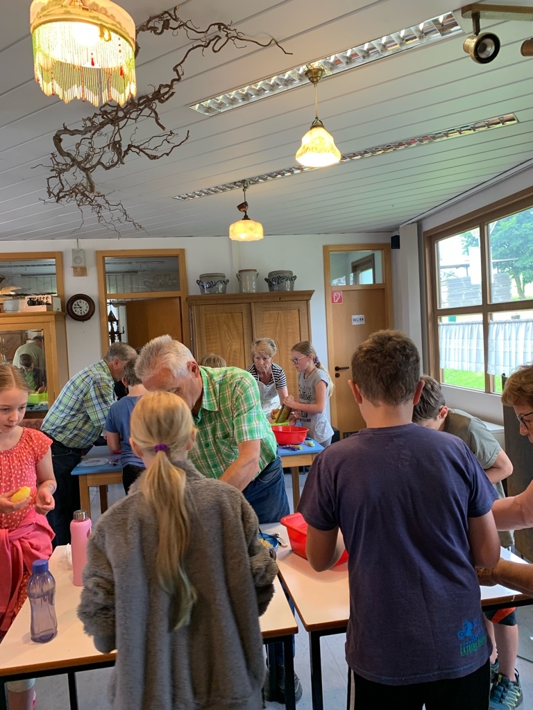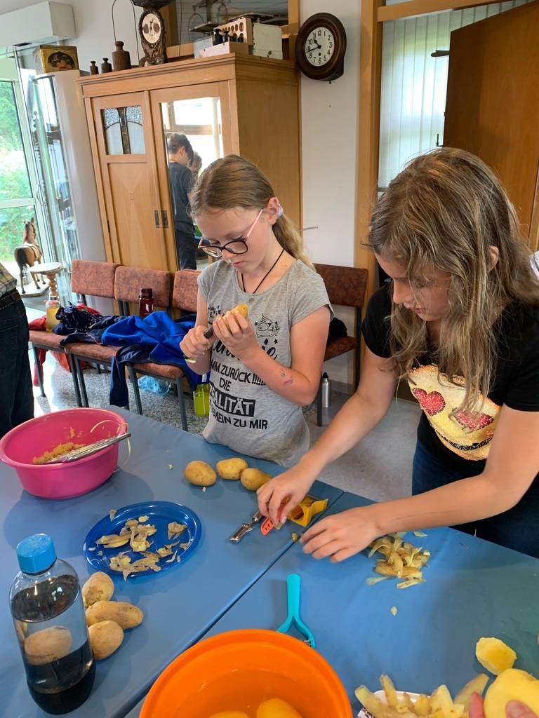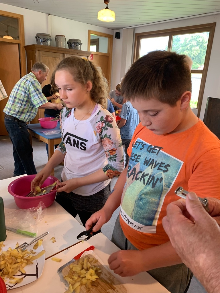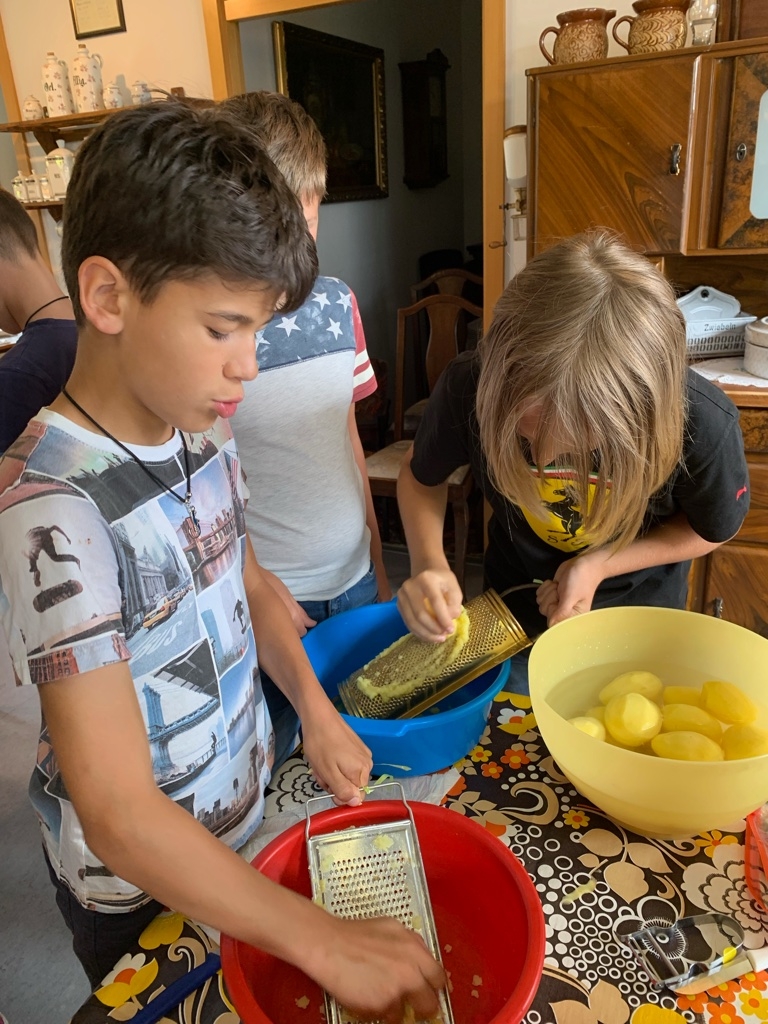 In diesem Jahr war es wieder möglich gewesen, eine Tradition mit den Kindern der 4. Klasse der Ev. Grundschule fortzusetzen. Es hat sich wohl herumgesprochen, dass Handwerk doch Freude machen kann und selbst zubereitetes Essen besser schmeckt. Außerdem tut es gut, Küchenarbeit schätzen zu lernen und zu merken, wie schwer es doch die Urgroßeltern hatten. Diesmal waren sogar Kinder dabei, hauptsächlich Jungen, die mit einem Kartoffelschäler umgehen konnten. Als kräftezehrend erwies sich wieder das Reiben der rohen Kartoffeln. Hier standen als Assistenten immer Heimatfreunde zur Seite. Wenn man erlebt hat, wie den Kindern dann dieses Mittagessen geschmeckt hat, sieht man gerne über die Vorbereitungen und investierte Zeit hinweg. Die Begeisterung der Kinder war der Lohn!