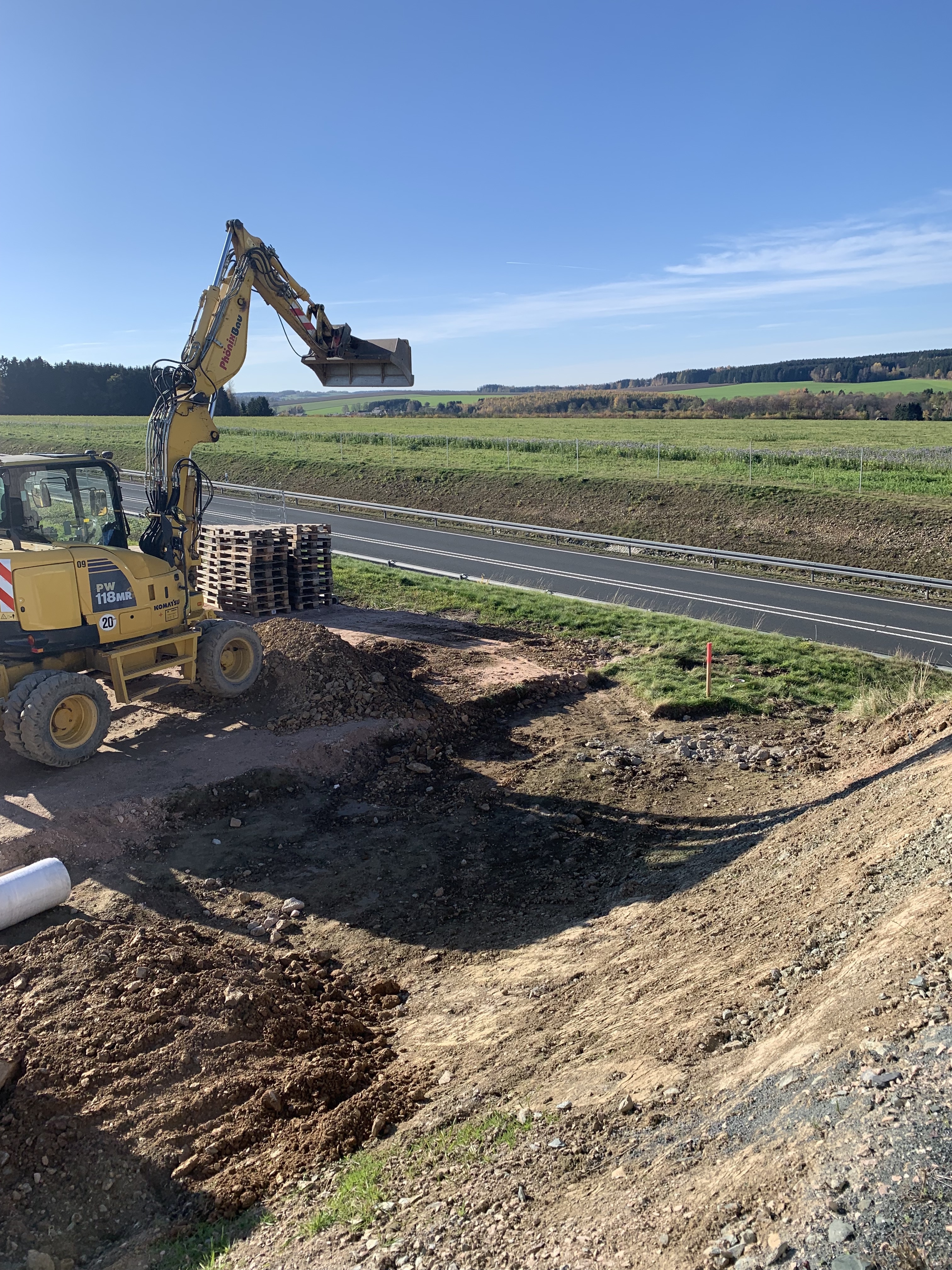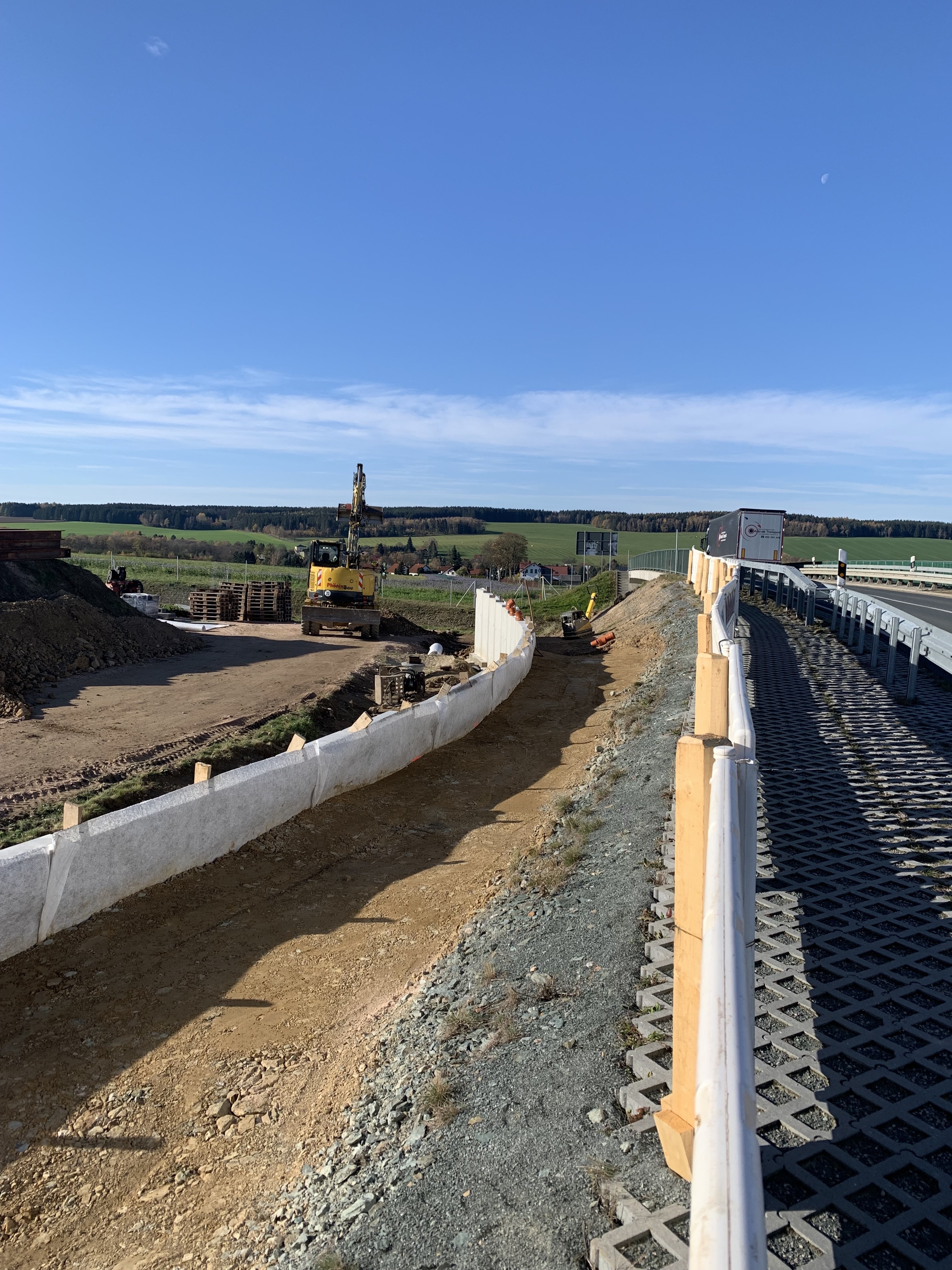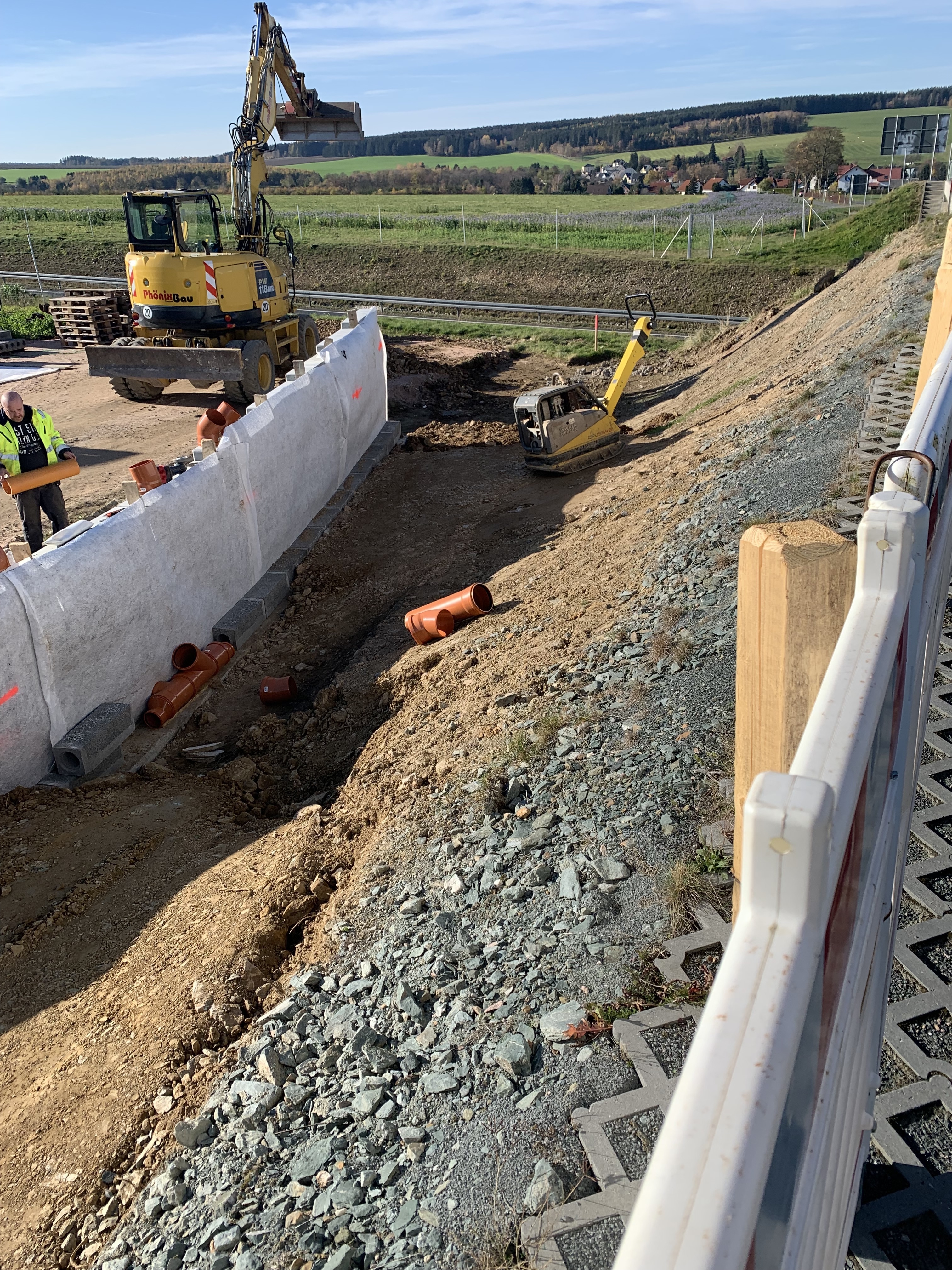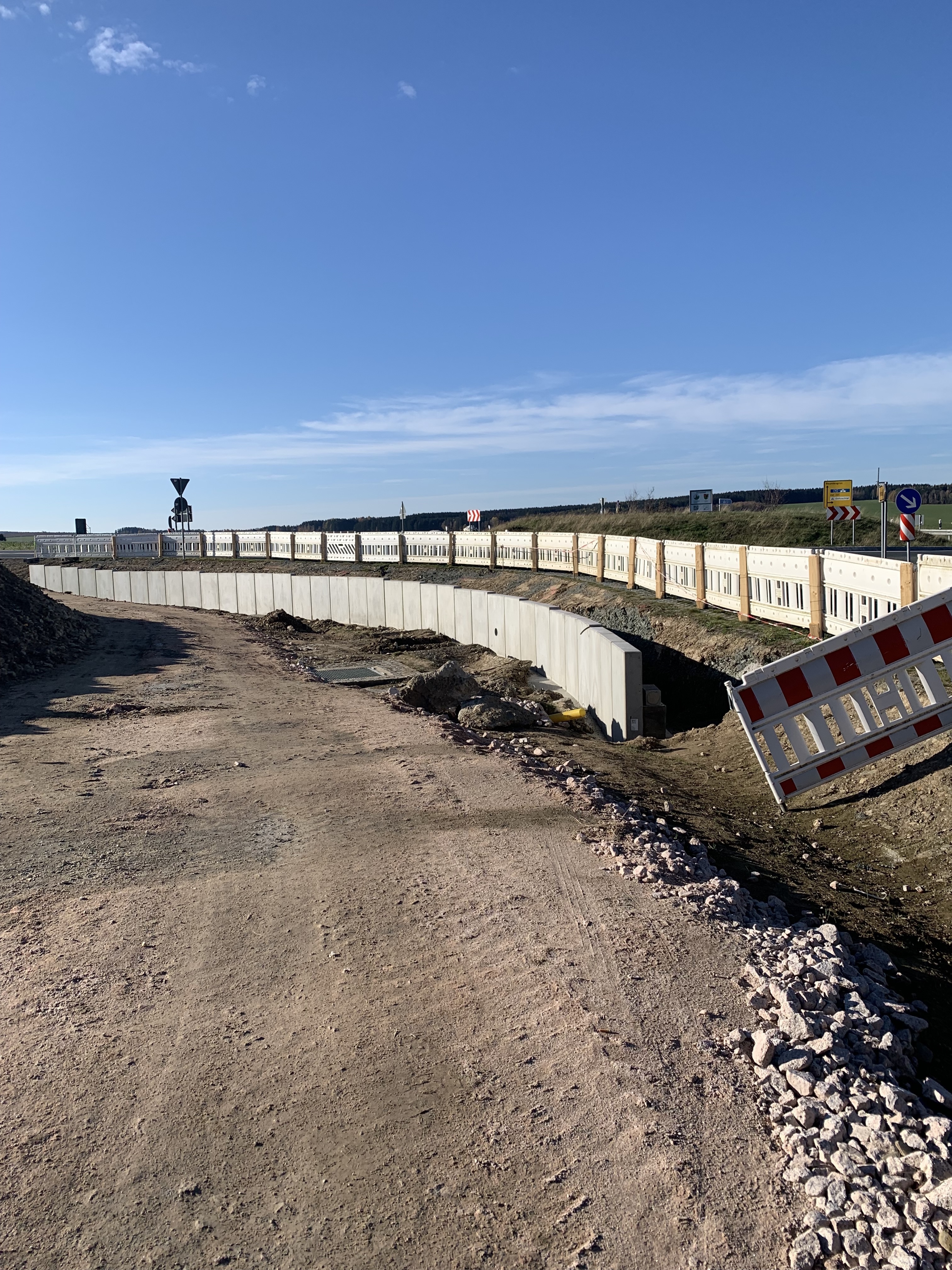 Die Arbeiten für die Weiterführung des Fuß-Radweges und der Brücke über die B 169 schreiten kontinuierlich voran. Mittlerweile wurde der Bereich hinter den L-Fundamenten teilweise aufgefüllt und verdichtet. Hier wird dann der Fuß-Radweg entlang führen.