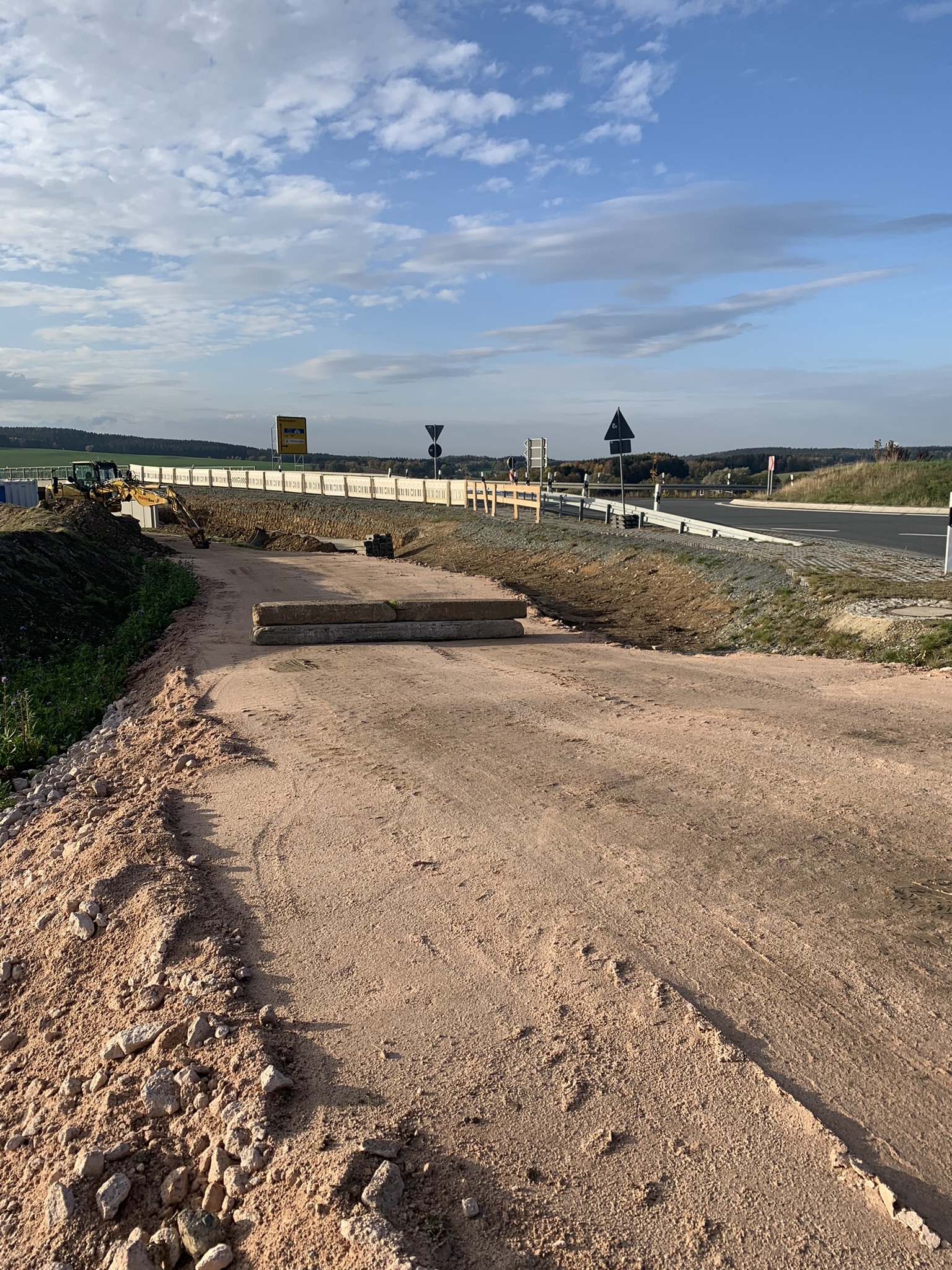 Die Vorarbeiten für den Brücken- und Radwegbau schreiten voran. Gearbeitet wird momentan auf der Seite zur Richardshöhe. Die Baustraße für die Baufahrzeuge ist fertig. Jetzt werden Betonfundamente gesetzt. Diese werden Richtung Auerbacher Straße aufgefüllt, verfestigt und zum Schluß kommt eine Asphaltschicht darüber- fertig ist der Rad-Fußweg!! Die neue Brücke über die B 169 wird im nächsten Jahr eingesetzt.