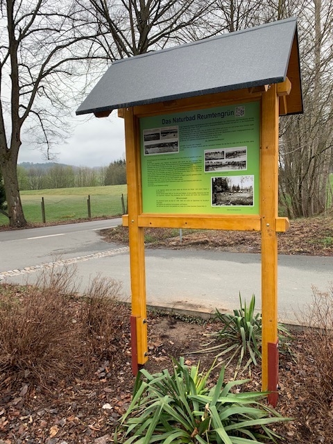 Der Ortschaftsrat hat es sich zum Ziel gesetzt, nach und nach an interessanten Stellen im Ort Informationstafeln aufzustellen. Bisher gibt es welche am Fronberg, im Dorfzentrum und am historischen Wehr an der Treba. Nun ist die Tafel am Freibad Reumtengrün hinzugekommen. Eine Seite widmet sich dem ehemaligen Naturbad Reumtengrün und die andere Seite erzählt von dessen Wandlung zu einen herrlichen Freibad. In Arbeit ist eine Tafel für die Richardshöhe.