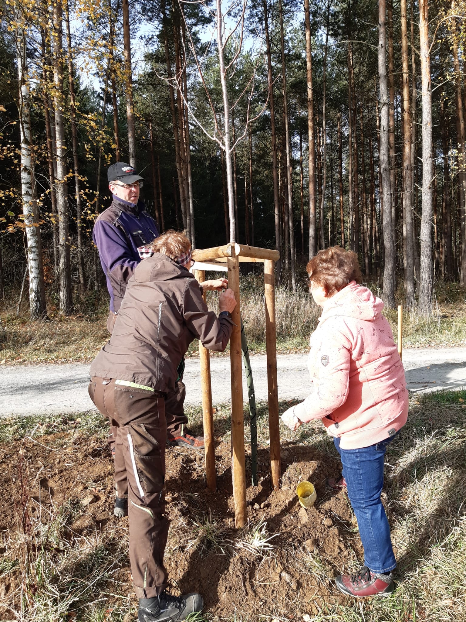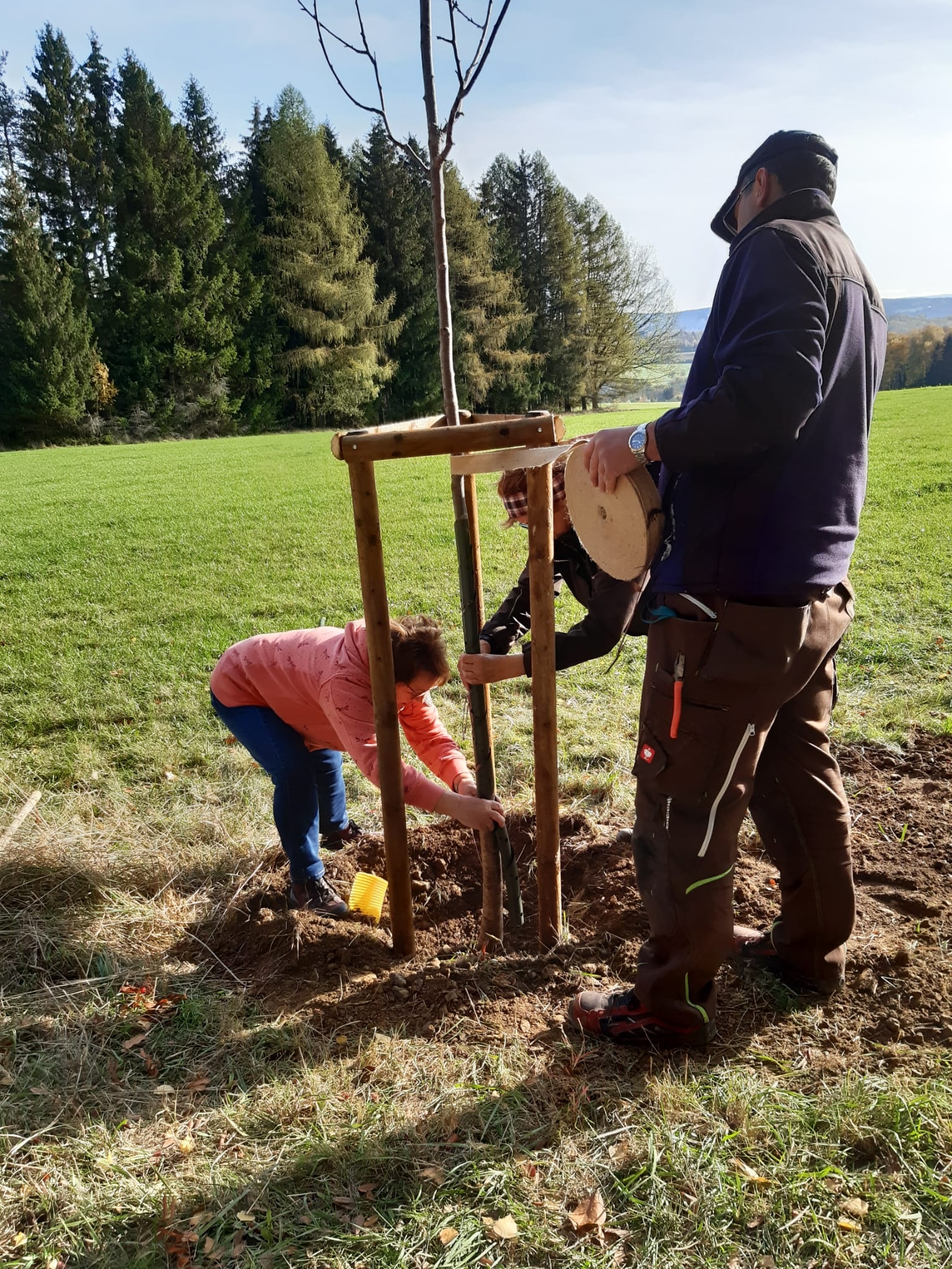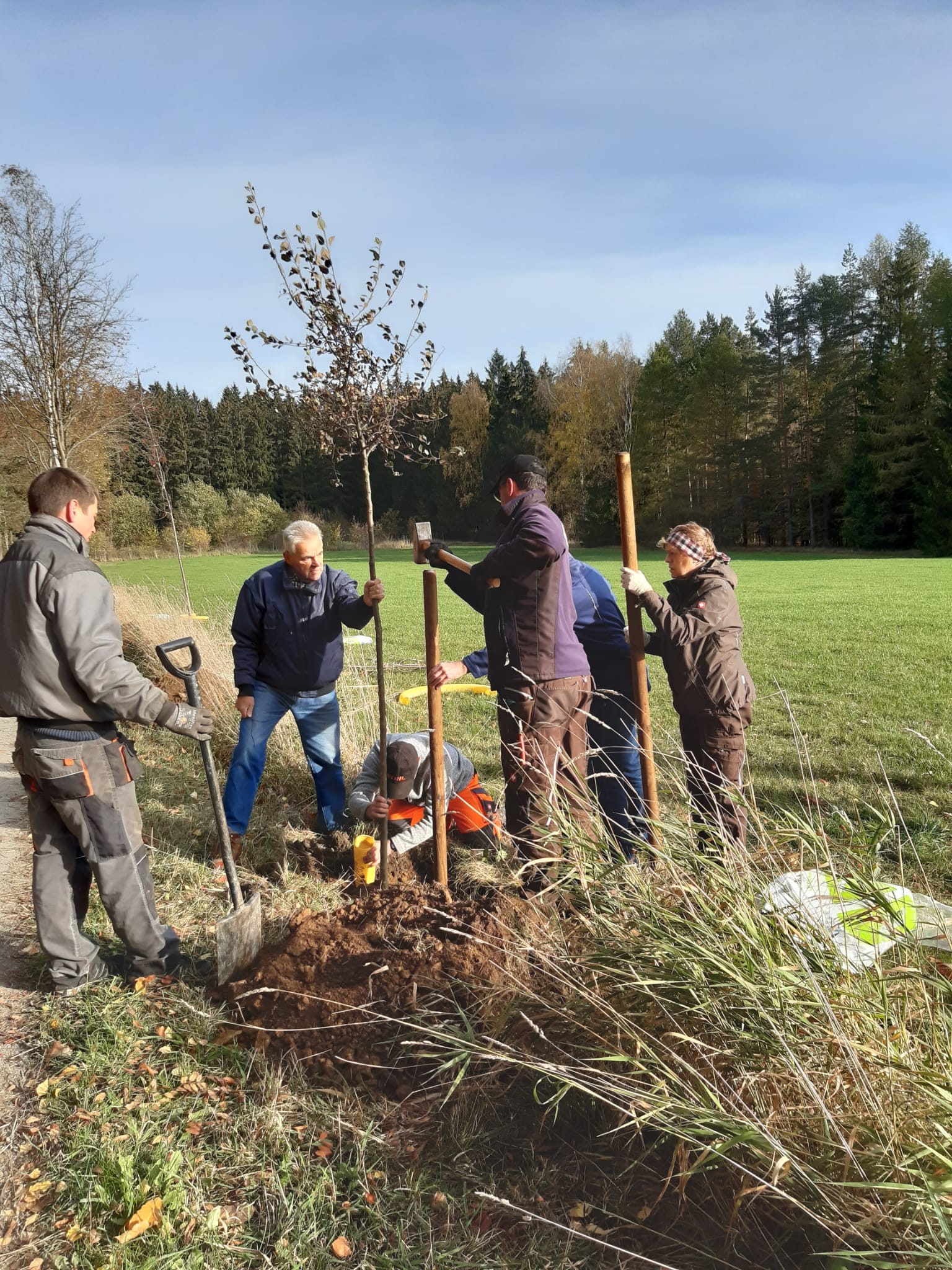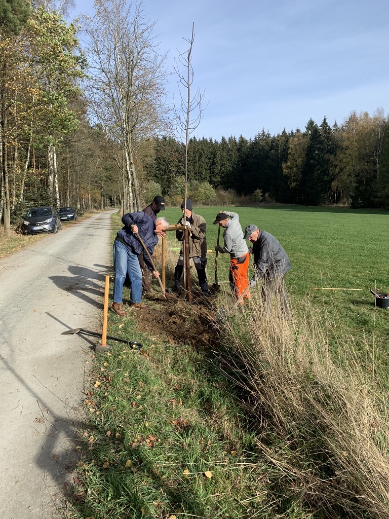 Heimatpflege gehört laut Satzung zu den Aufgaben des Heimatvereins Reumtengrün e.V. An der einst so herrlichen Vogelbeerbaumallee am Fronweg hat im wahrsten Sinn des Wortes der Zahn der Zeit genagt. Viele dieser Bäume wurden bereits entsorgt oder sind am Absterben. Die Heimatfreunde konnten nun dank der finanziellen Unterstützung der Sparkasse Vogtland Bäume und das notwendige Zubehör für neue Pflanzungen kaufen. Vogelbeerbäume wollten und sollten wir nicht mehr pflanzen, obwohl sie symbolisch für das Vogtland sind, da sie nicht so lange halten und mit einer Krankheit zu kämpfen hätten. So haben wir uns beraten lassen und für Wildobstbäume entschieden. Dankbar sind wir für die Hilfe vom Bauhof gewesen. Mit moderner Technik und handwerklichen Können waren die 4 Bäume schnell gepflanzt. Nun heißt es je nach Wetterlage fleißig gießen. So haben wir neben Heimatpflege auch zum Klimaschutz einen Beitrag leisten können.