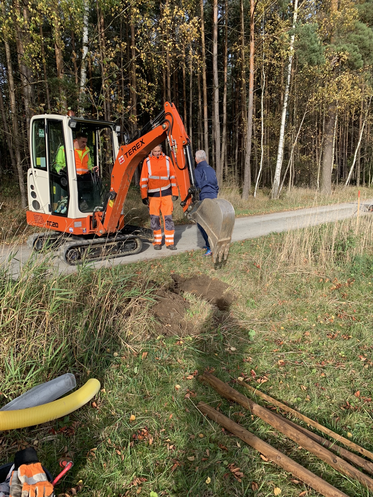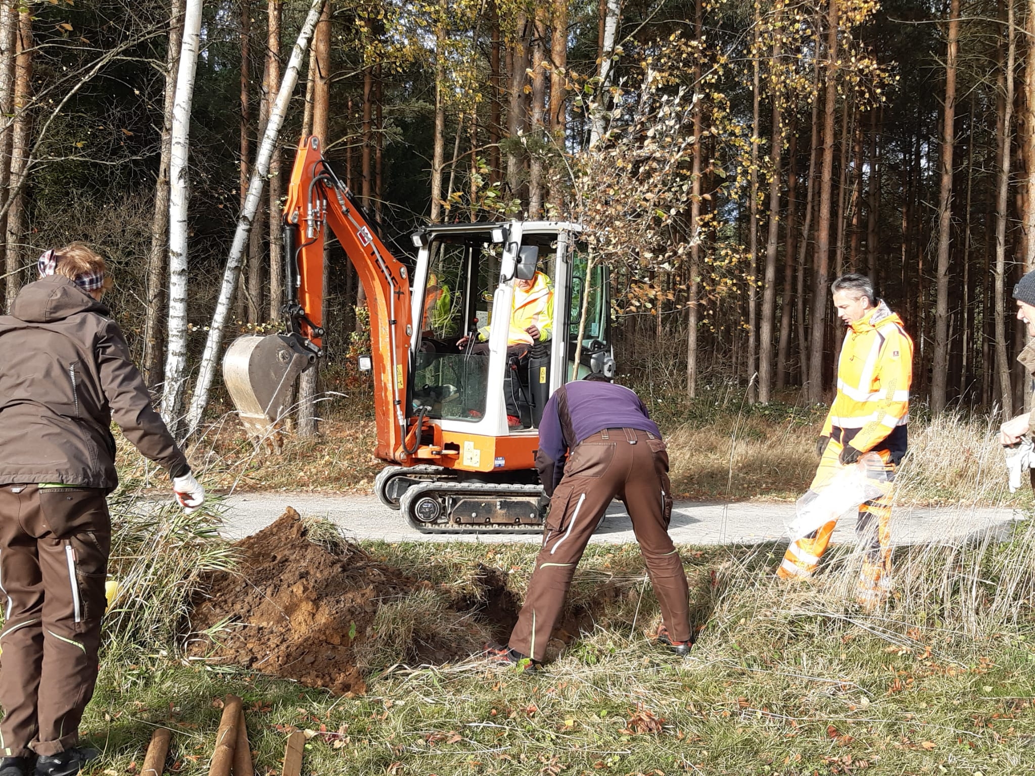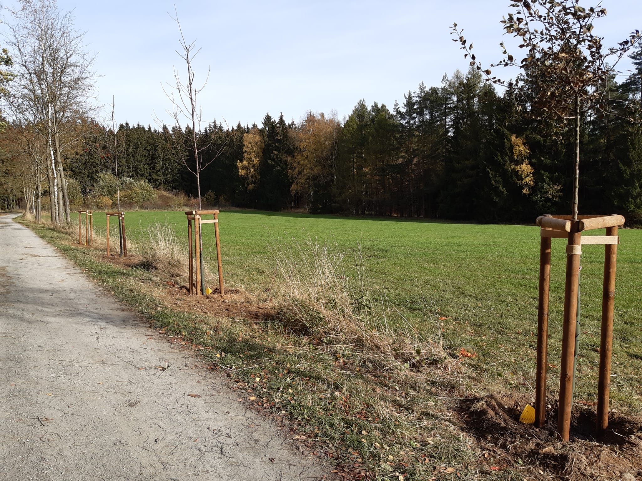 Heimatpflege gehört laut Satzung zu den Aufgaben des Heimatvereins Reumtengrün e.V. An der einst so herrlichen Vogelbeerbaumallee am Fronweg hat im wahrsten Sinn des Wortes der Zahn der Zeit genagt. Viele dieser Bäume wurden bereits entsorgt oder sind am Absterben. Die Heimatfreunde konnten nun dank der finanziellen Unterstützung der Sparkasse Vogtland Bäume und das notwendige Zubehör für neue Pflanzungen kaufen. Vogelbeerbäume wollten und sollten wir nicht mehr pflanzen, obwohl sie symbolisch für das Vogtland sind, da sie nicht so lange halten und mit einer Krankheit zu kämpfen hätten. So haben wir uns beraten lassen und für Wildobstbäume entschieden. Dankbar sind wir für die Hilfe vom Bauhof gewesen. Mit moderner Technik und handwerklichen Können waren die 4 Bäume schnell gepflanzt. Nun heißt es je nach Wetterlage fleißig gießen. So haben wir neben Heimatpflege auch zum Klimaschutz einen Beitrag leisten können.