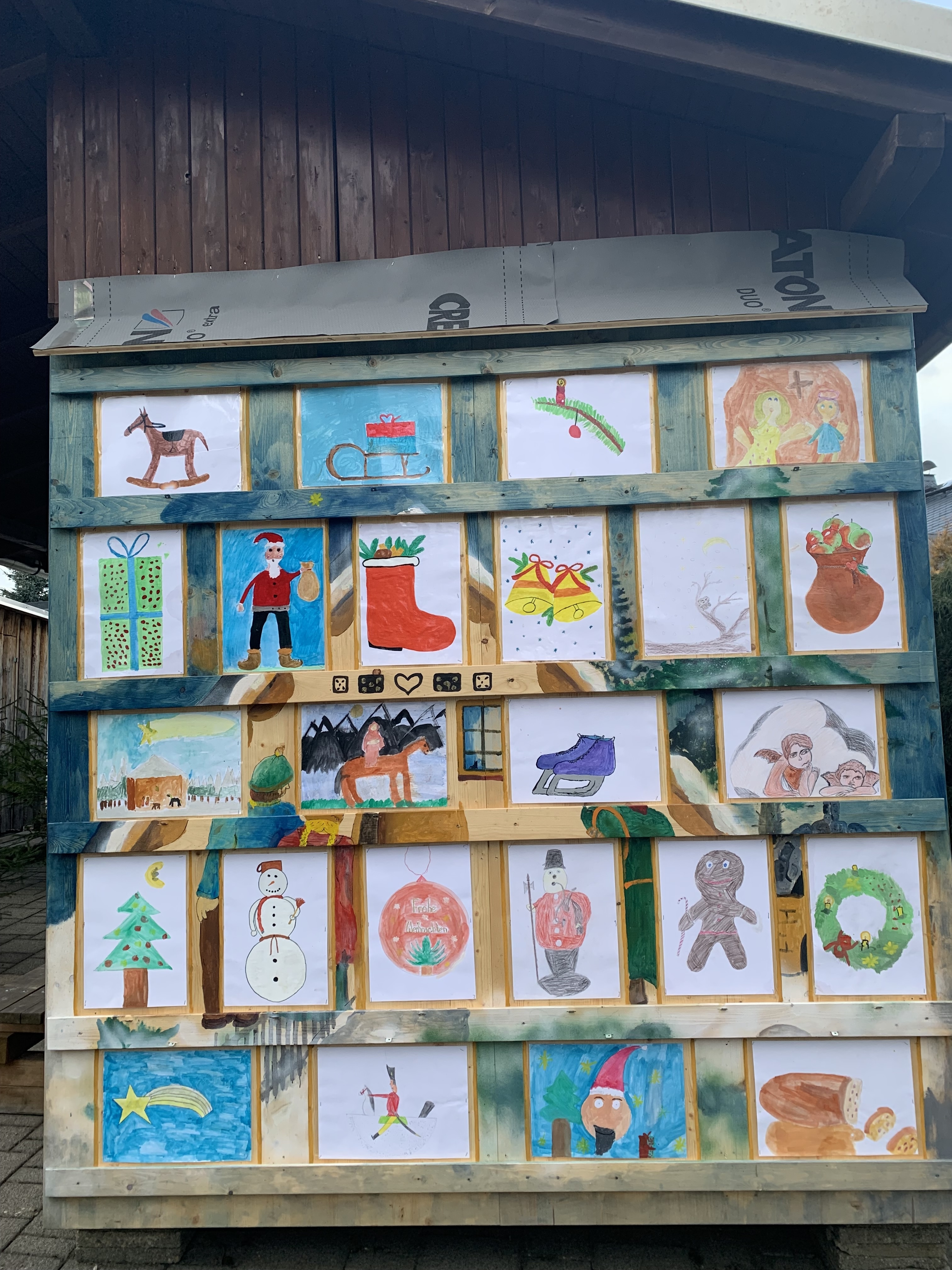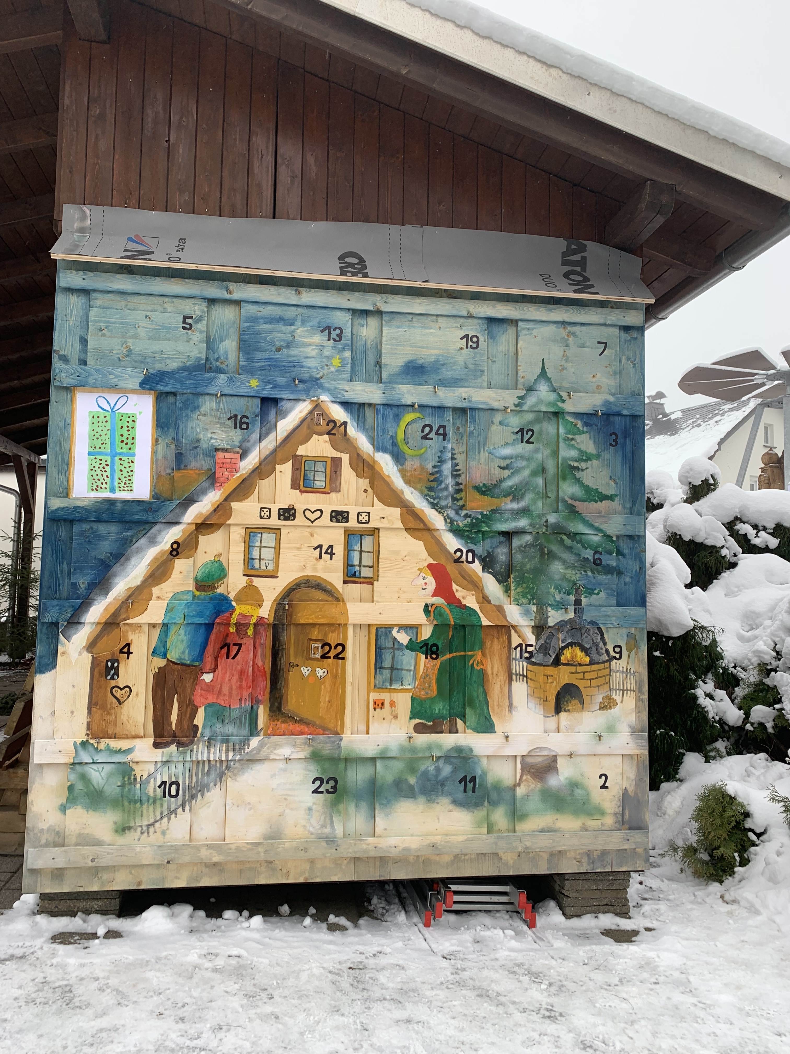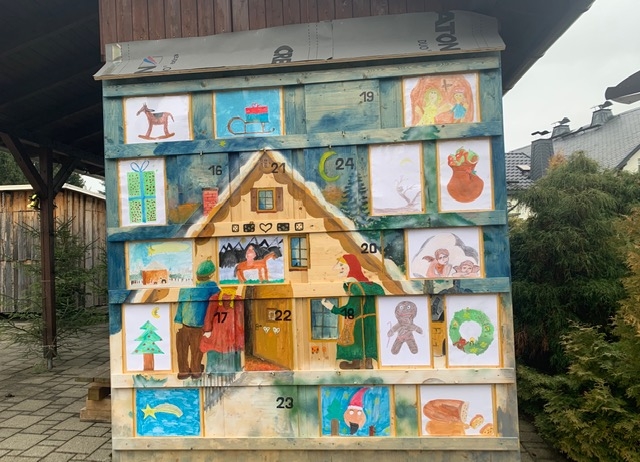 Pünktlich zum 1. Dezember wurde das Geheimnis geliftet. Das Öffnen des ersten Schlosses am Türchen übernahm unser Ortsvorsteher Uwe Ebert. Die 24 Bilder wurden von den Kindern der Grundschule gemalt. Die Kinder des Kindergartens und der Grundschule zeigten jeweils ein kleines Programm.