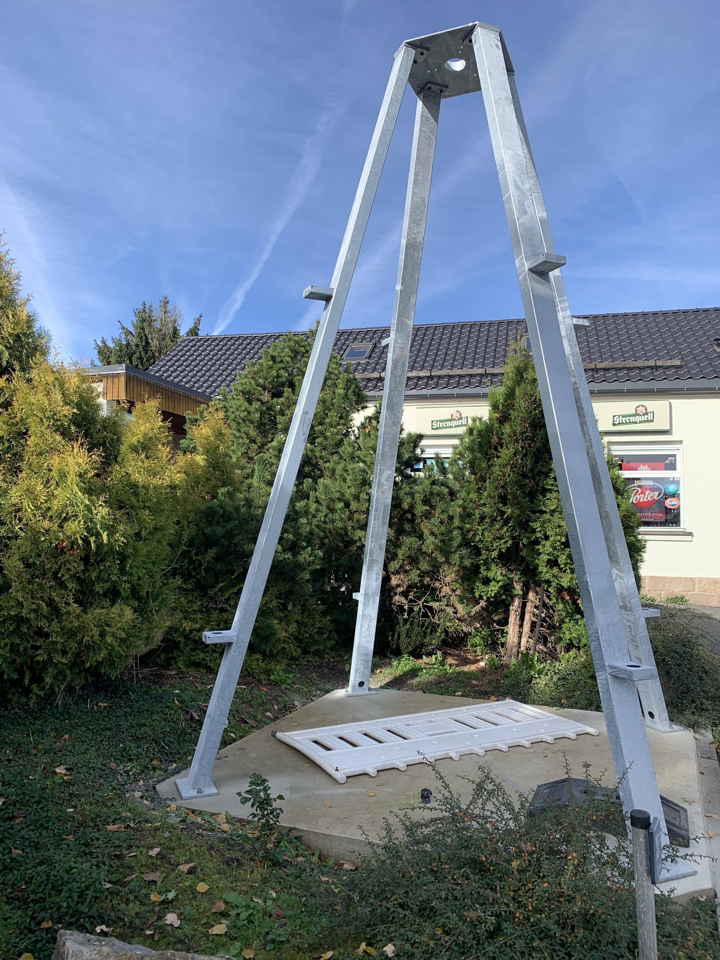 Heute wurde mit den ersten Arbeiten für die Pyramide begonnen. Schlossermeister Gunther Stich und sein Mitarbeiter brachten die verzinkten Metallelemente für das Grundgerüst an. Tatkräftig unterstützt wurden sie mit der notwendigen Technik vom Zimmerermeister Felix Kluge von der gleichnamigen Zimmerei.