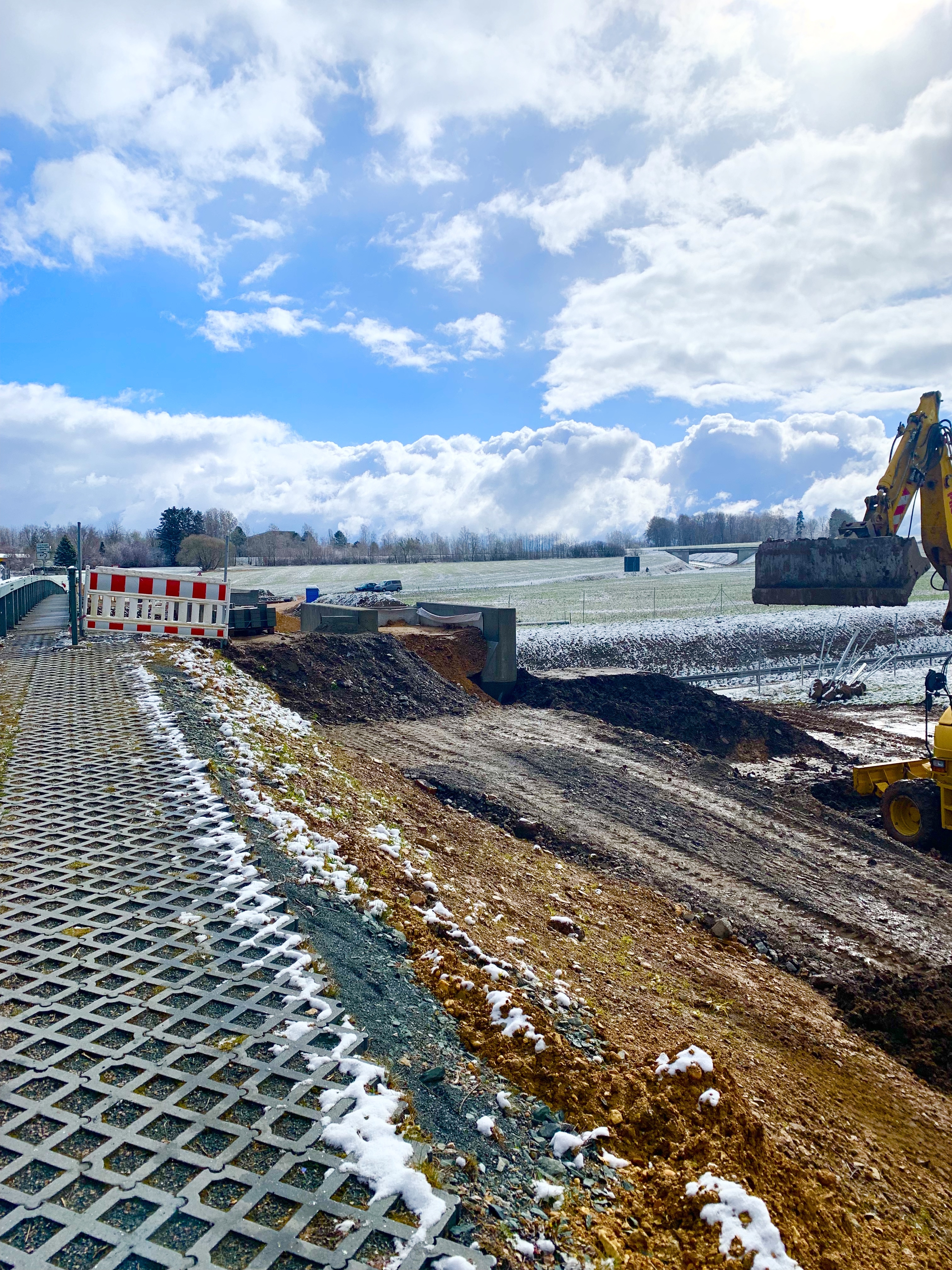 Die beiden Brückenpfeiler stehen. Momentan laufen die Arbeiten am Fuß-Radweg. Am Mittwoch und Donnerstag wird die neue Brücke aufgesetzt. Die notwendigen Einschränkungen für den Verkehr wurden in der Presse angekündigt.