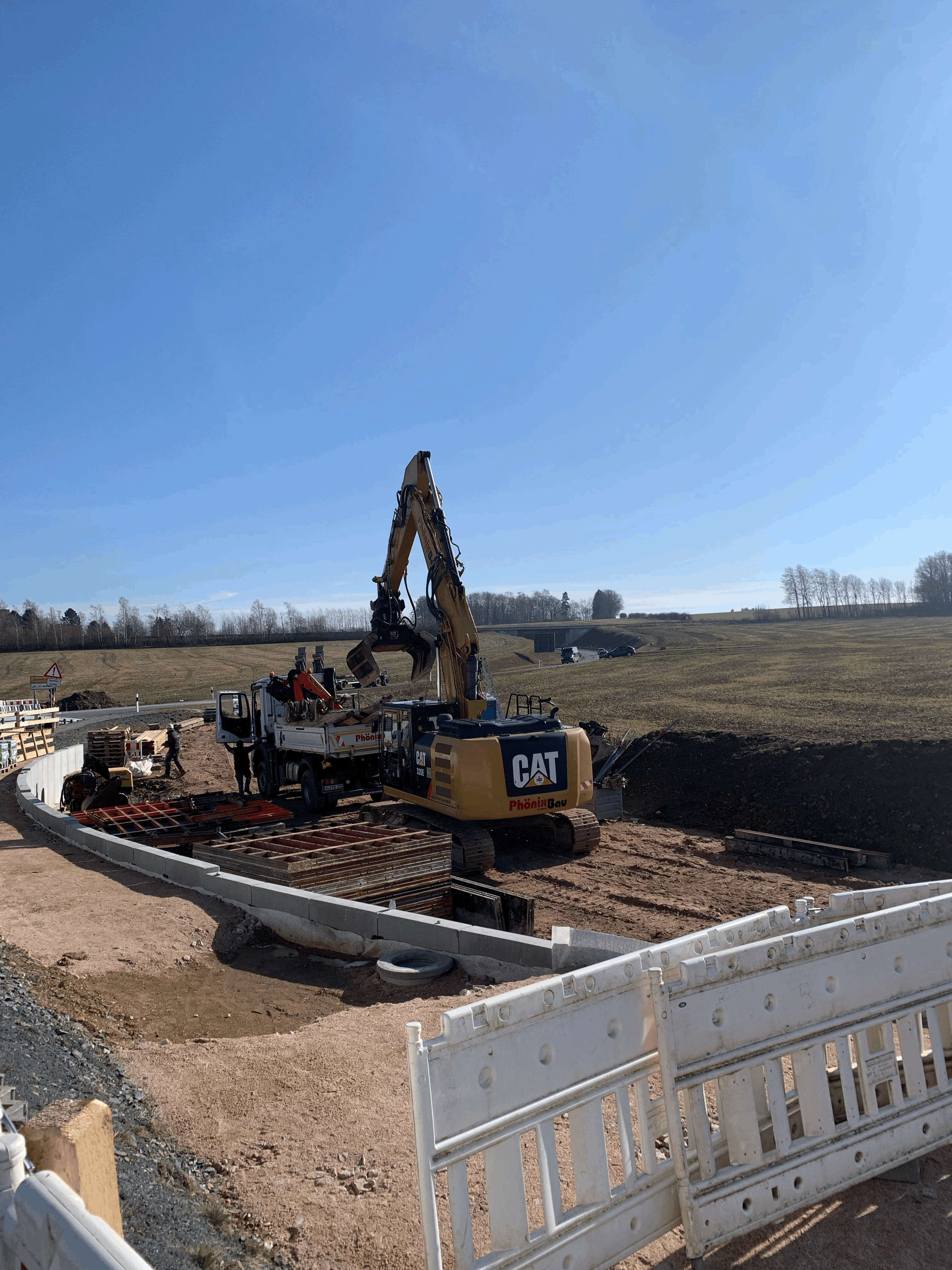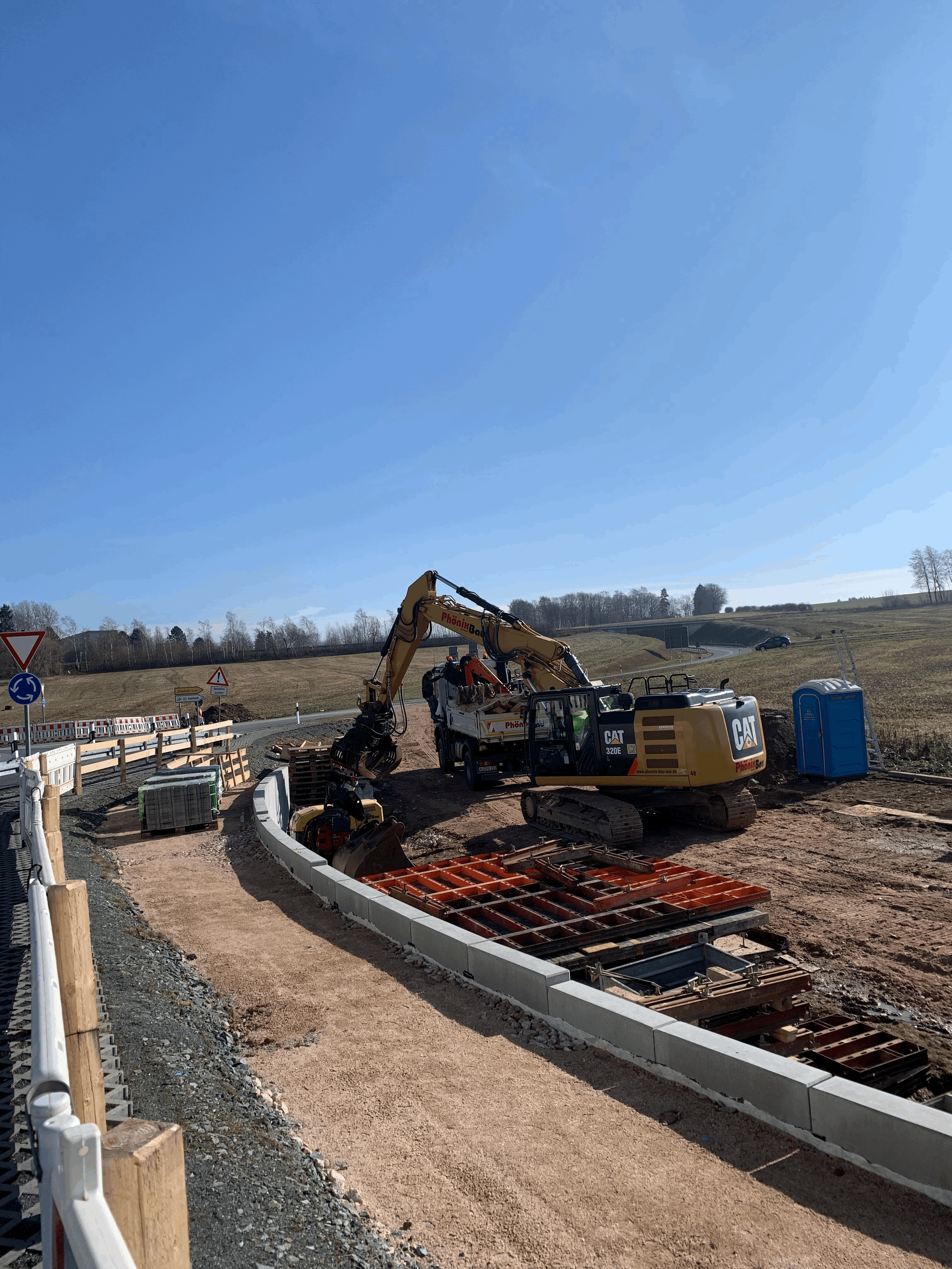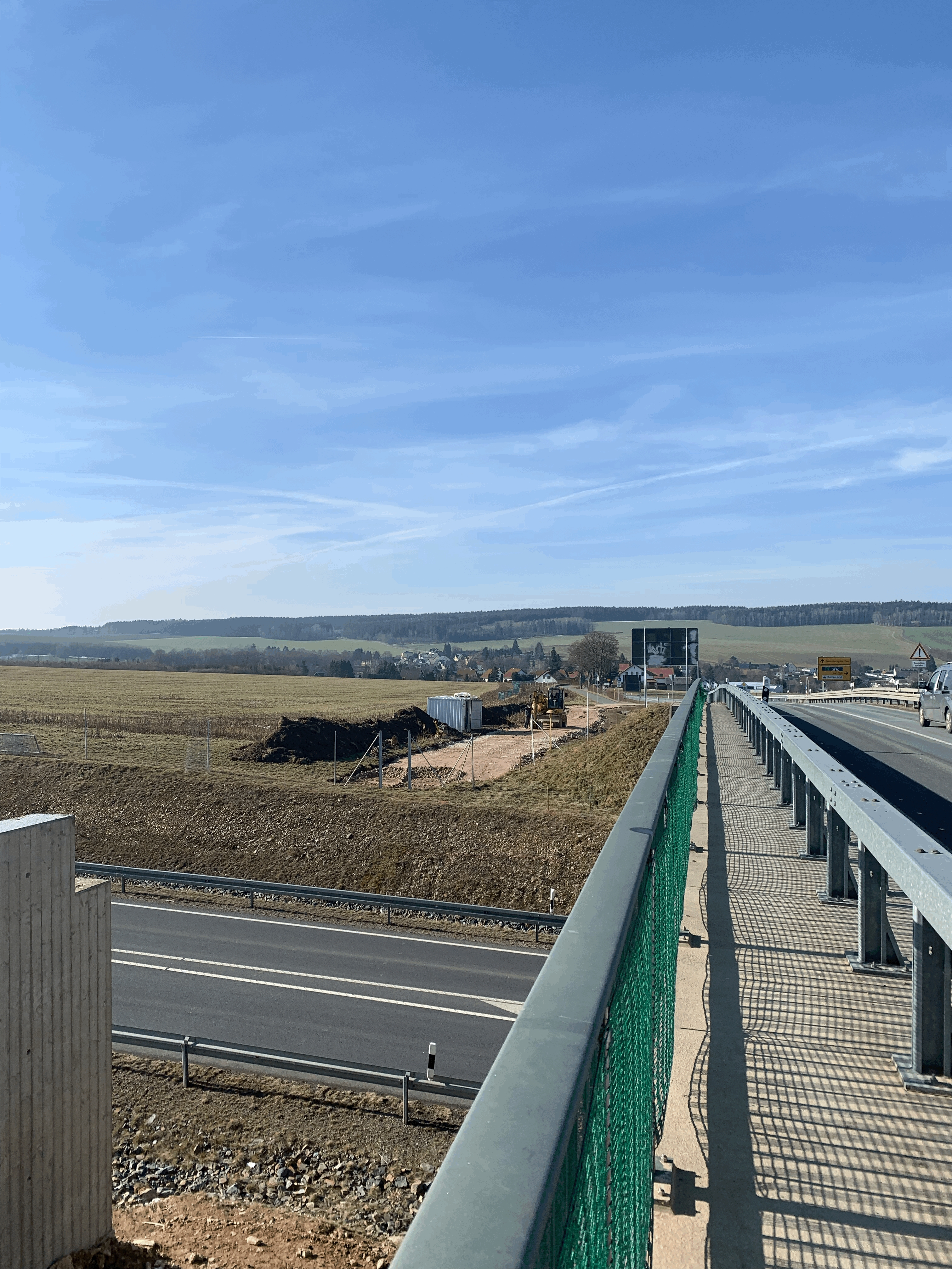Die Arbeiten an der Brücke über die B 169 mussten durch den Wintereinbruch unterbrochen werden. Immerhin konnte der erste Brückenpfeiler gegossen werden. Die Arbeiten werden diese Woche fortgesetzt. Die Schalung wurde entfernt und die Baustelle wird auf der Seite nach Auerbach beräumt. Weiter gehen die Bauarbeiten demnächst auf der anderen Straßenseite. Vorarbeiten für die benötigte Baustraße wurden bereits begonnen.