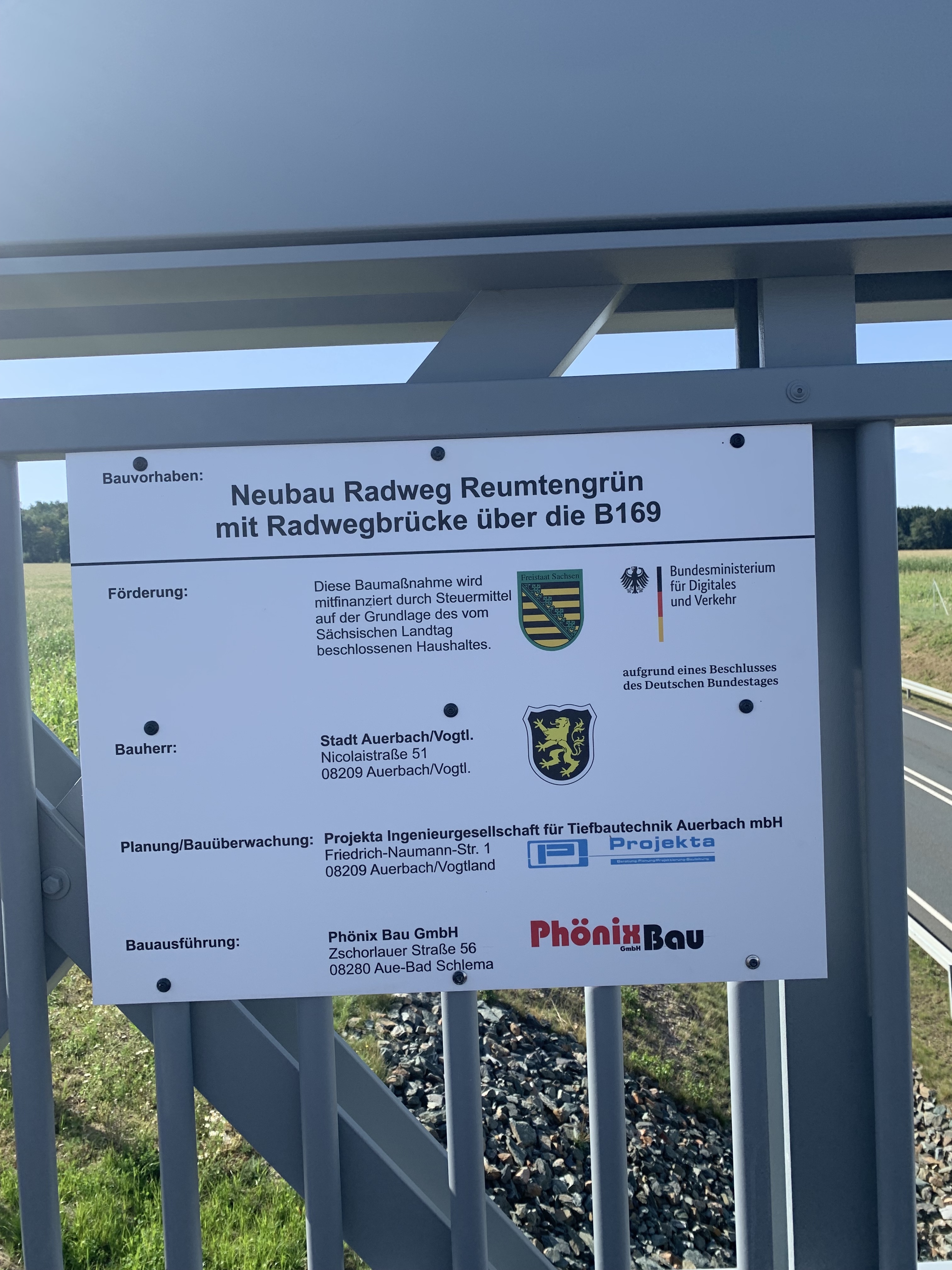 Heute, am 24. August 2023, wurde an der Richardshöhe zu einem langersehnten Ereignis eingeladen. Nach zähem Ringen und Bangen konnte die Fuß - und Radwegbrücke über die B 169 feierlich übergeben werden. Neben vielen interessierten Bürgern nahmen der OV von Reumtengrün Uwe Ebert, je ein Vertreter des Lasuv, der Baufirma Phönix – Bau GmbH, dem Projektionsbüro Projekta, der OB der Stadt Auerbach Jens Scharff, und als Vertreter des Landrates Lars Beck teil. Eröffnet wurden die Feierlichkeiten mit einem Programm unseres Kindergartens. Der OV Uwe Ebert und OB Jens Scharff hielten jeweils eine kurze Ansprache. Laut OB soll die Brücke, welche aus GFK besteht, 50 Jahre wartungsfrei sein. Wer wollte, konnte sich noch einen Imbiss der Fleischerei Strangfeld gönnen.