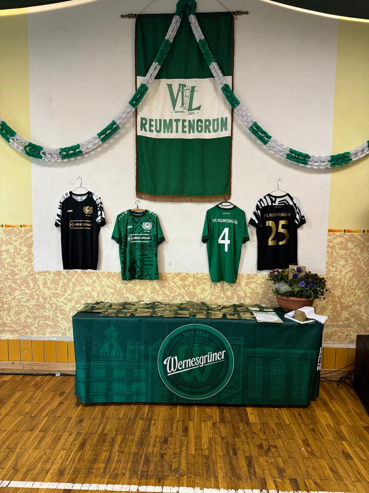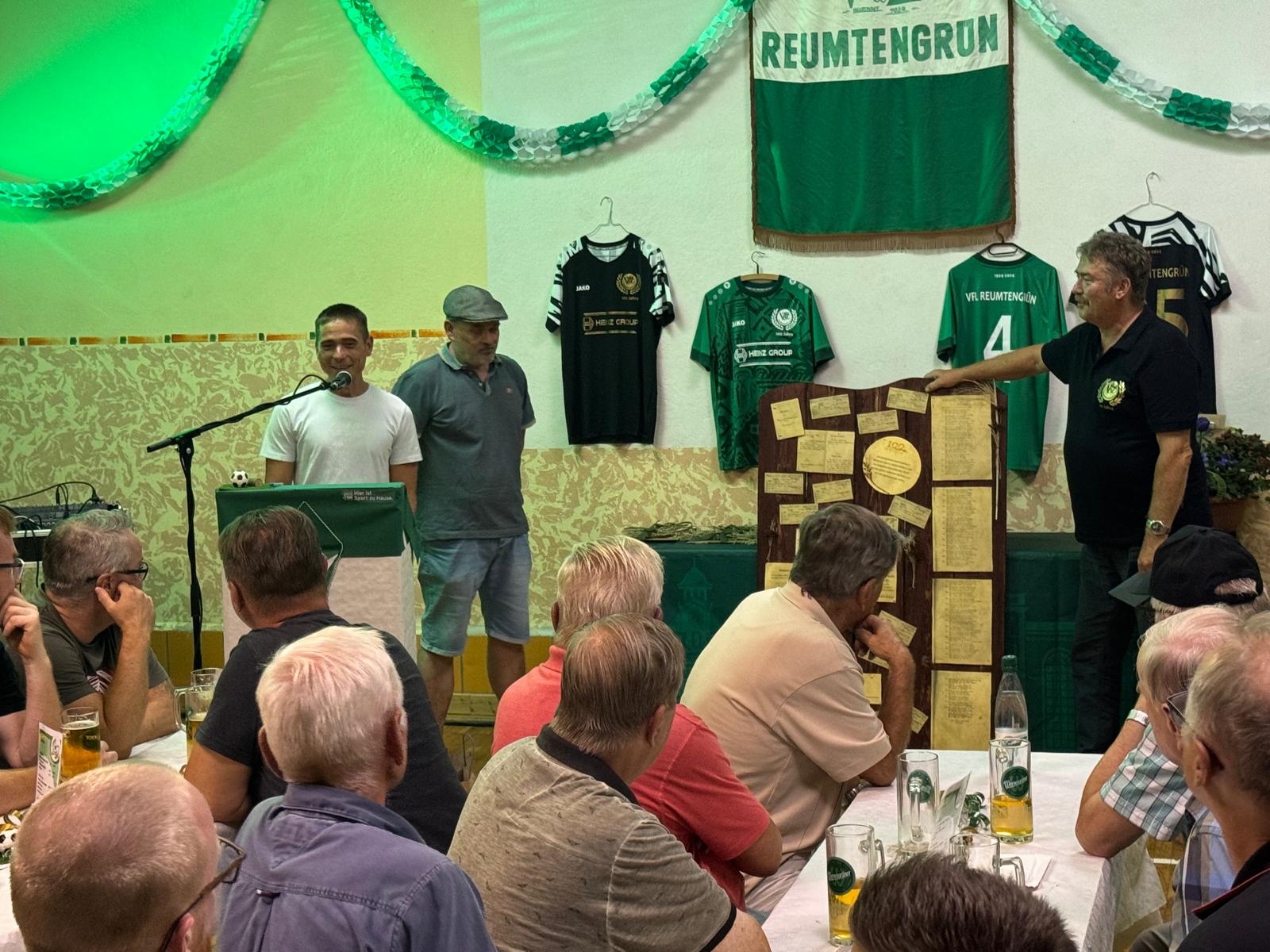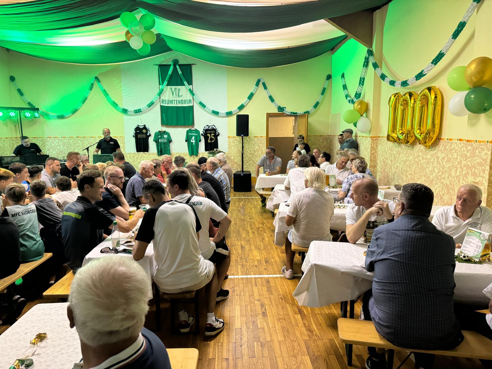 Vor 100 Jahren wurde der VfL Reumtengrün gegründet. Dies war ein würdiger Anlass, um dieses Jubiläum vom 6. - 8. September zu feiern. Die Vorbereitungen verlangten von den Beteiligten viel Zeit, Ideen und Ausdauer. Eindrucksvoll war die Ausstellung zur Historie des Vereins im Stammlokal des VfL. Der Einladung ist eine Jugendmannschaft unserer Partnergemeinde in Svoboda gefolgt. Der Freitag war neben einem Fussballspiel der Festveranstaltung vorbehalten. Nach der Begrüßung gab der Abteilungsleiter Fußball, Uwe Ebert, einen zeitlichen Überblick über viele Ereignisse in der 100jährigen Geschichte des Vereins. Der Verein hatte 1924 sein Domizil im Wald, am sogenannten Alten Feld. Nach der Wende konnte das Gebäude erweitert und ein Ausweichsportplatz geschaffen werden. Möglich war dies alles durch Sponsoren, Fördermitteln, Zuschüssen von der Stadt und dem unermüdlichen Wirken vieler ehrenamtlicher Mitglieder des Vereins. Dies war ein Grund diese "stillen Helfer " zu ehren. Von verschieden Verbänden und Vereinen wurden Glückwünsche überbracht.