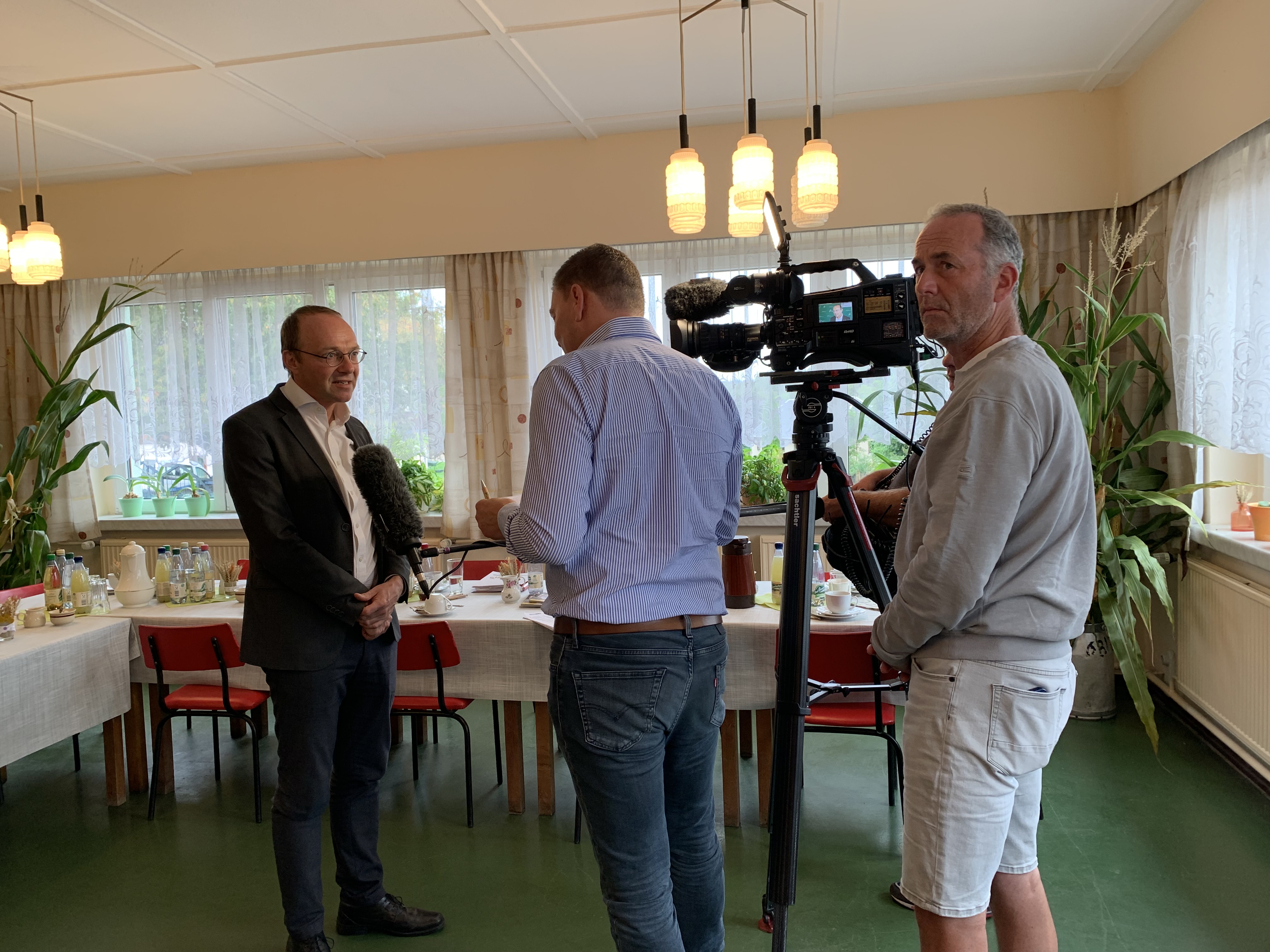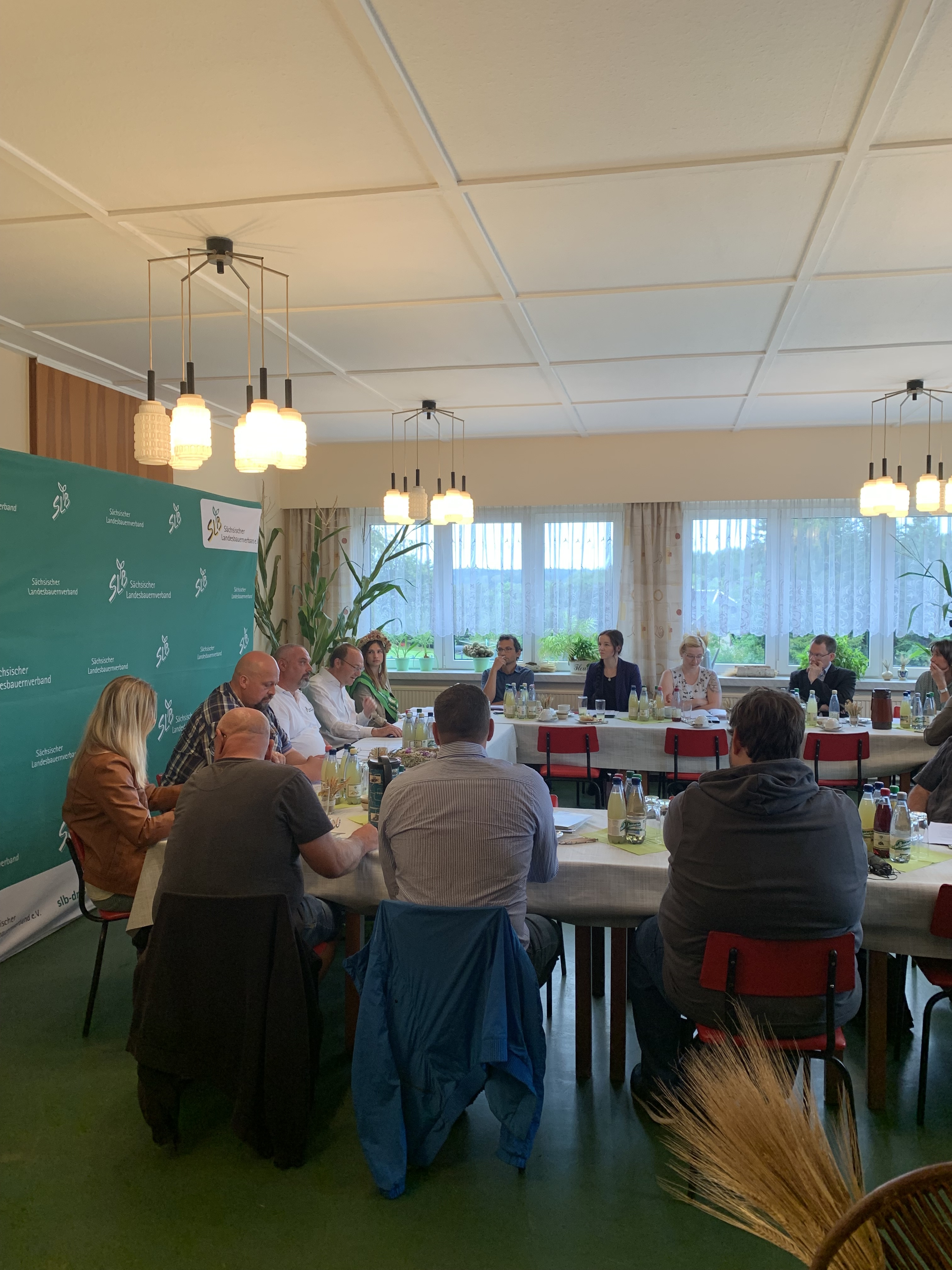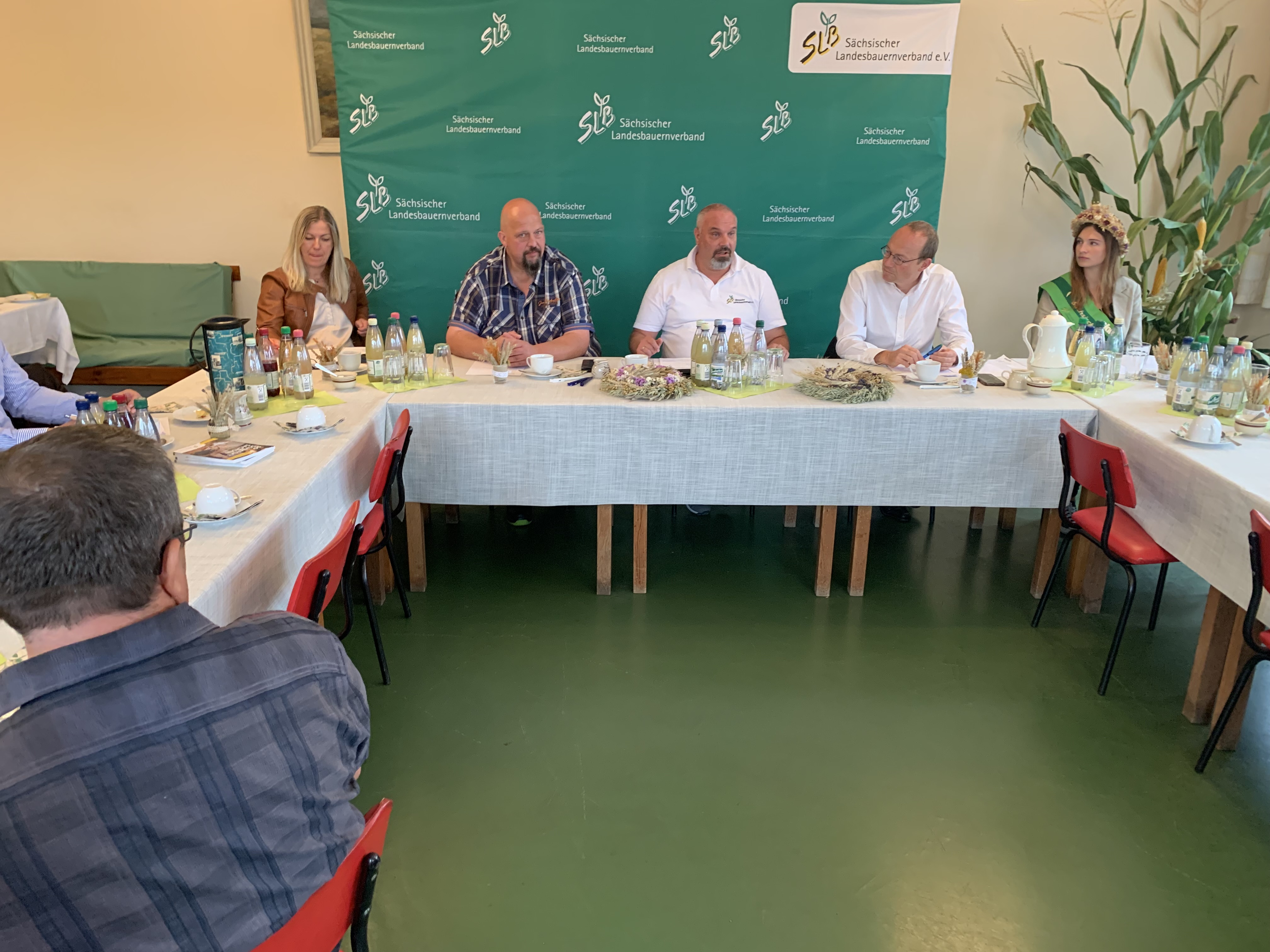 Große Aufregung in der Treba Agrar GmbH. Hier fand 2024 die Erntepressekonferenz des Sächsischen Landesbauernverbandes e.V. statt. Auf der einen Seite ist dies zwar eine große Ehre, aber mit vielen Vorbereitungen verbunden. Neben der täglichen Arbeit, musste die Organisation für das Treffen laufen. Es wurden 25 - 30 Teilnehmer angekündigt, einschließlich der Erntekönigin. Mit Vorbereitungen für die Dekoration wurde bereits viele Tage vorher begonnen. Es hat sich gelohnt, alle Gäste waren sehr beeindruckt. Neben Mitgliedern des Bauernverbandes hatten sich Mitarbeiter verschiedener Medien - bis hin zum Sachsenspiegel - angemeldet. Ehrengast sollte der für die Landwirtschaft zuständige Minister Wolfram Günther sein. Bis zuletzt war nicht sicher, ob er wirklich teilnehmen würde. Eröffnet wurde die Veranstaltung von Torsten Krawczyk, dem Vorsitzenden des Landesbauernverbandes. Er stellte die Erntebilanz 2024 vor und ging auf Probleme, Sorgen und Wünsche der Landwirte ein. Mario Grünert, der Geschäftsführer der Treba Agrar GmbH, gab einen Überblick über die Verhältnisse der Firma, was die Situation der Arbeitskräfte, Flächenbewirtschaftung, der Technik und Gebäude betrifft. Wolfram Günther schloss sich den Ausführungen des Landesbauernverbandes an. Die Vertreter der Presse hatten anschließend die Möglichkeit, ihre Fragen zu stellen. Nach der Pressekonferenz in Reumtengrün wurde die Getreidehalle in Dorfstadt besucht.