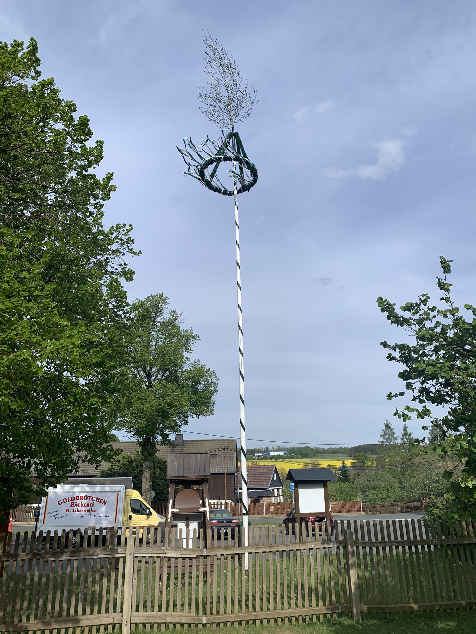 Wie immer wurde der Maibaum von den starken Reumtengrüner Männern hochgehievt. Der Mast wurde von der Jugend des Heimatvereins neu gestrichen und von den Senioren der Kranz geschmückt.