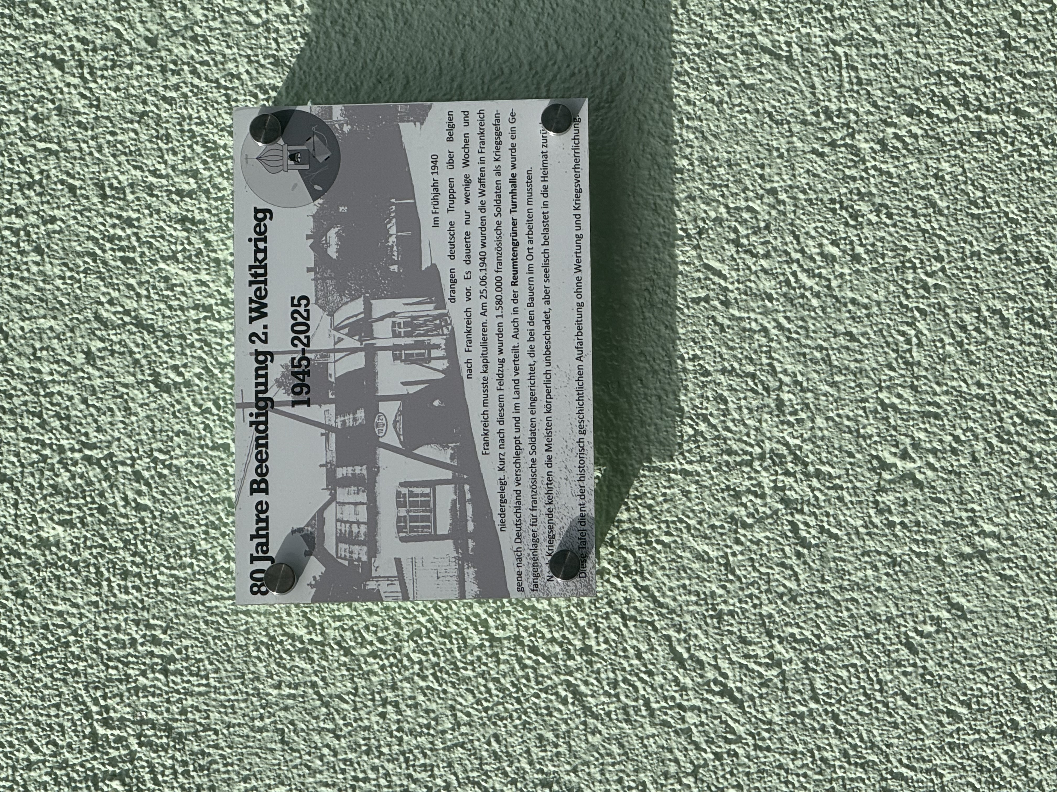 Mit der neuen Tafel an der Turnhalle des VfL wurden 80 Jahre Ende des 2. Weltkrieges gedacht. In der Turnhalle lebten ca. 20 französische Kriegsgefangene. Sie wurden größtenteils Bauern zugeteilt und halfen dort tagsüber. Am Abend mussten sie sich wieder in der Turnhalle melden.