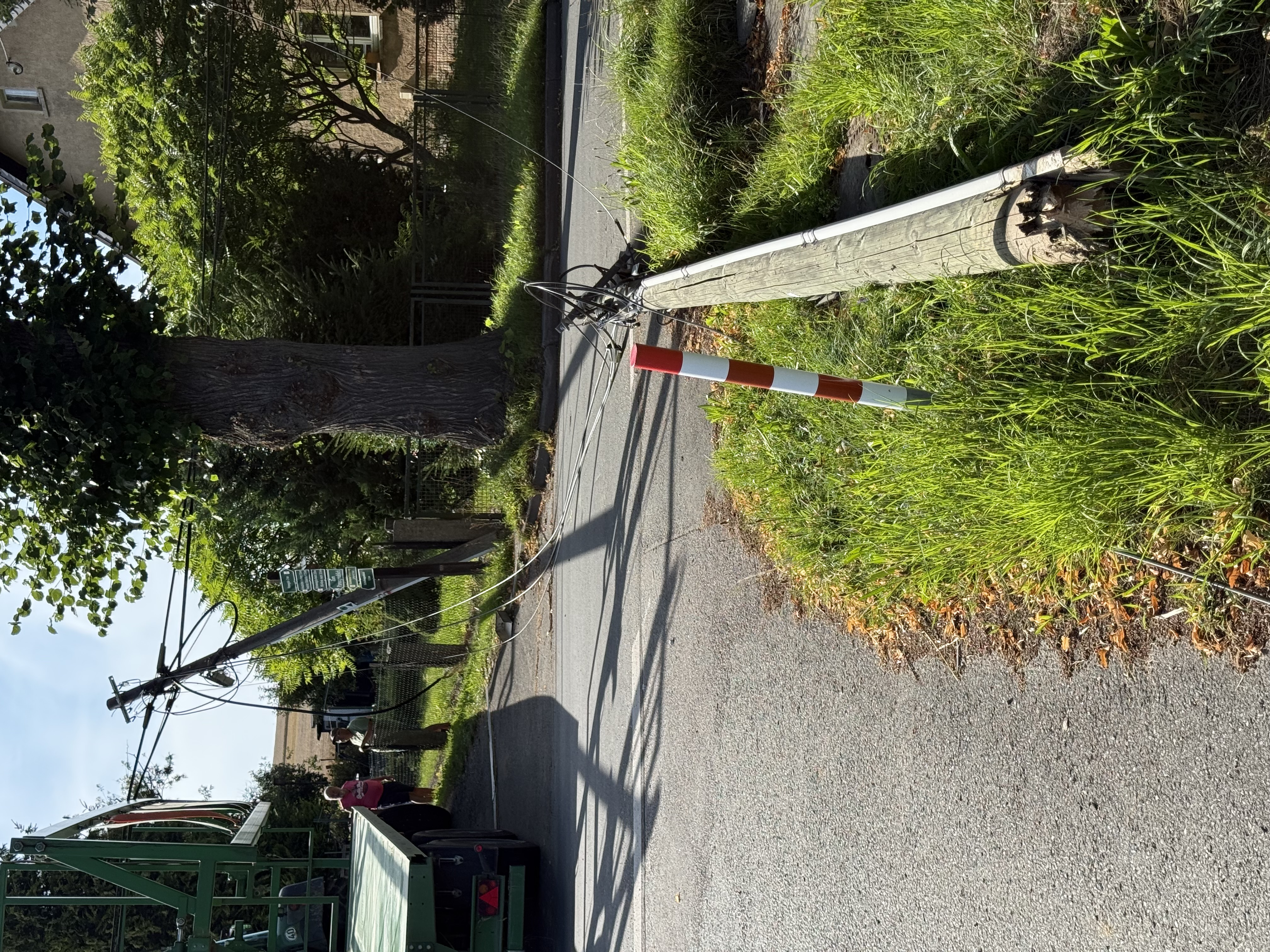 Am 7. August gegen 17:00 Uhr wurden die Kabel, welche über den Winkelmann's Weg hängen beschädigt. Die Ursache ist, dass die Kabel zu tief hängen. Der Traktor mit dem Strohanhänger ist an diesem Tag bereits mehrmals den Weg hoch gefahren. Wahrscheinlich haben sie sich durch die Hitze noch mehr abgesenkt. Das Ergebnis sind: zerrissenen Kabel, ein Mast ist umgefallen, einer stand sehr schräg, die betroffenen Anlieger sind von der digitalen Welt abgeschnitten. Am 15. August wollte die Telekom zu Reparaturarbeiten anrücken. Die Betonung liegt auf "wollte". Da merkt am erstmal, wie wir von der Technik abhängig sind.