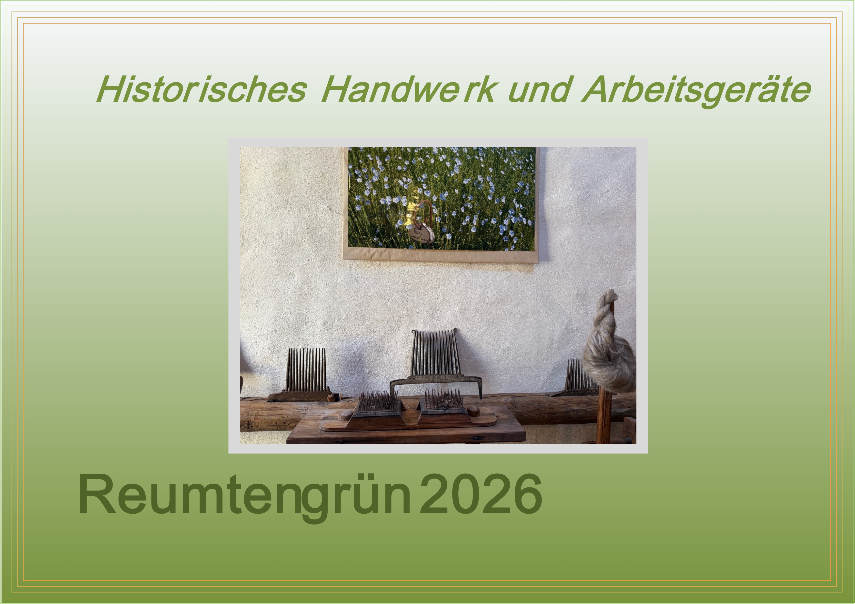 Für 2026 wurde bereits der 8. historische Kalender von Reumtengrün angefertigt. Das Thema lautet: „Historisches Handwerk und Arbeitsgeräte“. Viele Handwerksberufe sind in Vergessenheit geraten oder nicht bekannt. Ausgestorbene Handwerke mit den dazugehörigen historischen Arbeitsgeräten werden im Kalender beschrieben. Wer weiß was ein Zeidler ist? Wem ist bekannt, dass früher in Reumtengrün auch Lein angebaut wurde? Viele alte Unterlagen sind durchstöbert worden, um Interessantes und Wissenswertes zu finden. Diesmal wurde auch in Museums nach geeigneten Utensilien gesucht, da vieles bei uns nicht mehr auffindbar ist. Der Kalender ist bei Christine Winkelmann (03744 223268) ab sofort erhältlich.