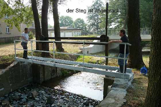 Über die Treba wurde am Wehr die Metallkonstruktion für den Steg angebracht.
