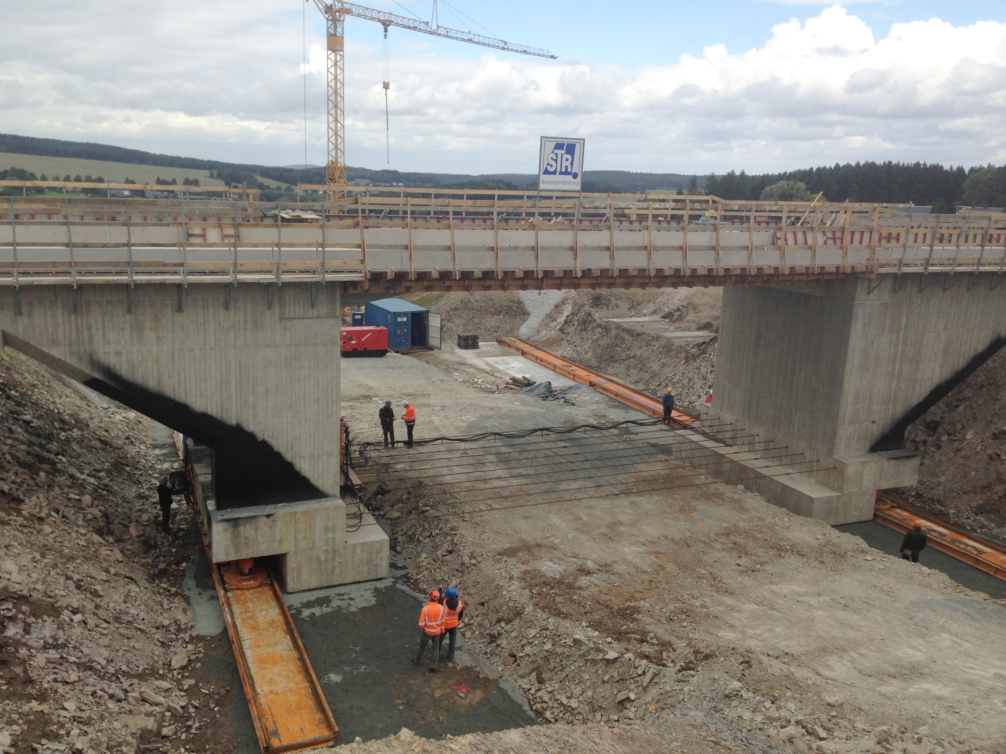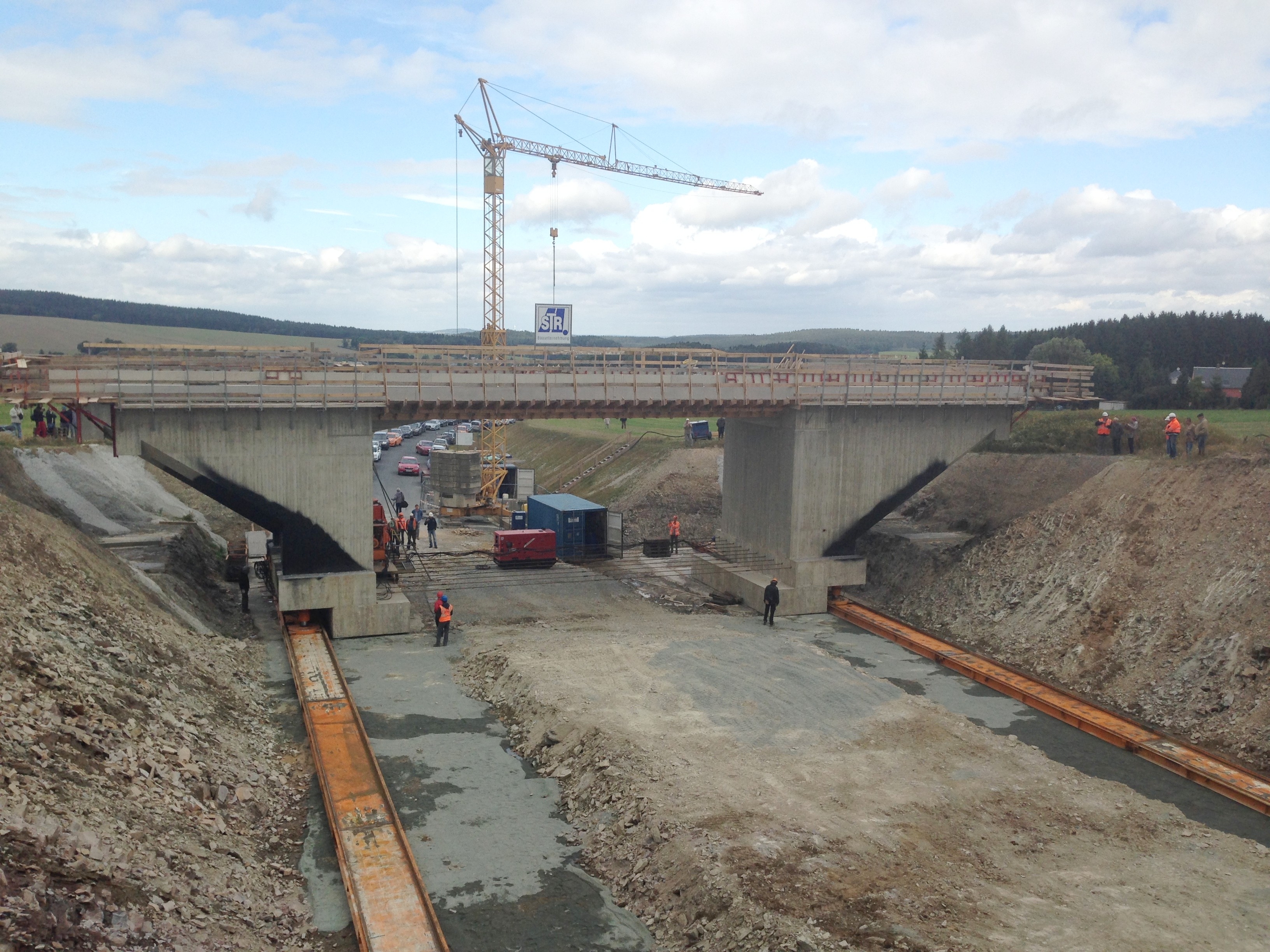 Für Montag, den 12. September gegen 12.00 Uhr wurde das Verschieben der Brücke an der neuen Götzschtalumgehung angekündigt. Da es für viele Bürger ein einmaliges Ereignis bleiben wird, verfolgten etwa 300 - 400 Zuschauer das Schauspiel technischer Meisterleistung. Für uns Reumtengrüner war es von besonderem Interesse, da dies auf unserer Flur geschah. Der rund 1500 Tonnen schwere Betonklotz wurde etwa 26 m in Richtung Auerbach verschoben. Die technische Meisterleistung dauerte kaum länger als 30 Minuten an. Damit ist die Verbindung für die Eisenbahnlinie zwischen Falkenstein und Herlasgrün gegeben. Die endgültige Freigabe der Bahnlinie wird allerdings noch einige Wochen dauern.