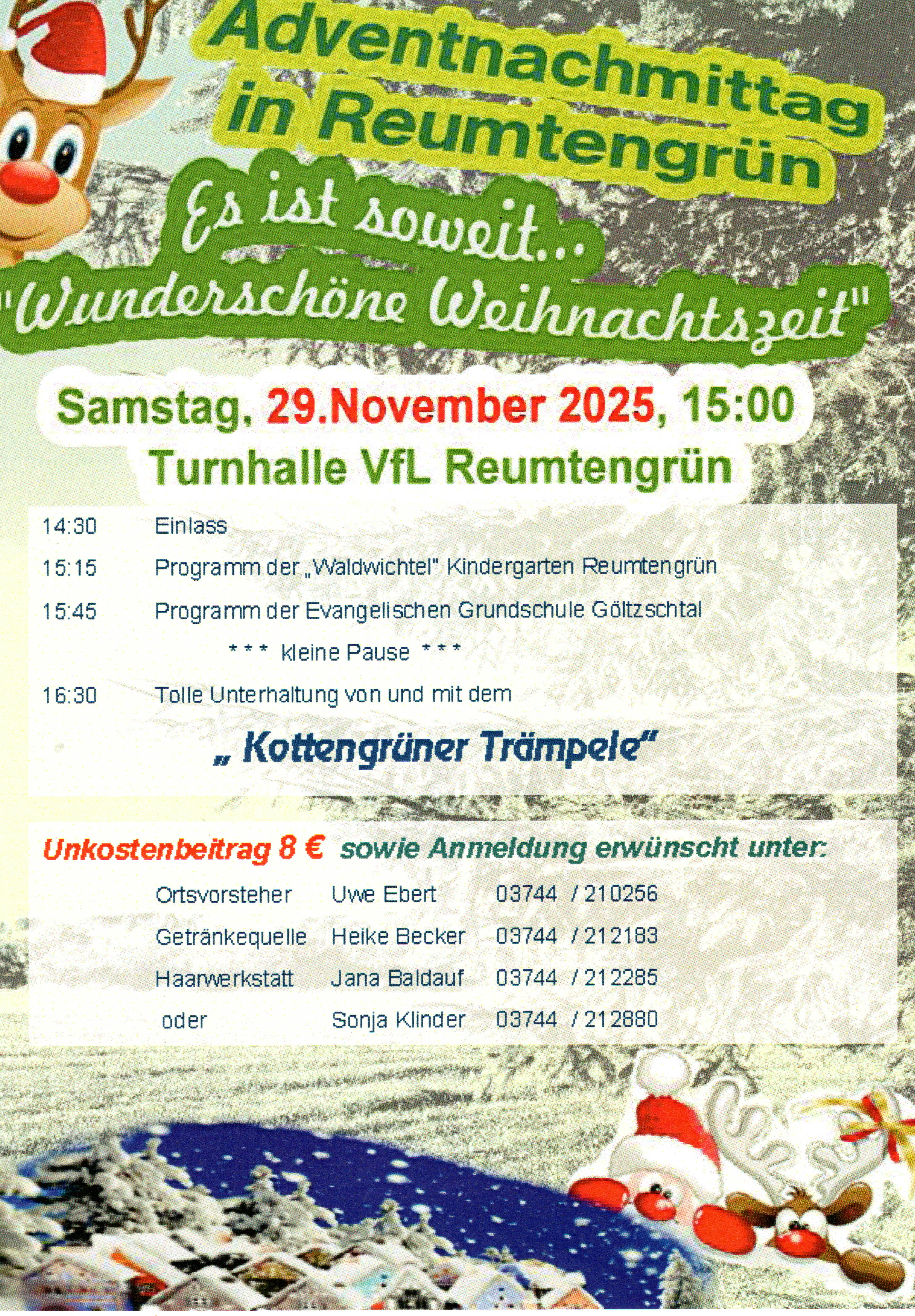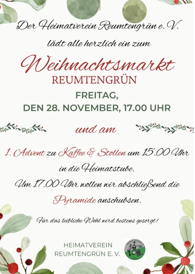 Am 1. Dezember öffnete eine Schülerin der Reumtengrüner Grundschule das 1. Türchen am Adventskalender. Diesem Ereignis wohnten die Kinder des Kindergartens und der Schule bei. Der Ortsvorsteher hielt eine kleine Ansprache und die Kinder sangen gemeinsam ein Weihnachtslied.